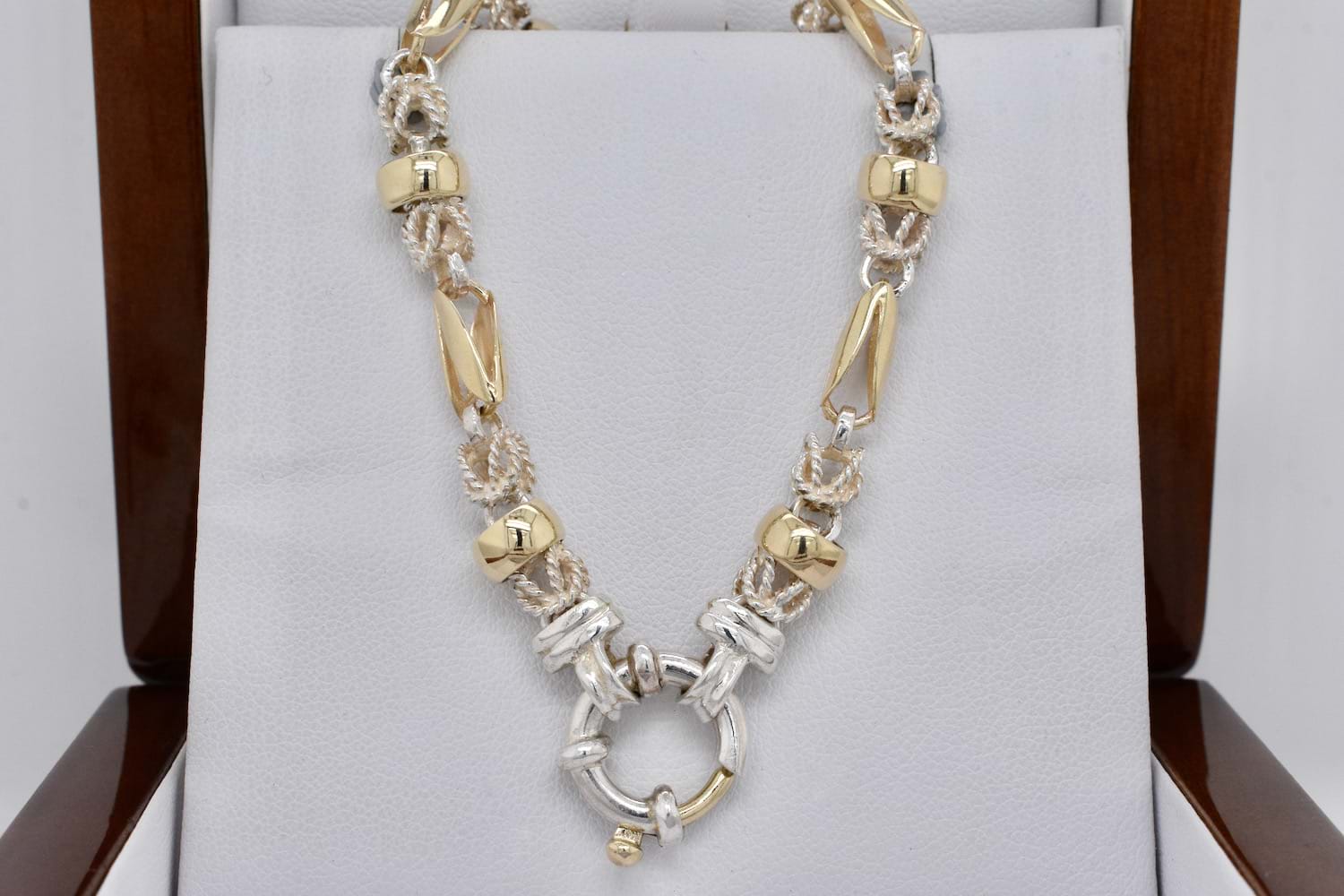 A pretty two tone bracelet crafted in both 9ct yellow gold and sterling silver with a combination of tulip, belcher and knot links with end finials and a boltring clasp. Length: 18.5cm.