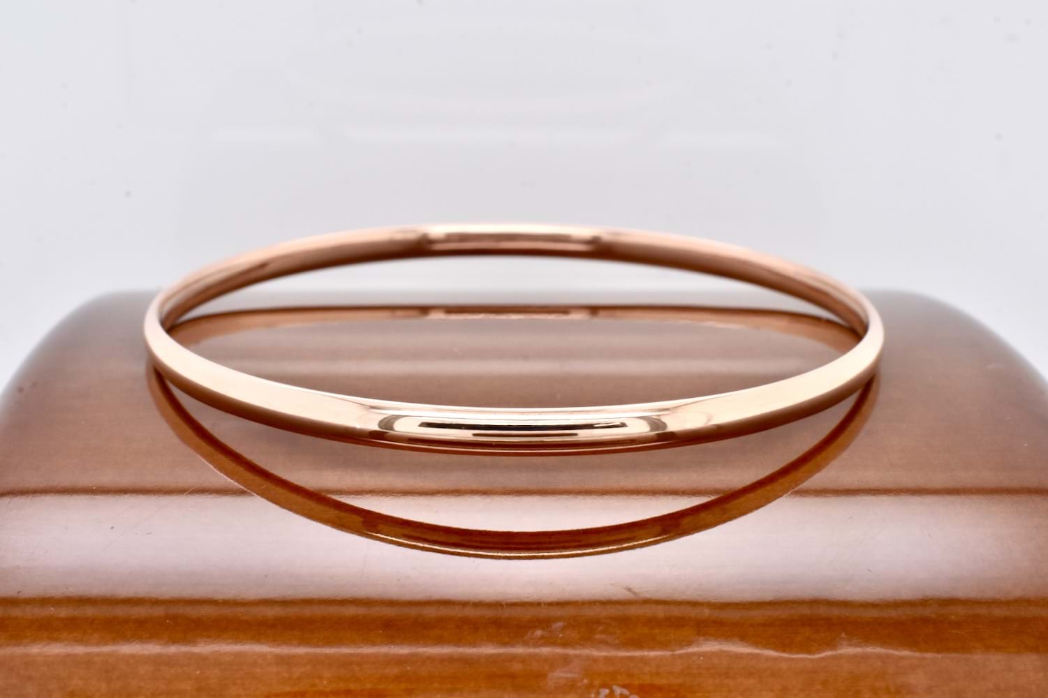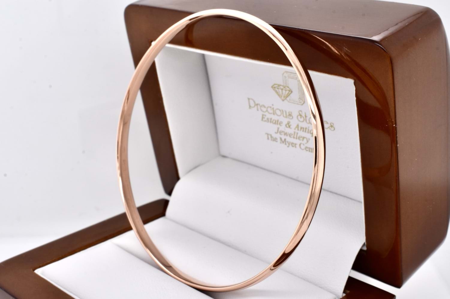 A classic and timeless jewellery collection staple, this solid, round bangle has been handmade in 9ct rose gold with a half round profile and very comfortable soft curve to the inside. Bangle is hand size 62mm and 4mm wide with a weight of 10.73 grams