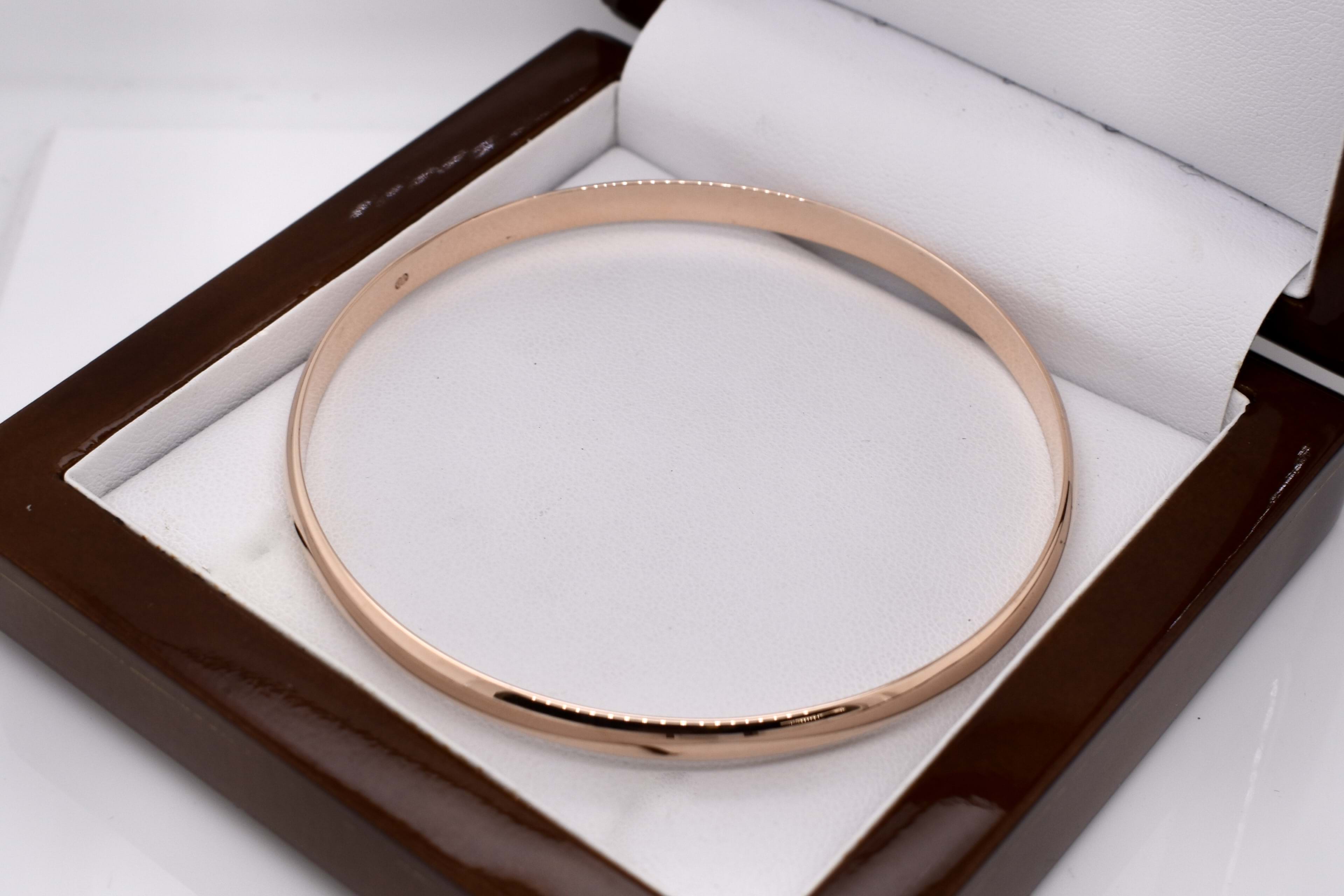 A classic and timeless jewellery collection staple, this handmade solid, round bangle has been crafted in 9ct rose gold with a half round profile. Bangle is hand size 66mm and 5mm wide, with a weight of 15.43grams.