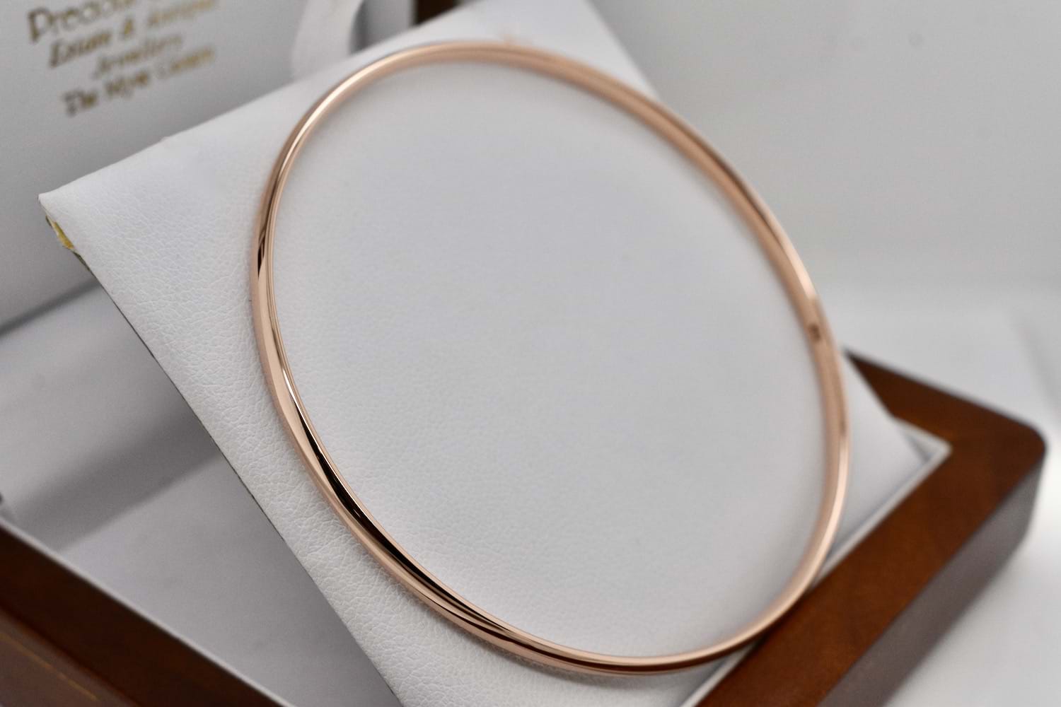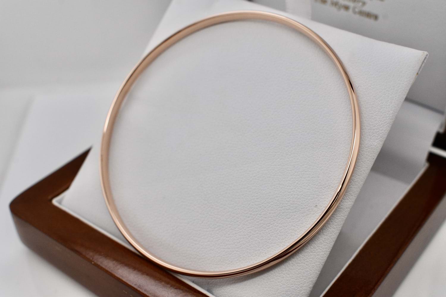 Handmade in 9ct rose gold this bangle is a half round comfort profile measuring 3.5mm wide and 64mm round internal fit. Weight: 11.17grams