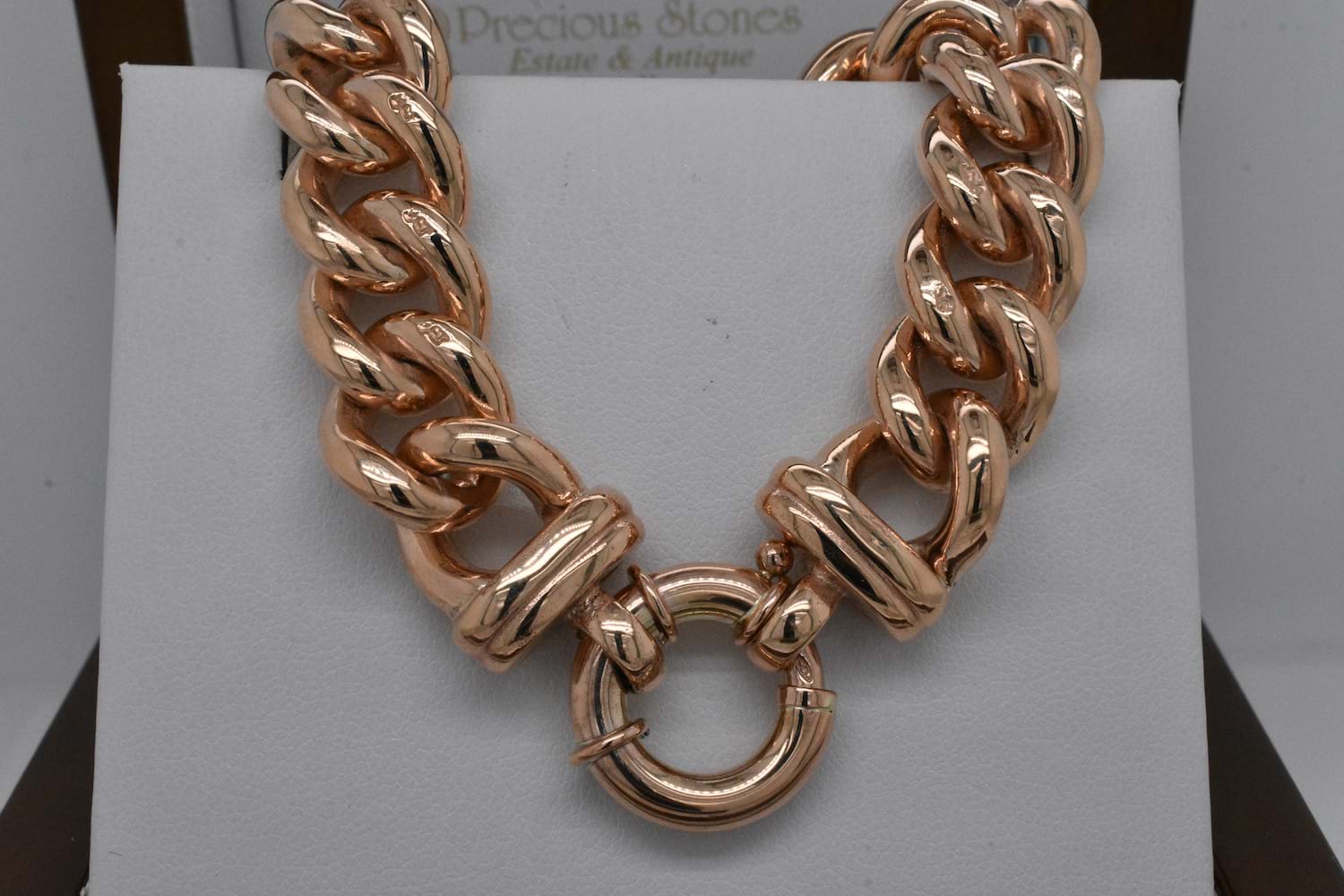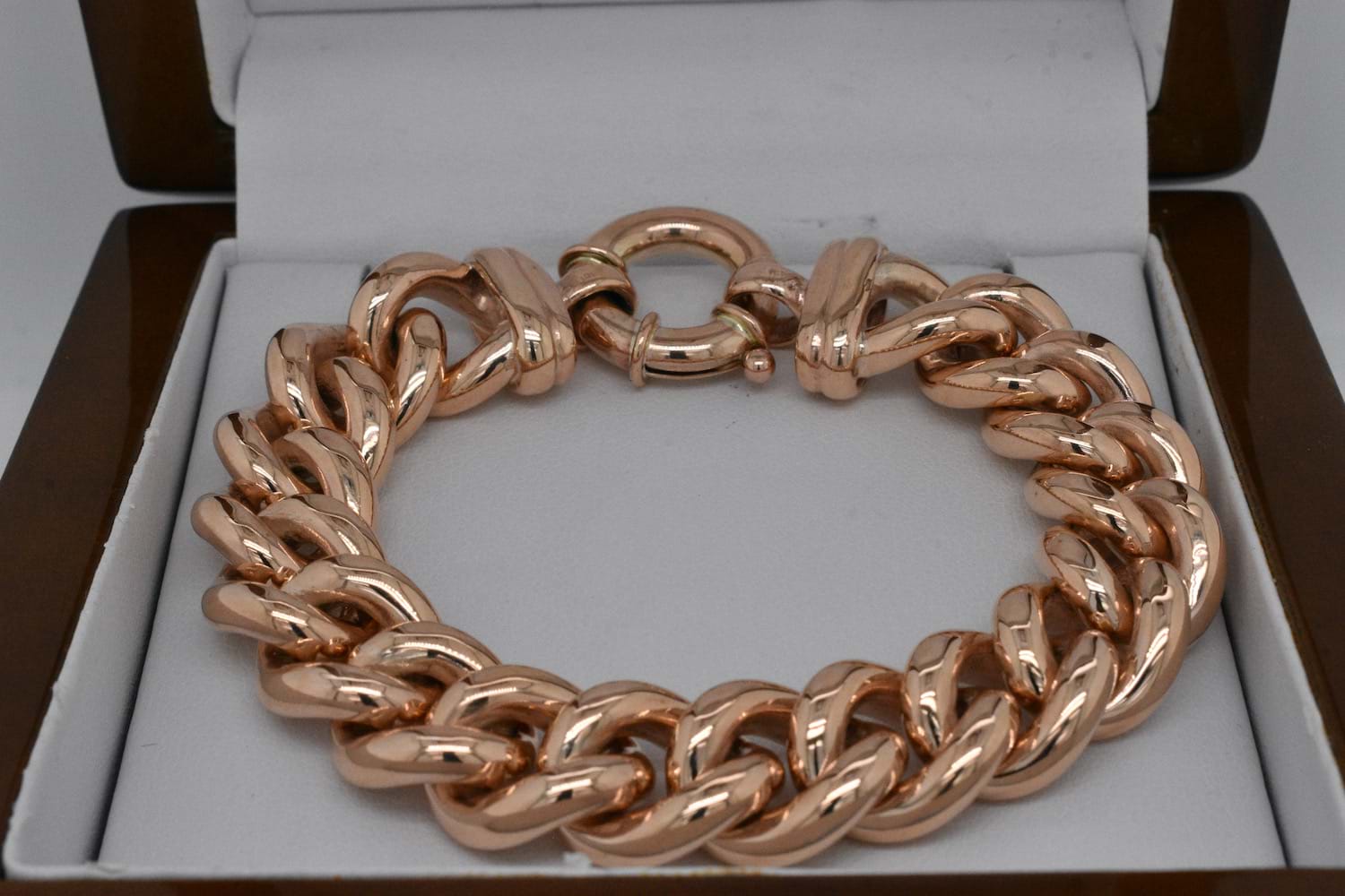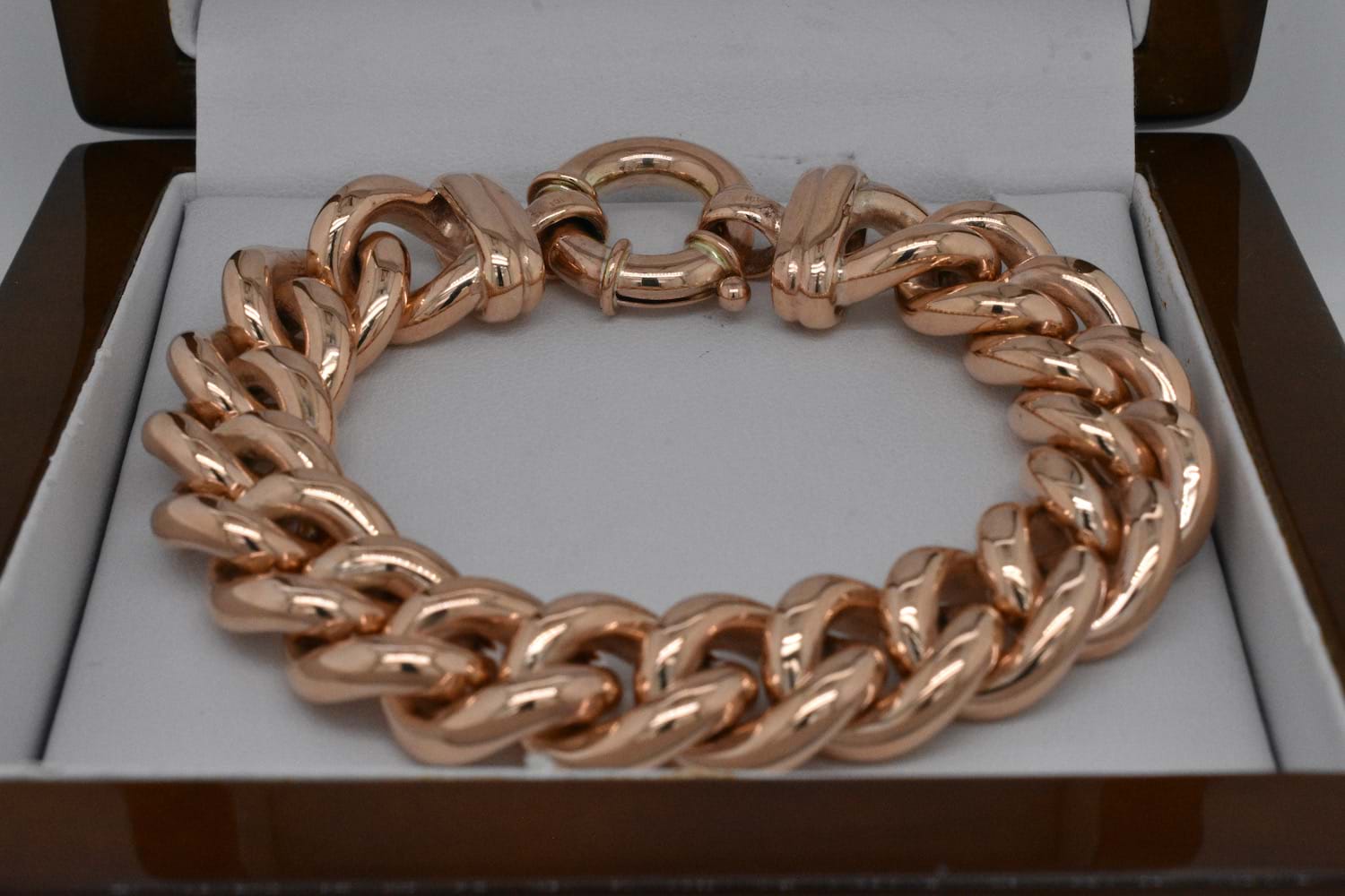 Stunning and solid, this fabulous bracelet has been handcrafted by our goldsmith in 9ct rose gold with handmade end finials and a European boltring clasp. The bracelet weighs 92.57grams and is 19cm long