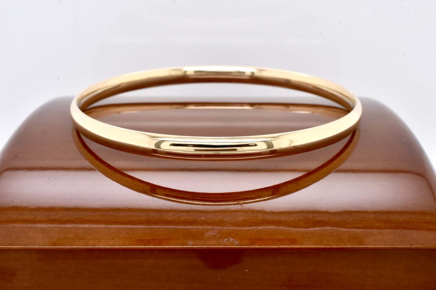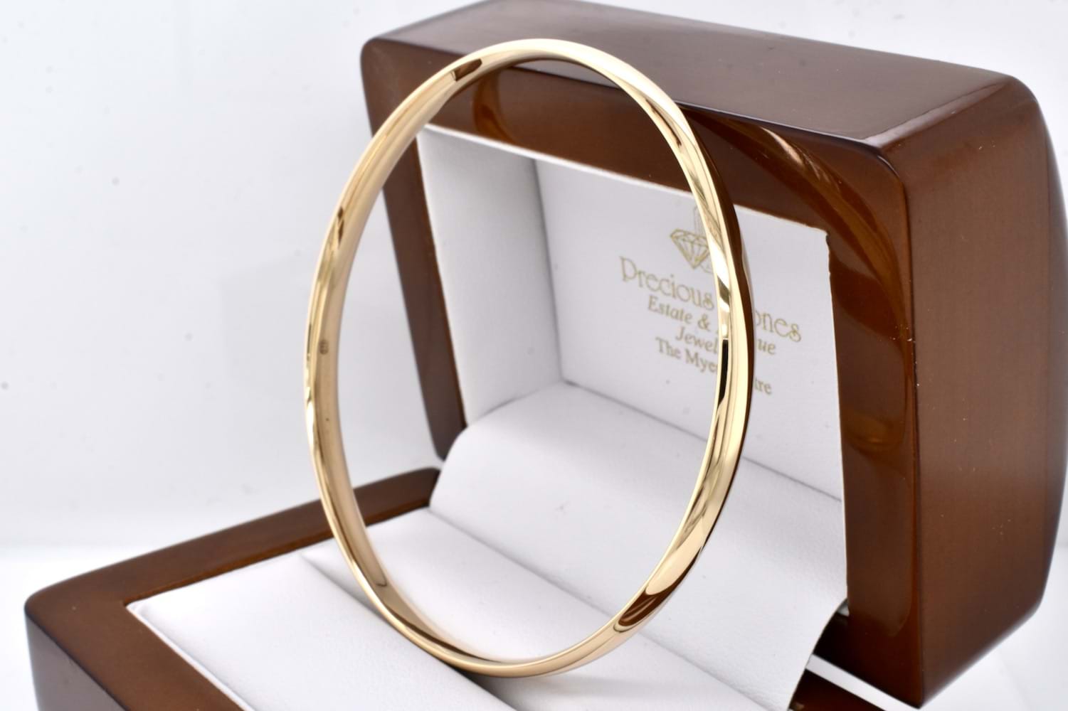 A classic and timeless jewellery collection staple, this solid, round bangle has been handmade in 9ct yellow gold with a half round profile and very comfortable soft curve to the inside. Bangle is hand size 63mm and 5mm wide with a weight of 17.99 grams