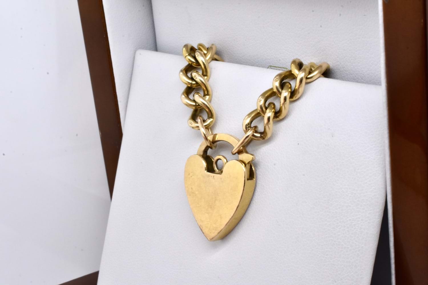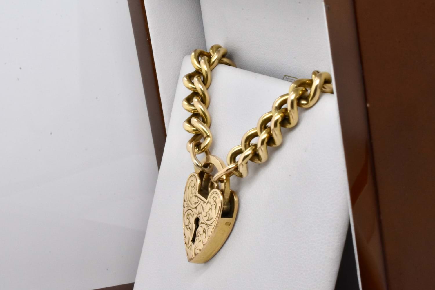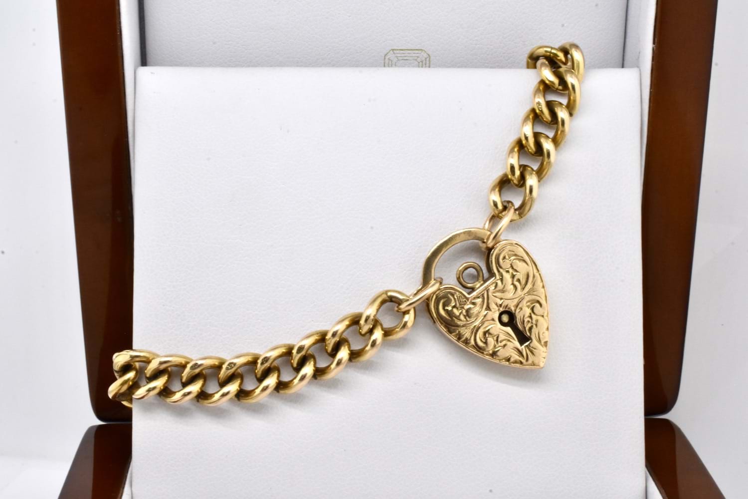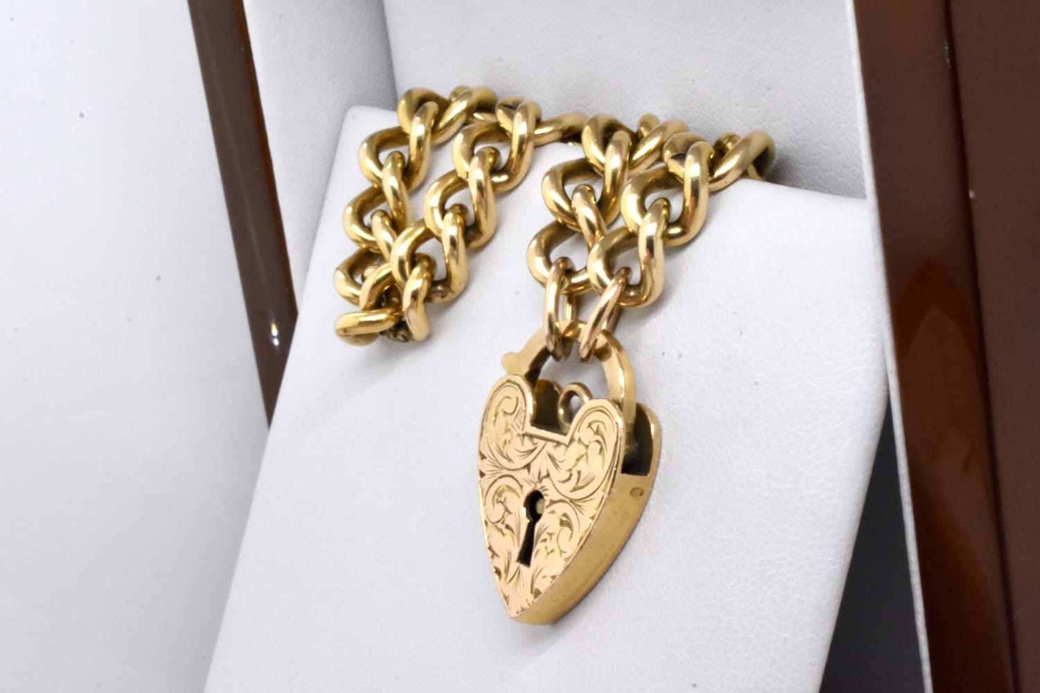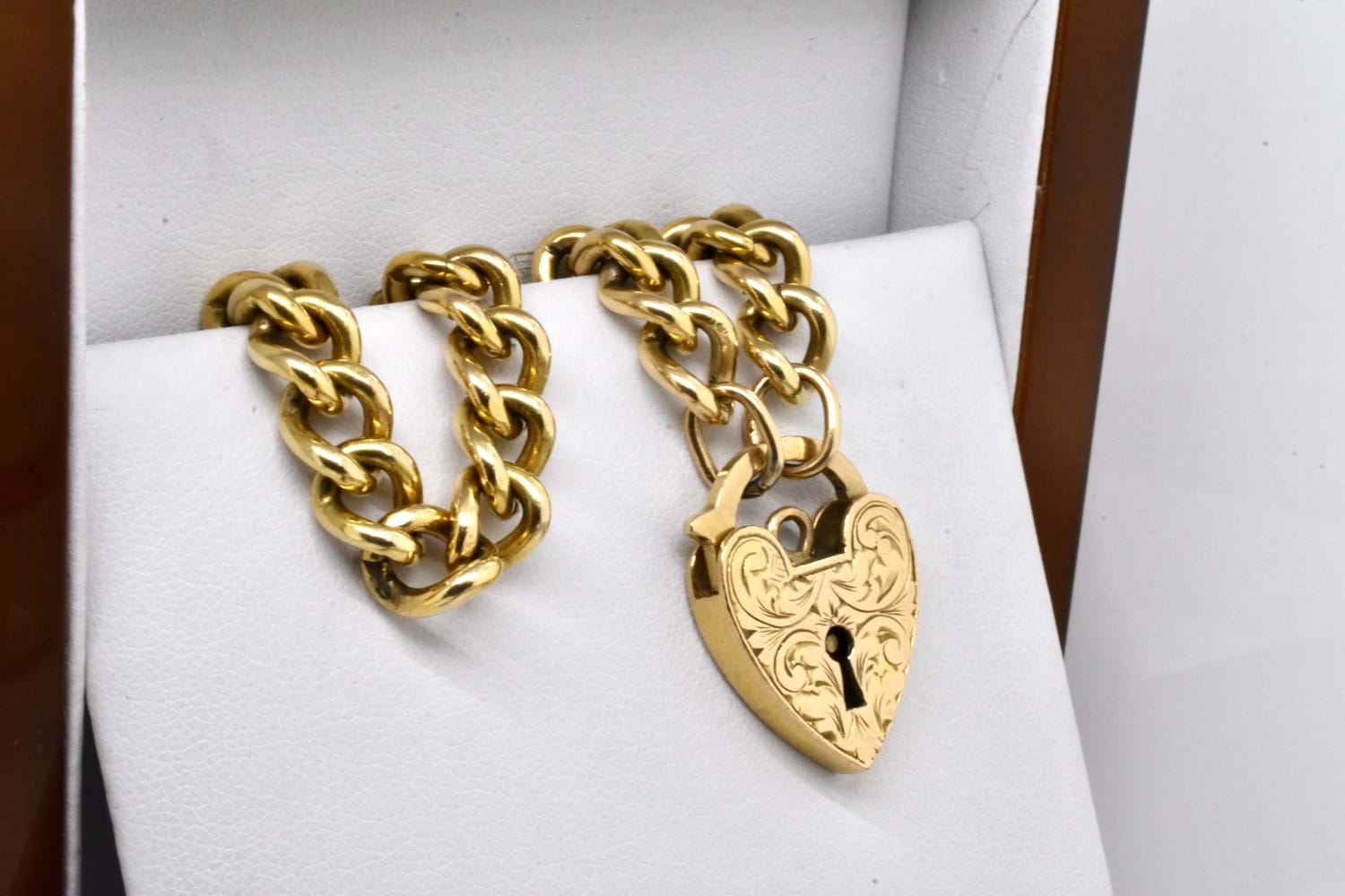 A classic and timeless piece, this 9ct yellow gold bracelet has been handmade and features individually stamped curb links, with an ornamentally engraved heart padlock. Bracelet weighs 25.51 grams and is 19cm long