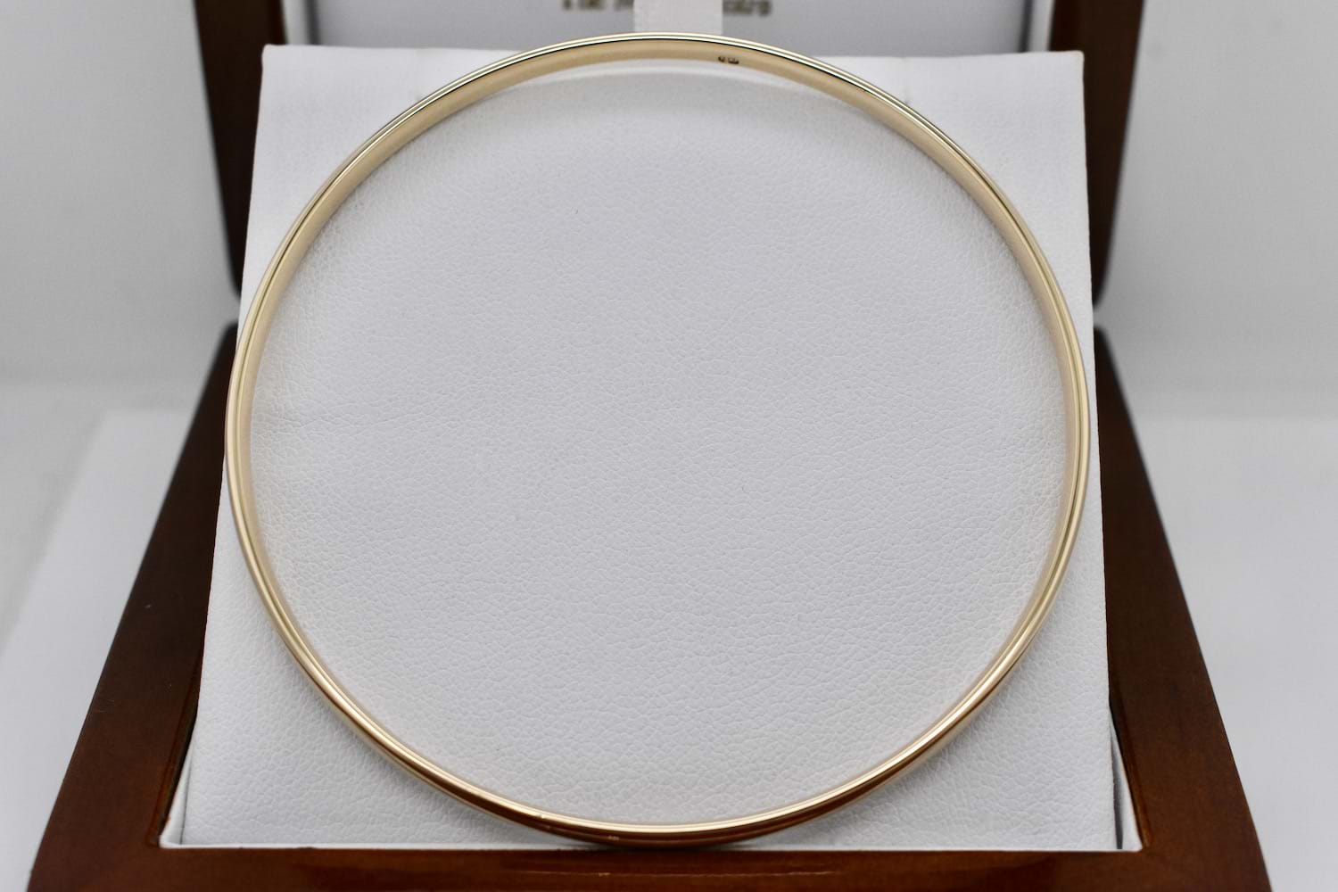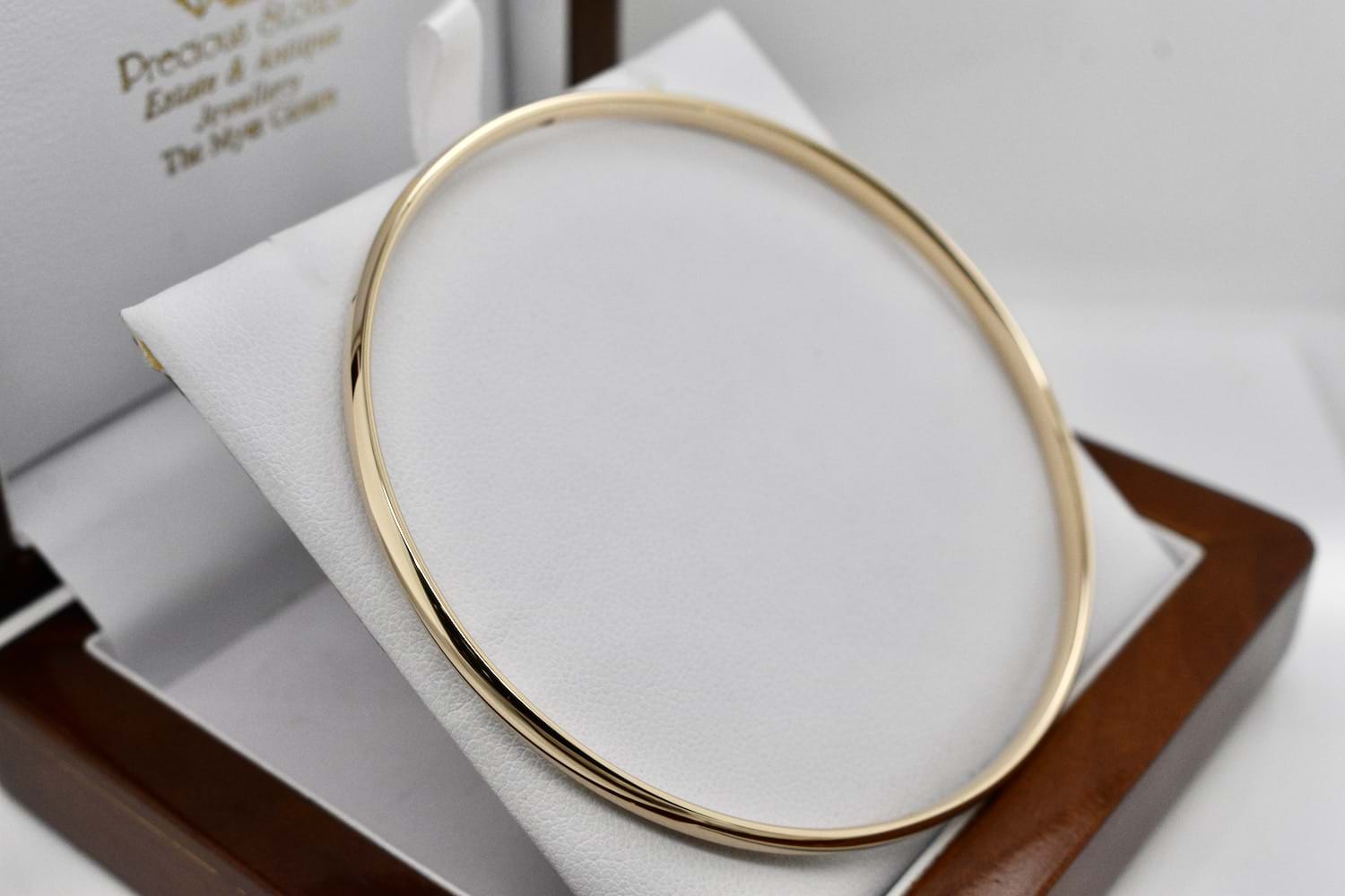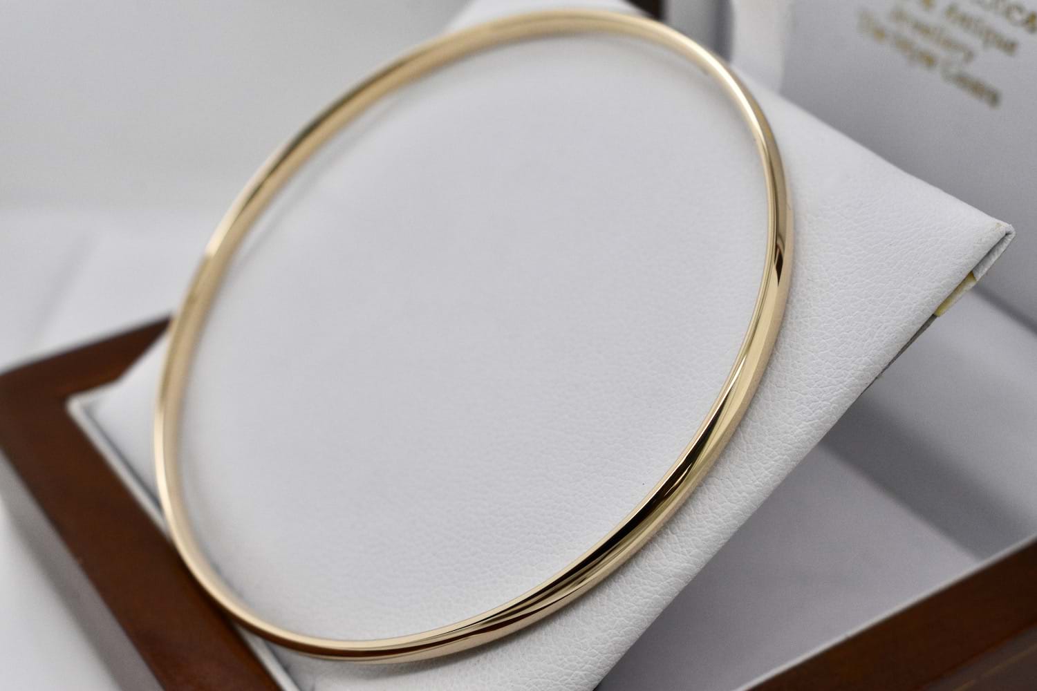Handmade in 9ct yellow gold this bangle is a half round comfort profile measuring 3.5mm wide and 65mm round internal fit. Weight: 13.91grams