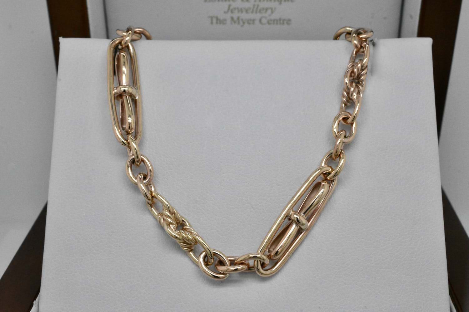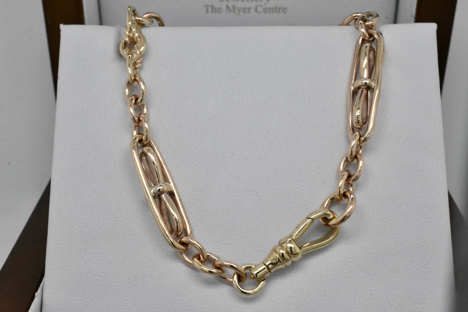 This beautiful handmade 9ct yellow gold bracelet is based on an antique chain link which our talented goldsmith was able to recreate for our store. Measuring 19cm with a 22mm swivels, this Birmingham bow link is a timeless classic. Weight: 13.67grams Length: 20cm. Matching chain available for separate purchase (20321468)