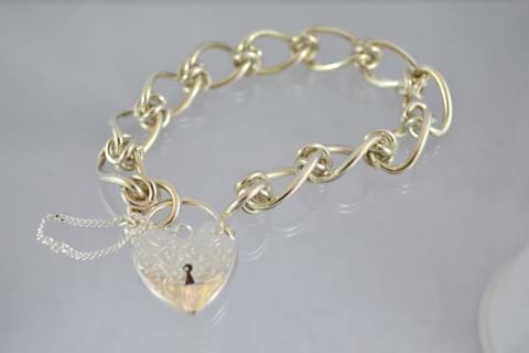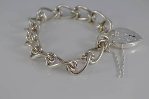 Sterling Silver handmade Bracelet with heart padlock and safety chain. Unusual link of a long curb with an interesting knot link in between. 45.5 Grams