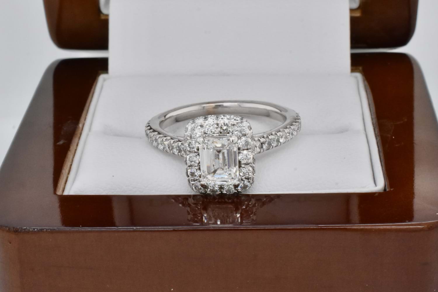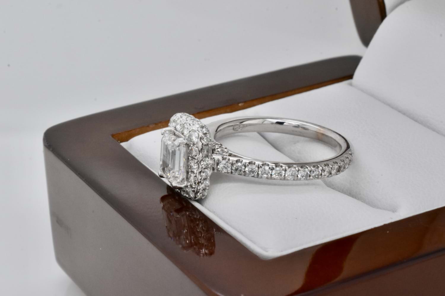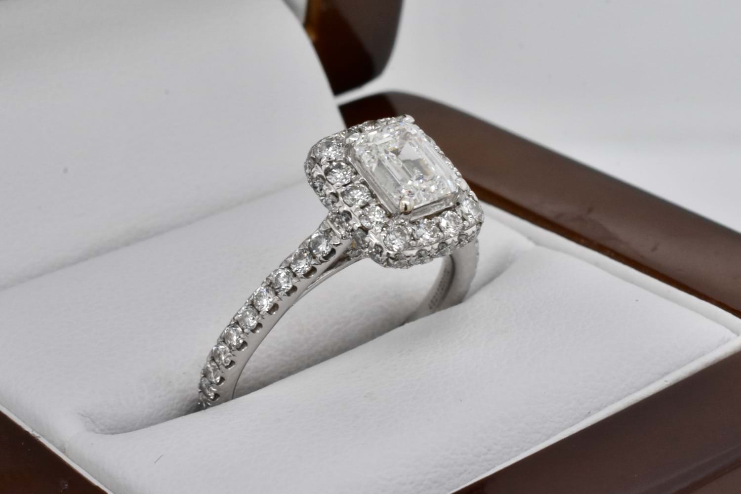 SOLD 14ct White Gold 1ct Emerald Cut Diamond with 1ct Diamond Halo Ring