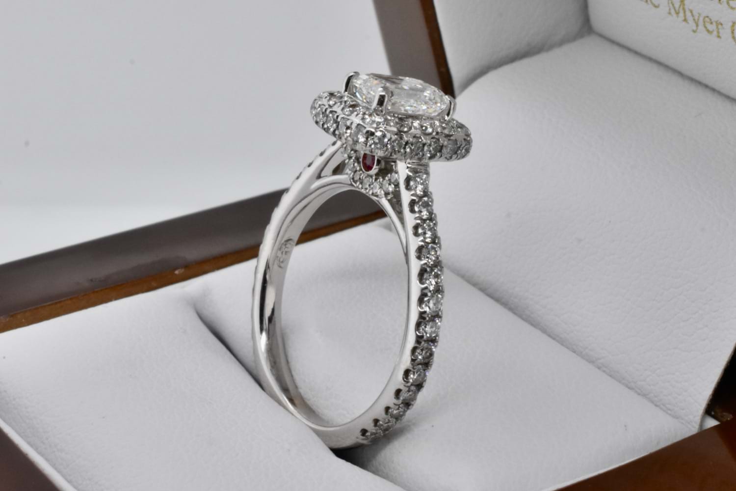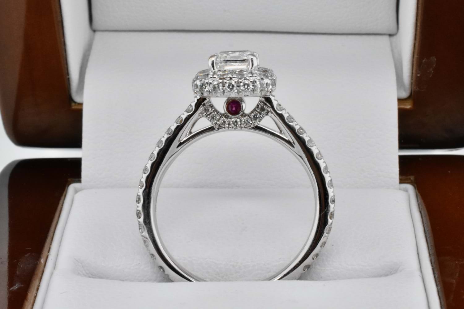 Shimmering 1ct emerald cut diamond (H/I SI2) four claw set in the centre of a 14ct white gold halo ring with sparkling round brilliant cut diamonds set into the halo and down the shoulders. The ring contains 76 round diamonds equalling 1ct (I/SI) and a small pink sapphire on the underside of the gallery on both sides. This has been designed to sit perfectly with diamond or plain wedding bands. Finger size N. Independent Valuation Supplied