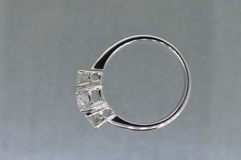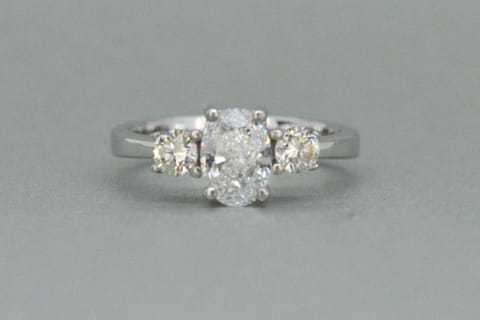 This 1.01ct white oval diamond is four claw set in 18ct white gold and is flanked by a slightly tinted round brilliant cut diamond on each side, contrasting the white of the centre stone perfectly. The side diamonds total 0.30cts. Independent Valuation Supplied