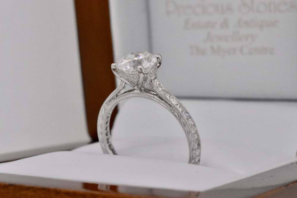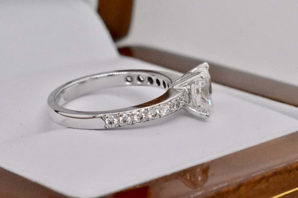 A stunning, high calibre, 0.90ct GIA certified oval diamond has been four claw set in 18ct white gold and is flanked by grain set diamond shoulders. With a total of 14 high white round brilliant cut diamonds down the shoulders totalling 0.28cts, this gorgeous ring makes the perfect engagement ring. Independent Valuation Supplied