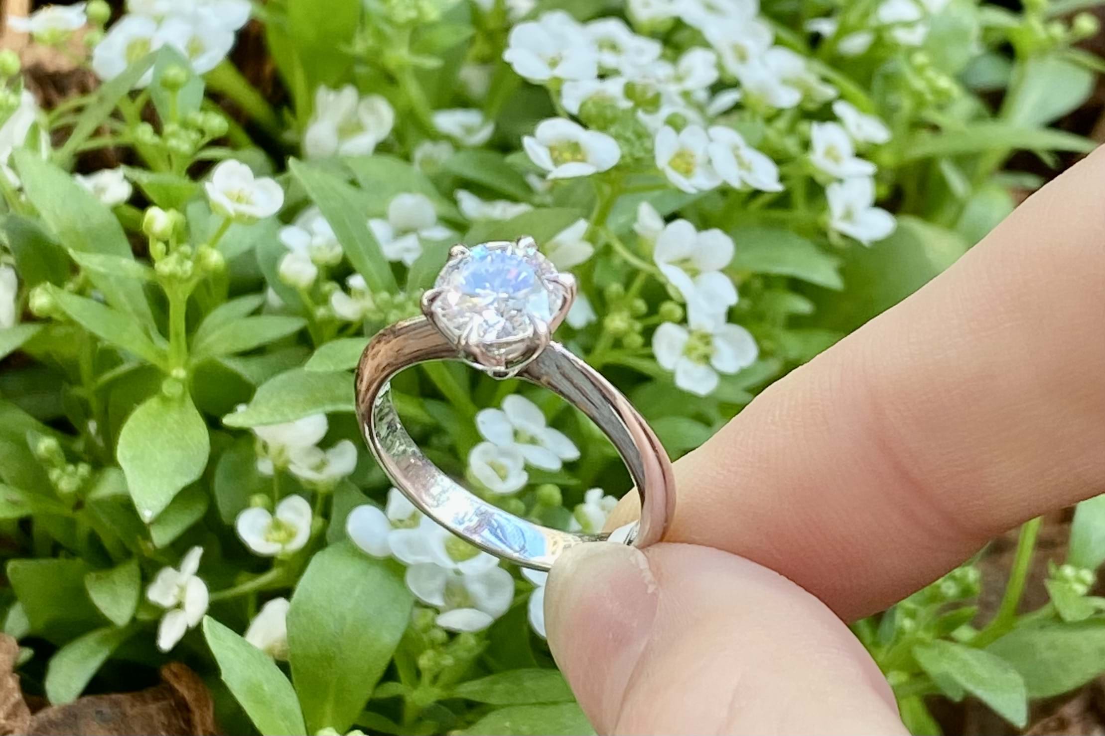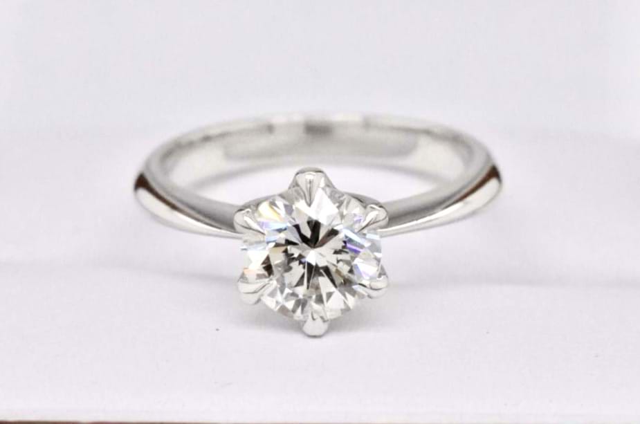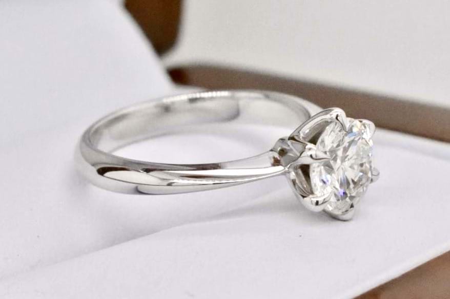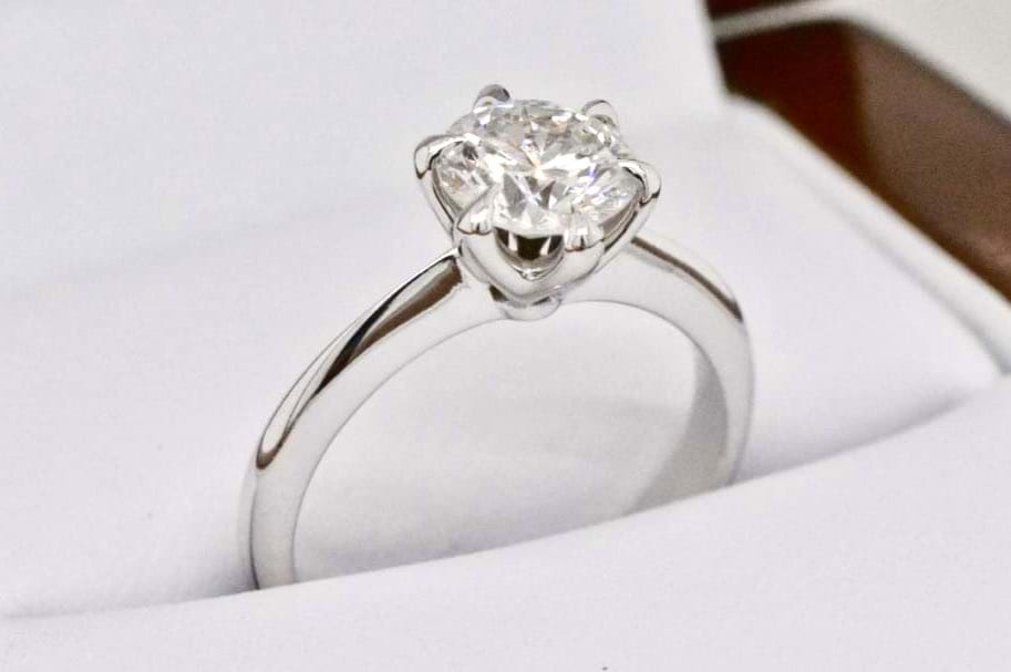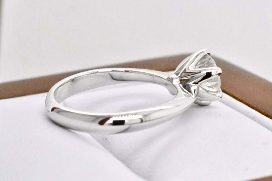 Designed in store and crafted in our jewellers workshop this stunning 18ct white gold solitaire ring features a scintilating 1.25ct (G/SI1) round brilliant cut diamond. A contemporary take on a classic solitaire these ribbon style claws show off this stunning stone from all sides while still providing maximum security for the diamond. Independent Valuation Supplied. Finger size L