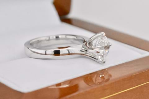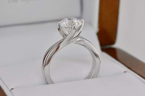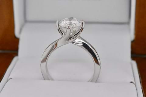 18ct white gold ring with a 4 claw upswept swirl design sits a magnificent 1.50ct F colour VS2 clarity diamond that can be admired from the side as well as the top. The stone itself has been certified by the GIA and is classed as an 'Excellent Cut'. The stunning sparkle of this diamond needs to be seeen to be believed.
