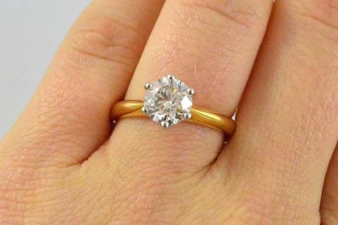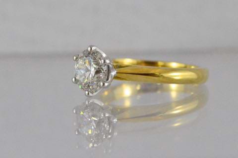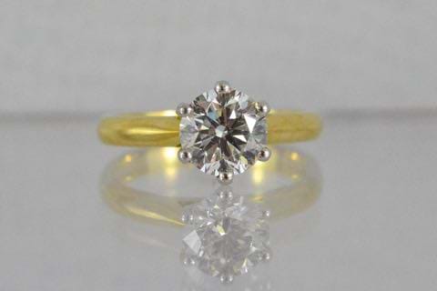 This timeless and classic 18ct yellow and white gold solitaire ring was designed in-store and crafted in our workshop. Featuring a white and sparkling 1.51ct round brilliant cut diamond, six claw set, on a soft knife edge band. This ring has been designed to sit perfectly next to wedding bands. Independent Valuation Supplied.