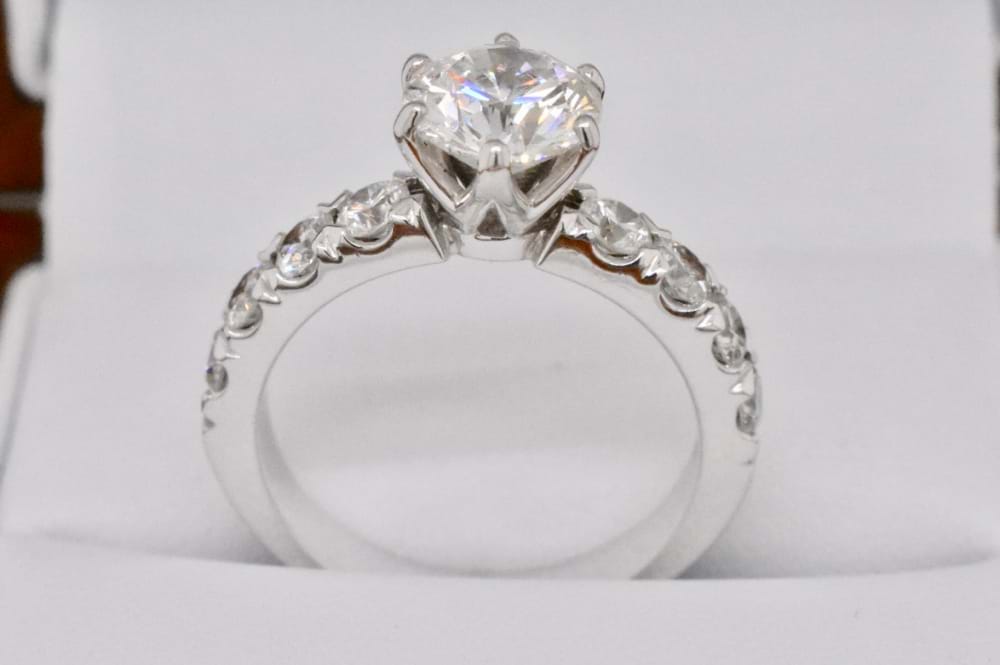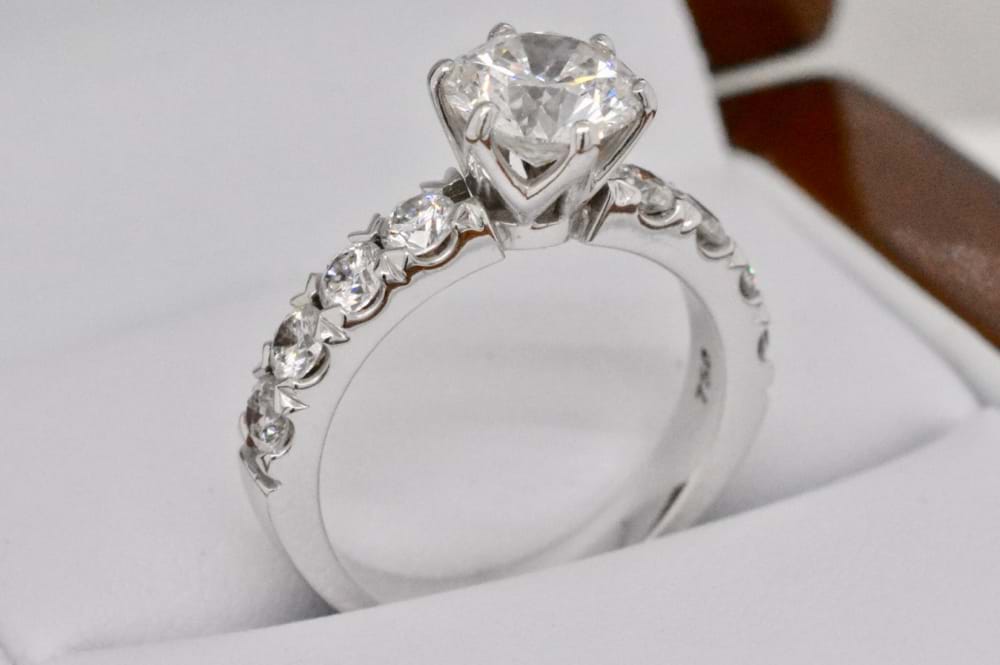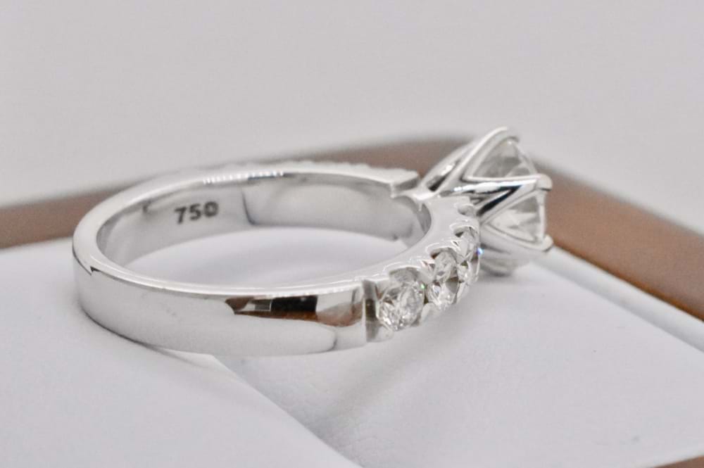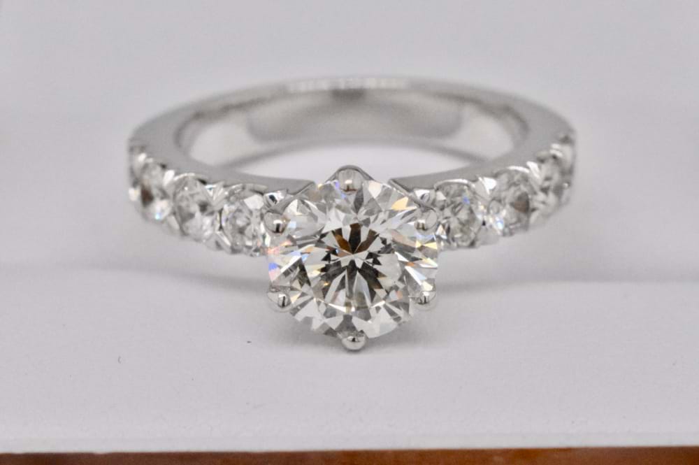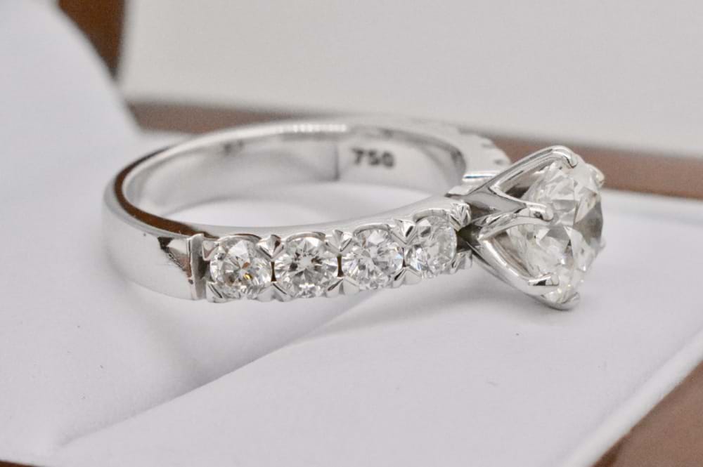 This gorgeous scintilating 1.51ct (I/SI2) GIA certified stone is set into a ring crafted by our master jewellers. With four sparkling diamonds set down each shoulder, and a total of 0.88cts (G/SI1) this 18ct white gold ring is spectacular. Size M. Independent Valuation & GIA certificate supplied.