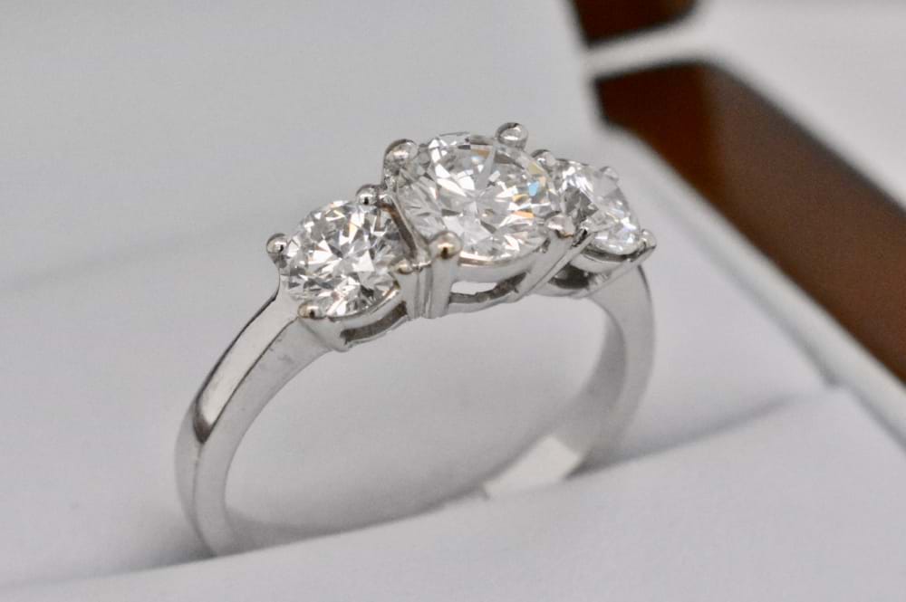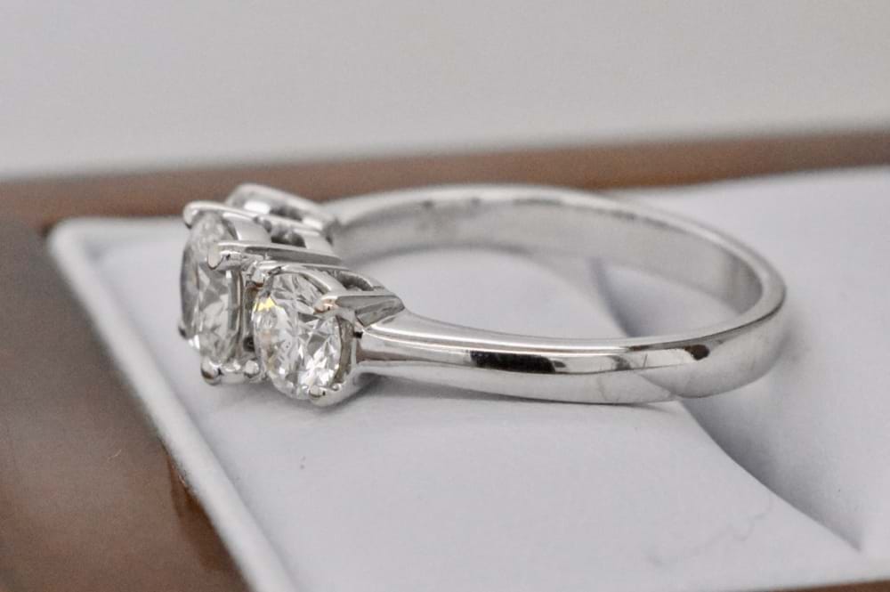 A classic three stone diamond ring crafted in 18ct white gold and featuring a 0.80ct (G/VS2) round brilliant cut diamond in the centre and flanked by a 0.40ct (I/SI2) diamond on either side. A stunning anniversary or just because ring. Size M. Independent Valuation Supplied