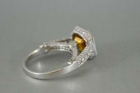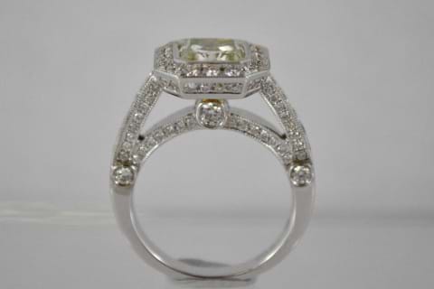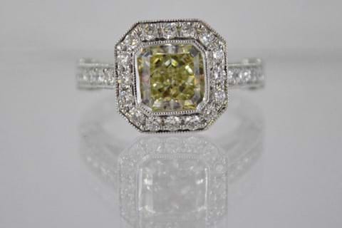 This glorious radiant cut diamond is a very pale fancy yellow colour and an impressive 2.02cts, set into an 18ct yellow gold bowl gallery underneath & white gold mill-grain bezel set into a halo of sparkling, high white, round brilliant cut diamonds. With an amazing 112 white diamonds set into the halo, shoulders and on the side profile, totaling 1.54cts this incredible ring makes a stunning statement piece. Independent Valuation Supplied