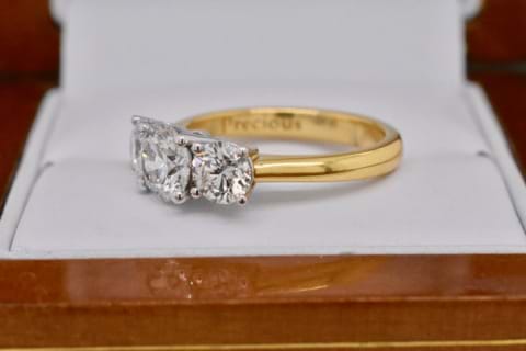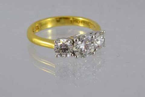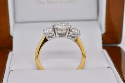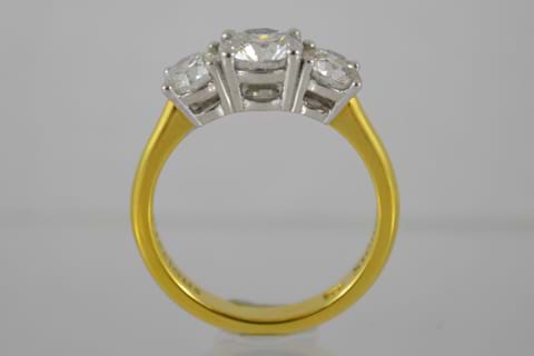 This 18ct yellow & white gold Diamond ring features all GIA certified Diamonds totalling 2.01cts. (Centre: 1.00ct G/SI2, 2=1.01cts G/SI2). Independent Valuation & GIA cert supplied.