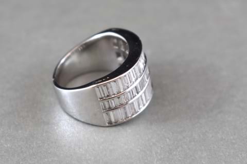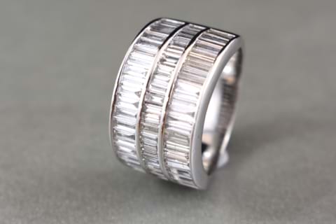 This wide and eye catching ring features an amazing 67 baguette diamonds channel set into three rows in 18ct white gold. A fabulous dress ring, sitting low on the finger for practicality with incredible impact and sparkle factor and a total diamond content of 3.13cts. You simply cannot look past this striking piece. Independent Valuation Supplied