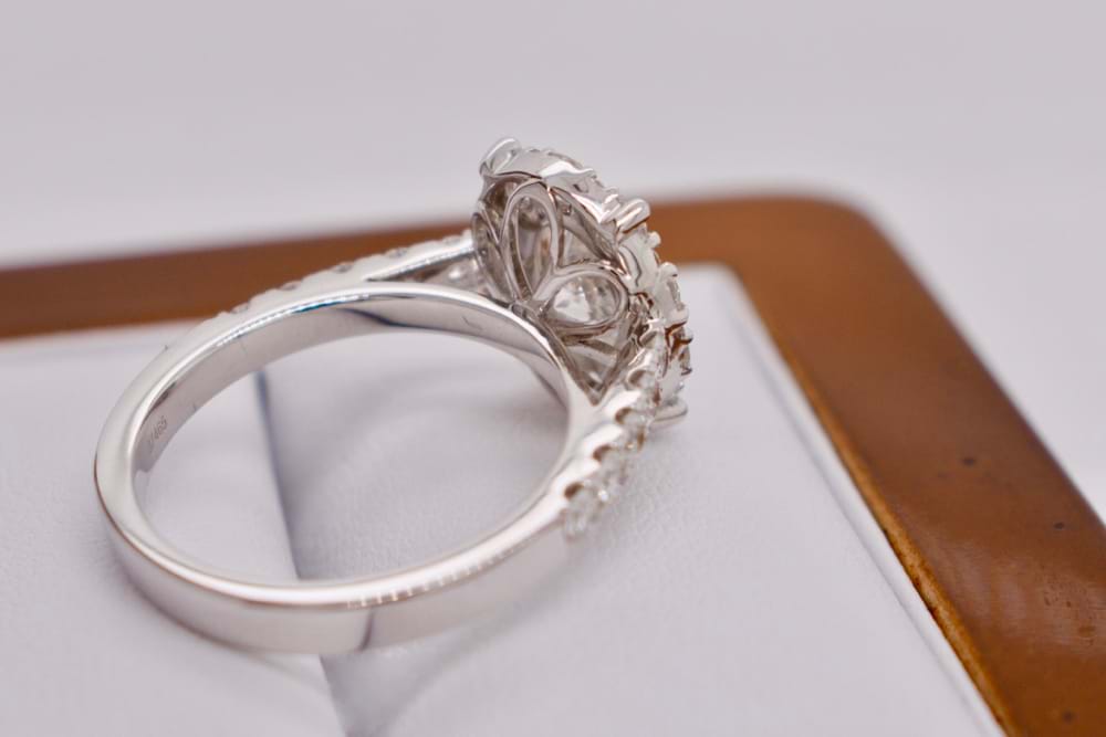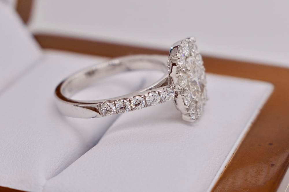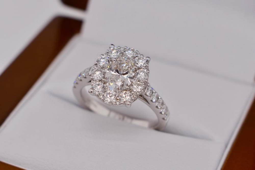 This stunning 0.90ct GIA certified G/VS2 oval shape diamond has been set into a custom designed halo ring in 18ct white gold. It is surrounded by a halo of 32 scintillating round brilliant cut diamonds with a further five going down each shoulder. This intensely sparkly ring gives the illusion of a much larger single oval diamond. The halo and shoulder diamonds in this piece are comprised of 42, high white, round brilliant cut diamonds totaling 1.25cts (G/VS). The dream engagement ring for a girl who loves sparkle! Size M. Independent Valuation & GIA cert supplied