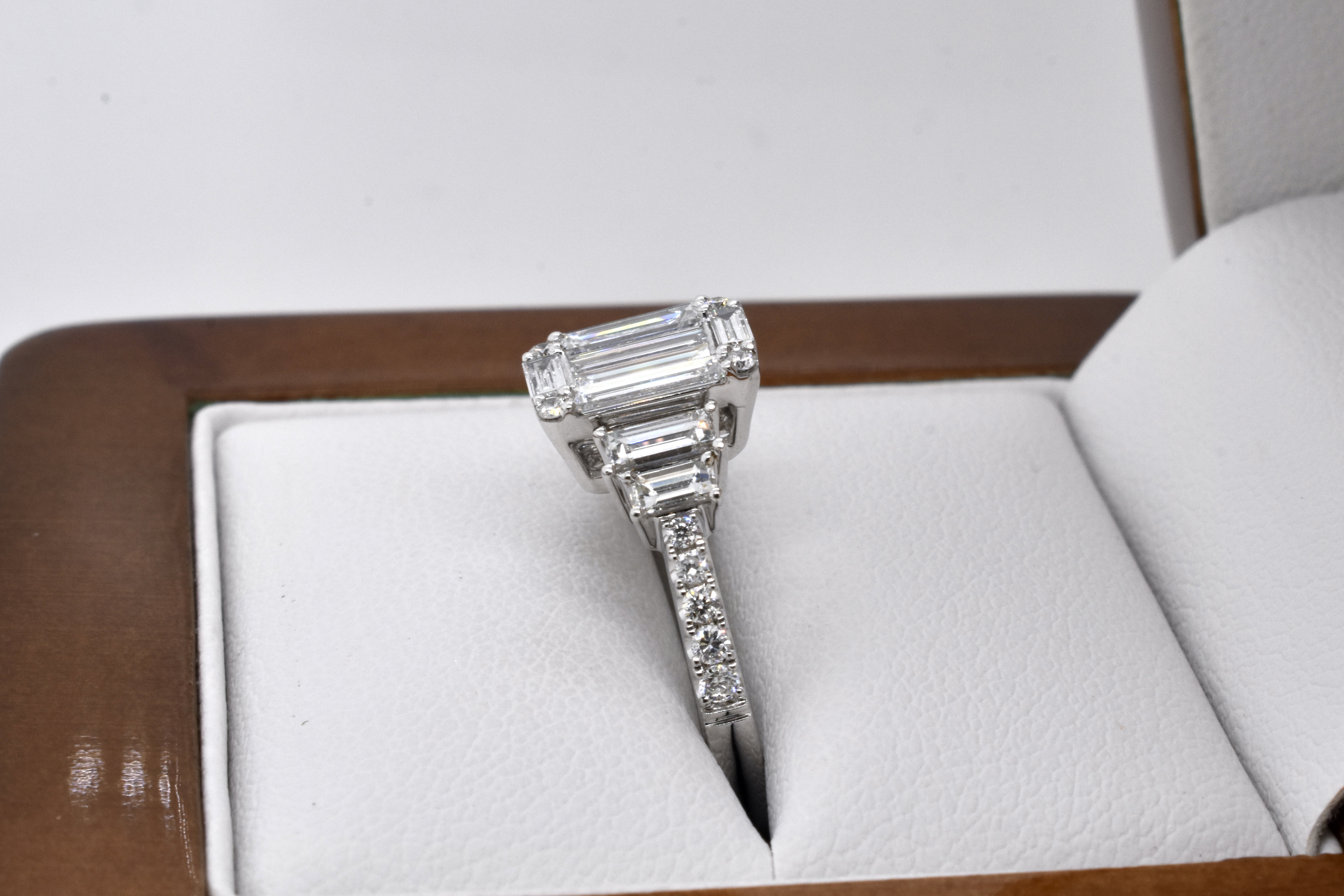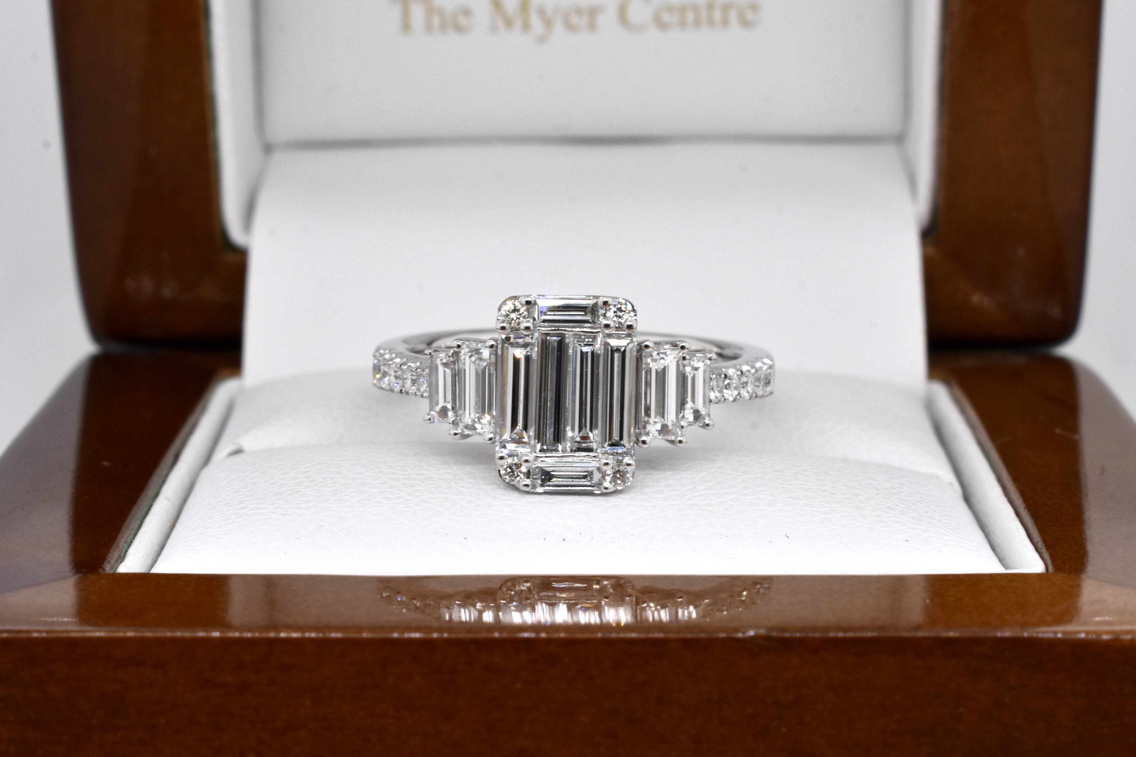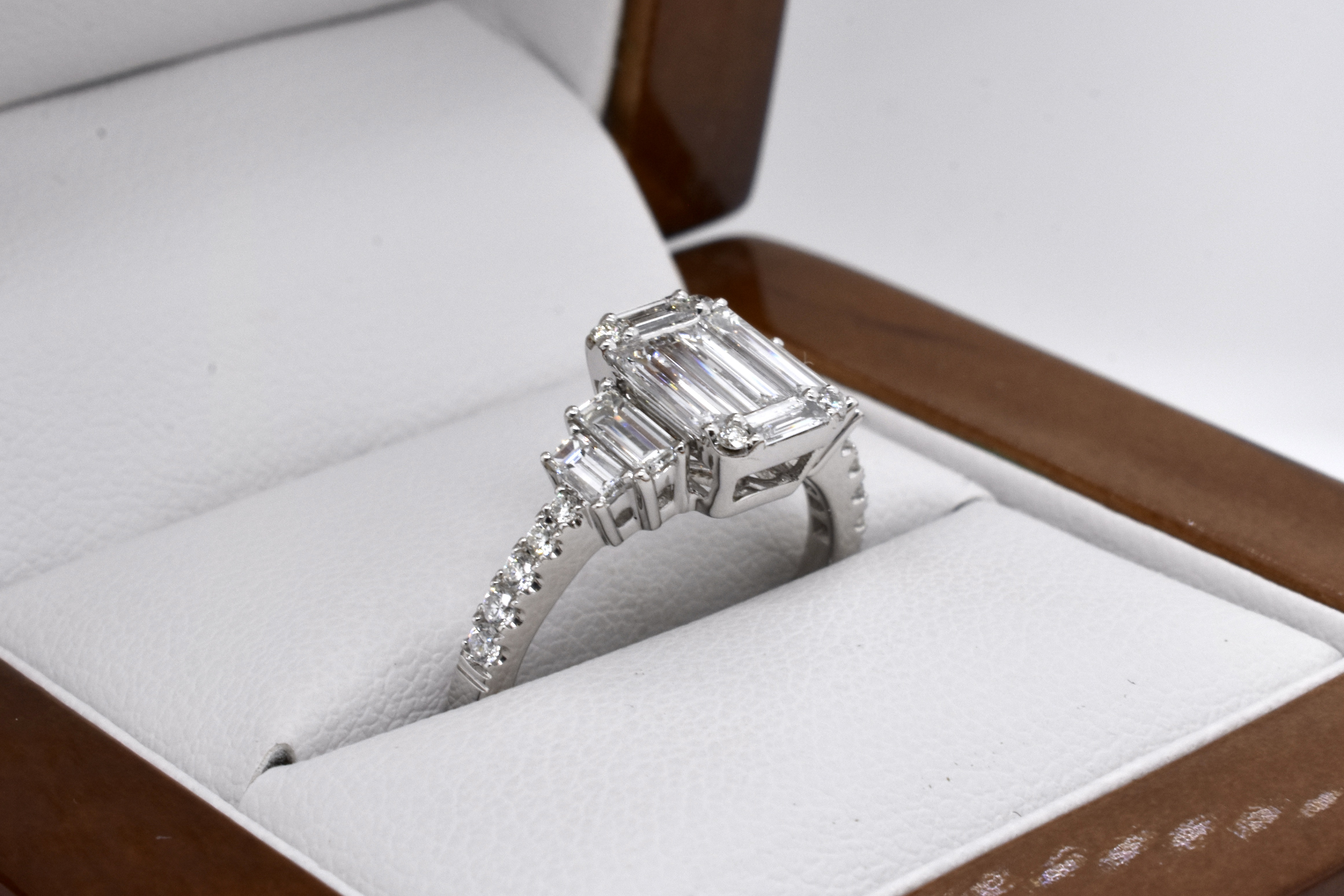 This scintillating ring is made from 18ct white gold in an emerald cut illusion style with a total weight of 1.24ct and made up of a total of 24 shimmering baguette and RBC diamonds including diamonds down the shoulders, all ranging from FG/VS-SI on a tapered band. Finger size M