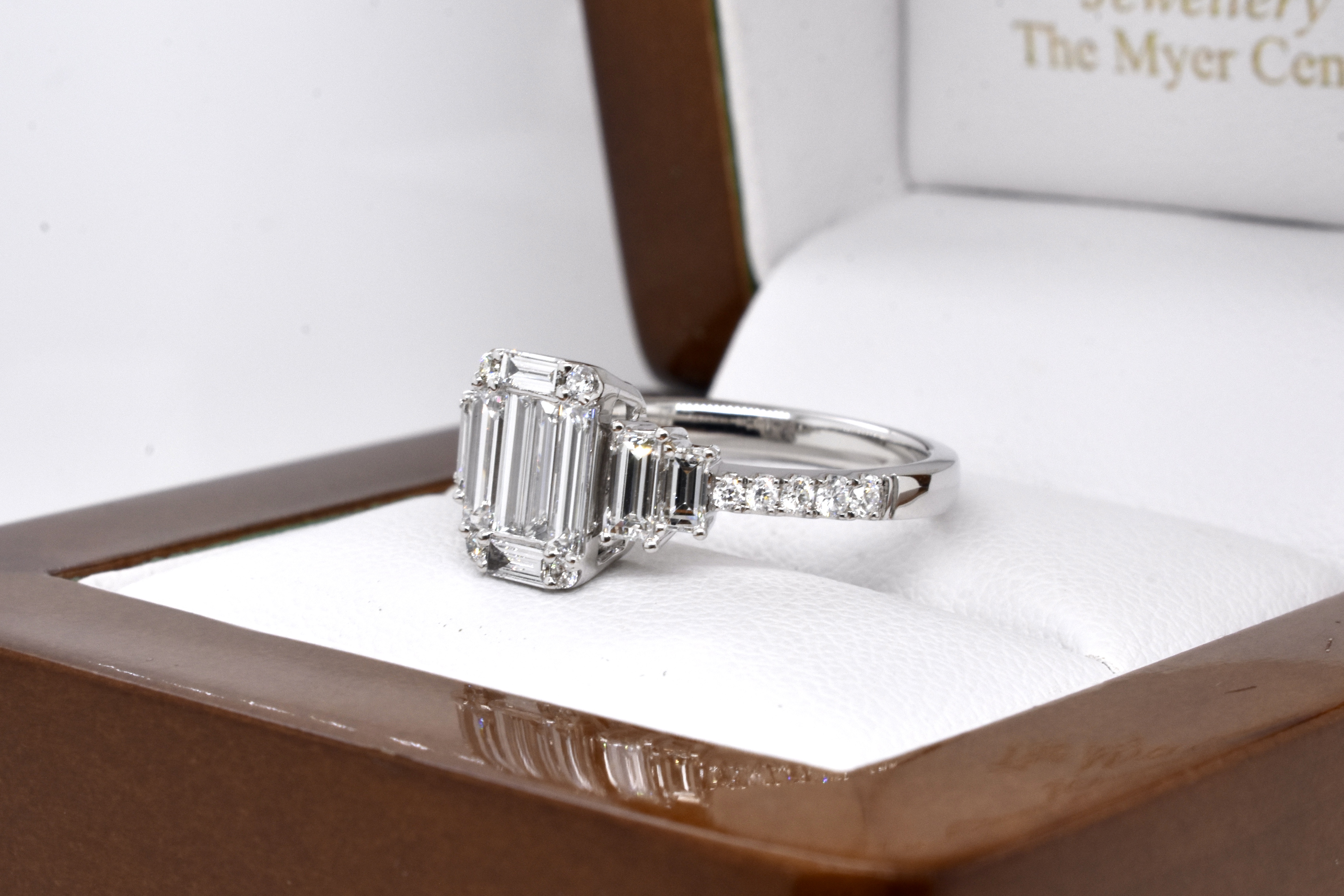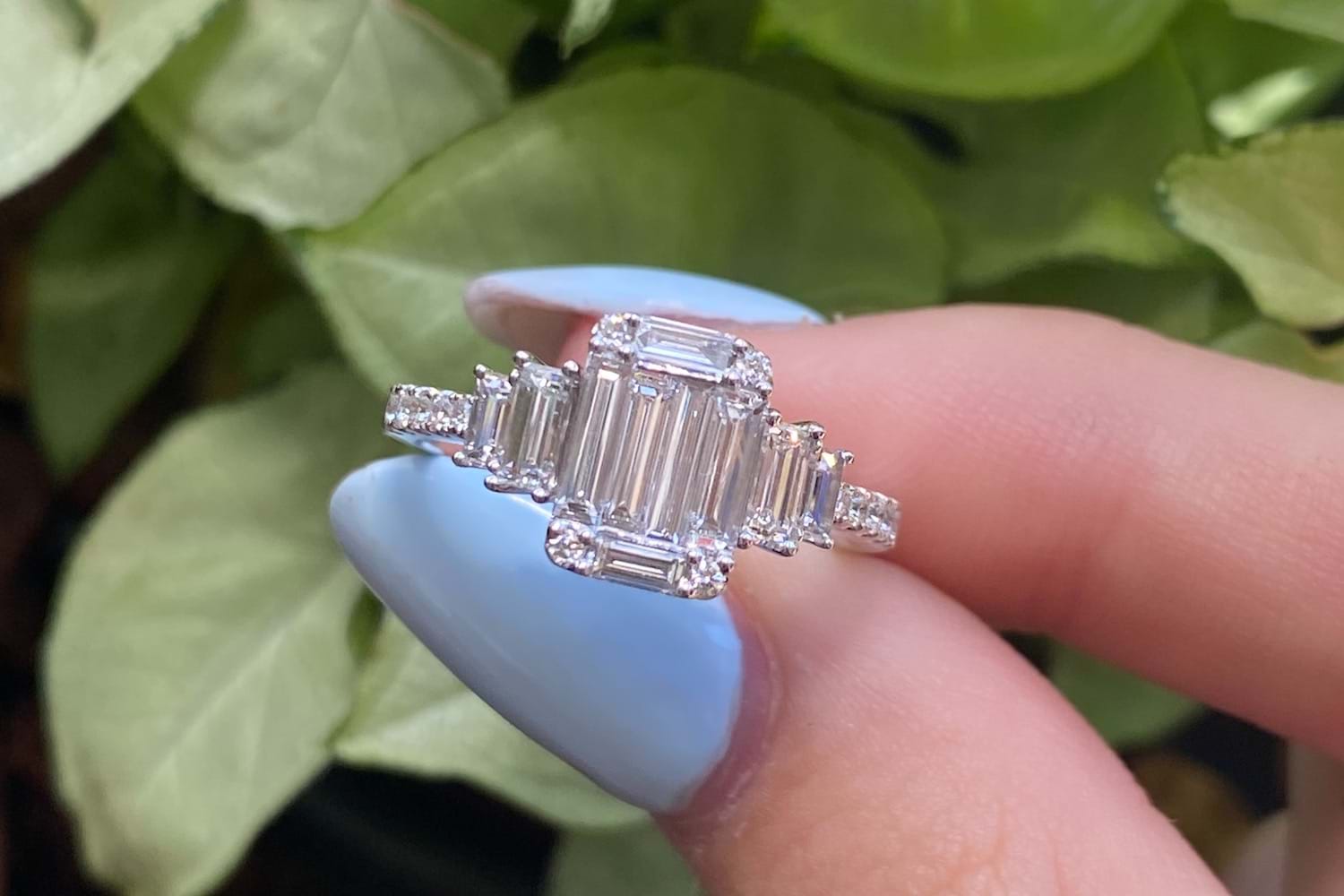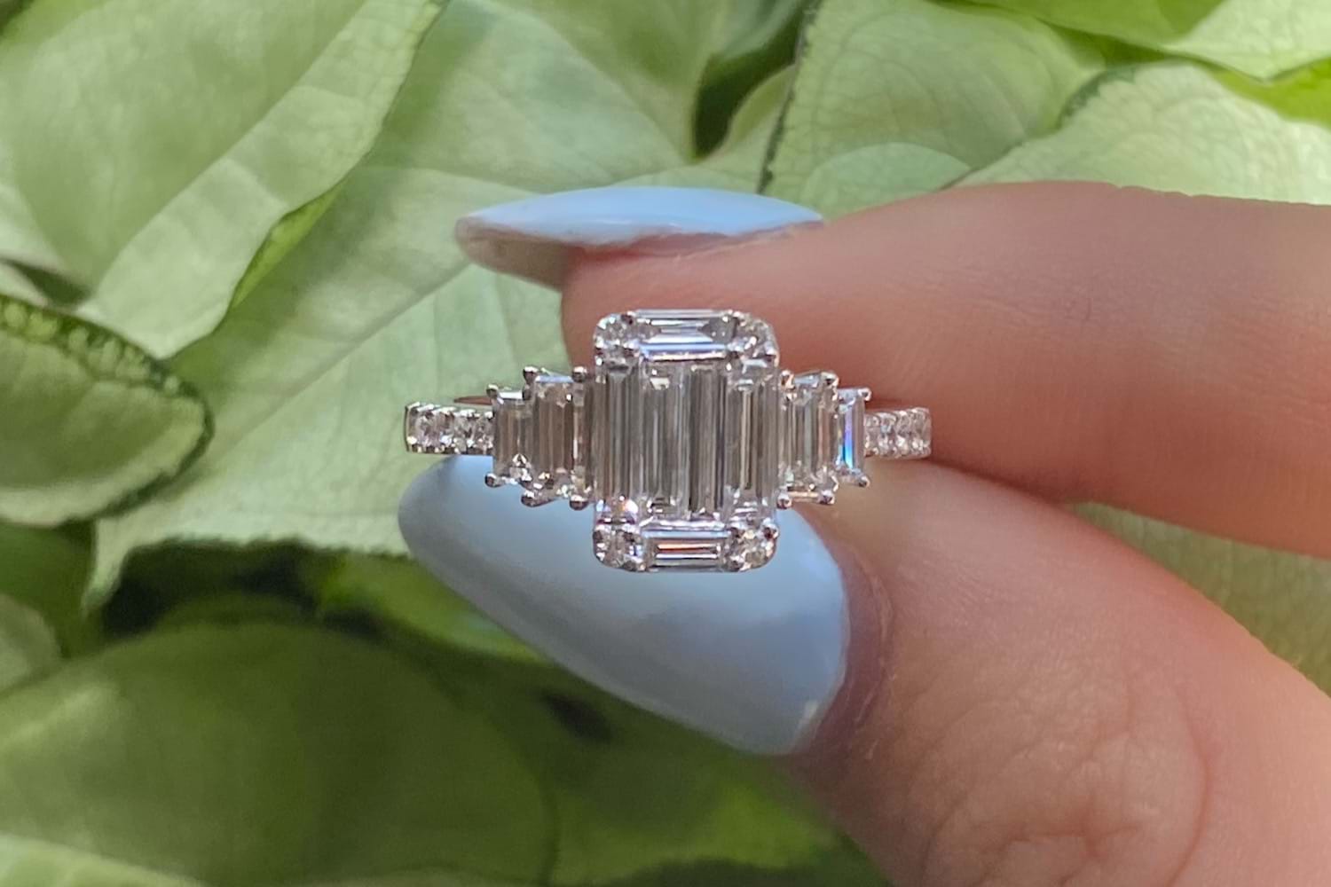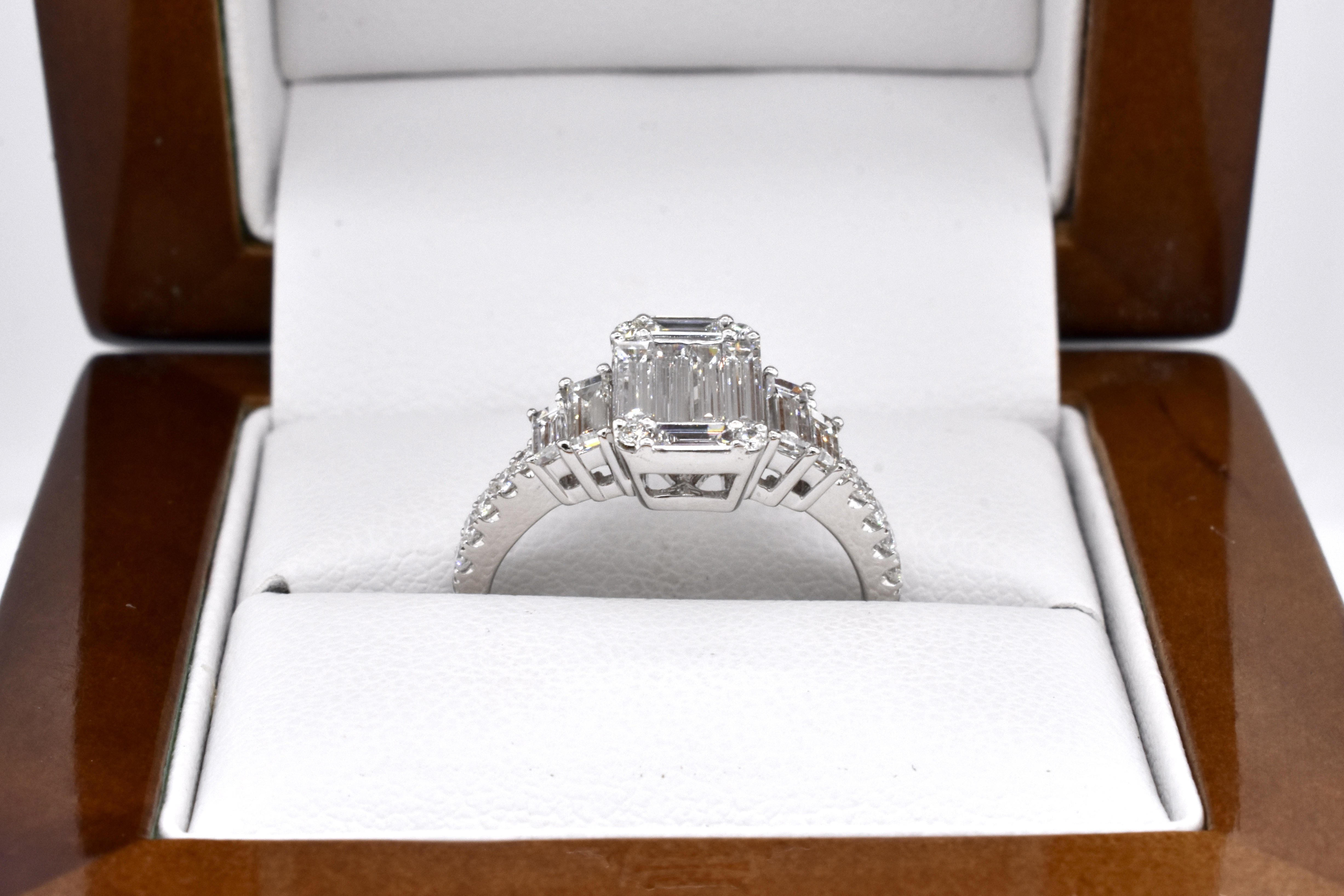This scintillating ring is made from 18ct white gold in an emerald cut illusion style with a total weight of 1.24ct and made up of a total of 24 shimmering baguette and RBC diamonds including diamonds down the shoulders, all ranging from FG/VS-SI on a tapered band. Finger size M