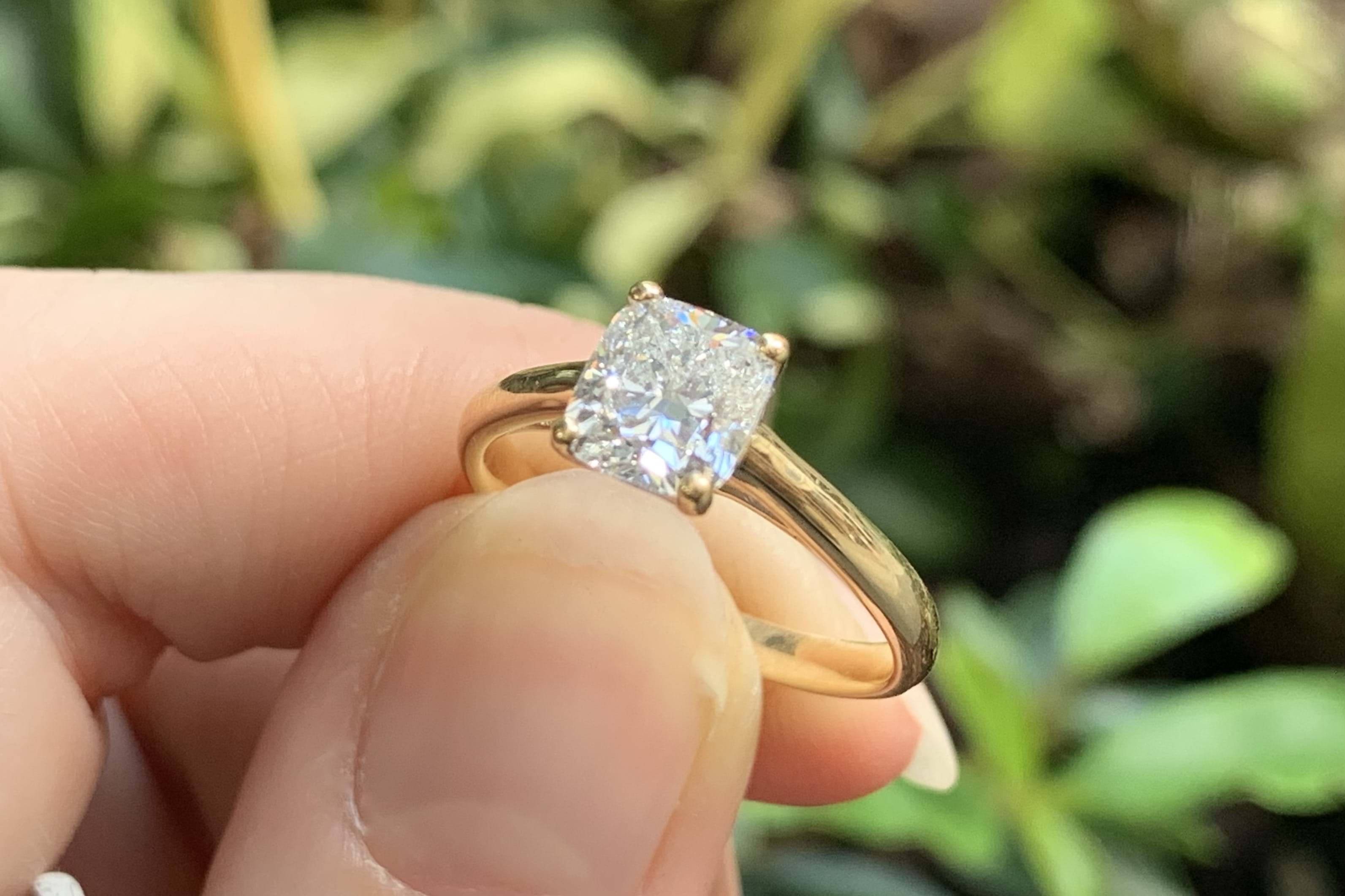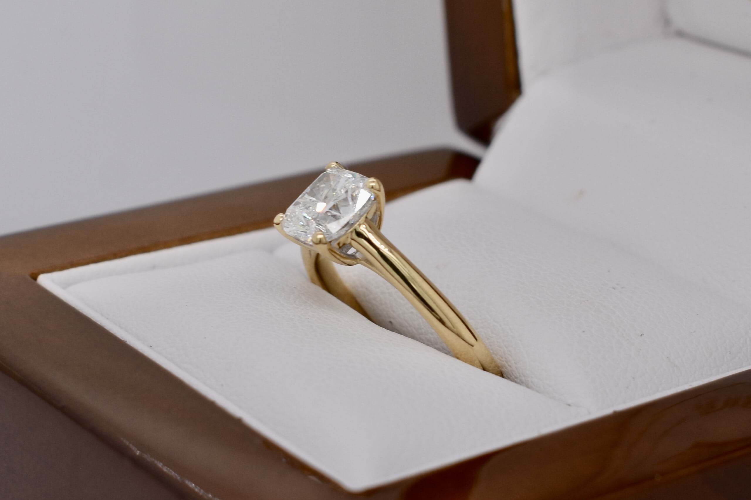 Secondhand Bargain! This dazzling diamond ring is crafted in 18ct yellow gold and features a stunning cushion cut 1.30ct H SI1 diamond, GIA certified. It is secured in a four claw split bezel tapered setting with a 2-2.3mm band with upswept tapering shoulders. Finger size L. Independent Valuation Supplied.