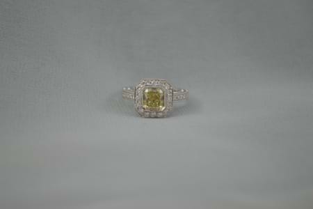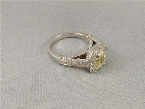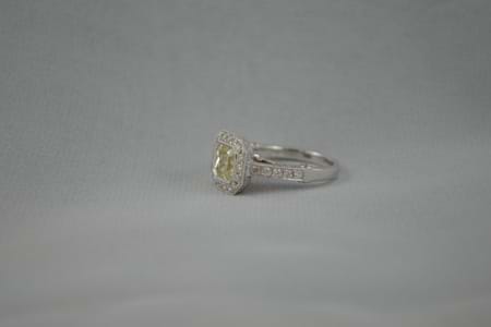 This scintilating 2.02ct "Very Light Fancy Yellow" Diamond is set in a decadent diamond encrusted halo with sparkling diamonds set down the shoulders, on the sides of the shoulders, collet and under-rail. These 112 sparkling white diamonds total 1.54cts. Independent Valuation Supplied,