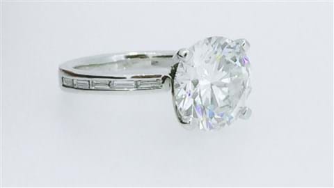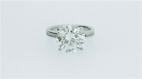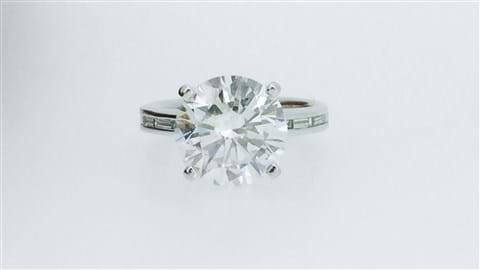 This beyond glamorous 5.70ct Diamond ring gives fabulous impact set into this simple but elegant 18ct white gold ring. The centre Diamond is a scintilating 5.20ct. Pedigree boasts an ADGL certificate, laser inscribed girdle, and has an independent valuation for Insurance Replacement at $185,800. Independently graded as a G colour, SI2 clarity with an excellent cut grading. This stunning Diamond is complimented perfectly by five baguette cut diamonds channel set down either shoulder totalling 0.50cts G/VS.
