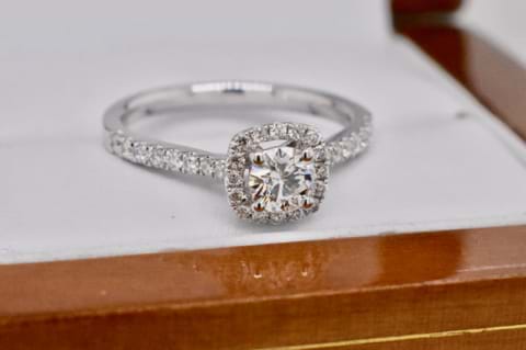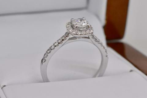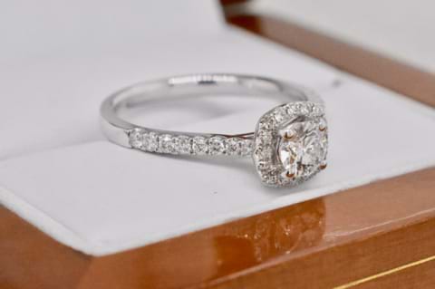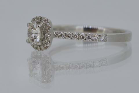 A beautiful 18ct white gold ring featuring a 0.36ct sparkling white round brilliant cut diamond in the centre surrounded by a single row of glistening diamonds, with more continuing down the shoulders totalling 0.29cts. This makes a gorgeous engagement ring and will sit perfectly next to diamond wedding bands. Independent Valuation Supplied