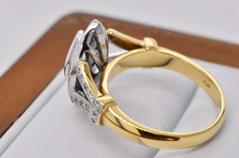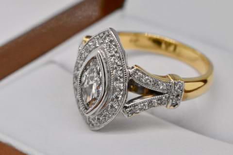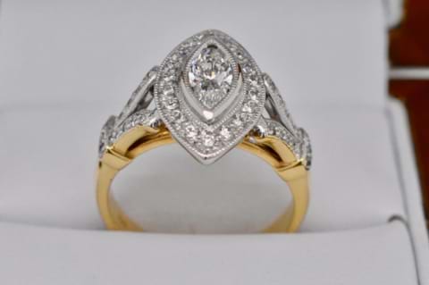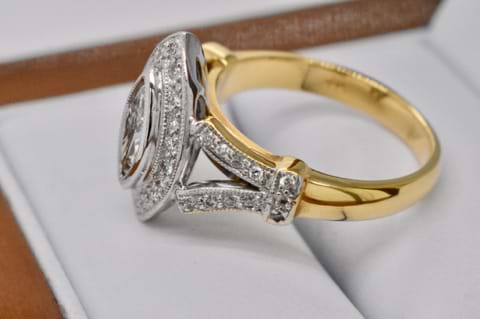 A classic 18ct two gone gold ring. Featuring a 0.60ct marquise diamond surrounded by a halo of shimmering round brilliant cut diamonds grain set with a boarder. With split shoulders also set with sparkling diamonds in white gold this impressive ring has a total of 0.40ct round diamonds totalling 0.30cts. Designed as either a dress ring or engagement ring, it can be worn alone or with bands. Independent Valuation Supplied