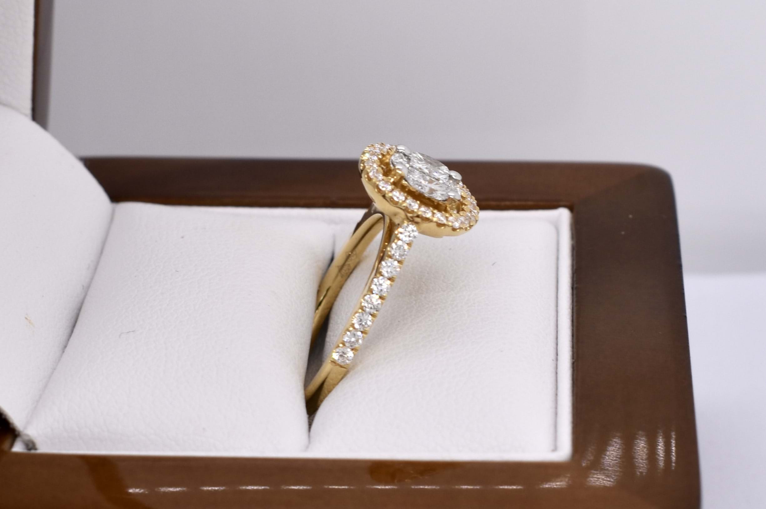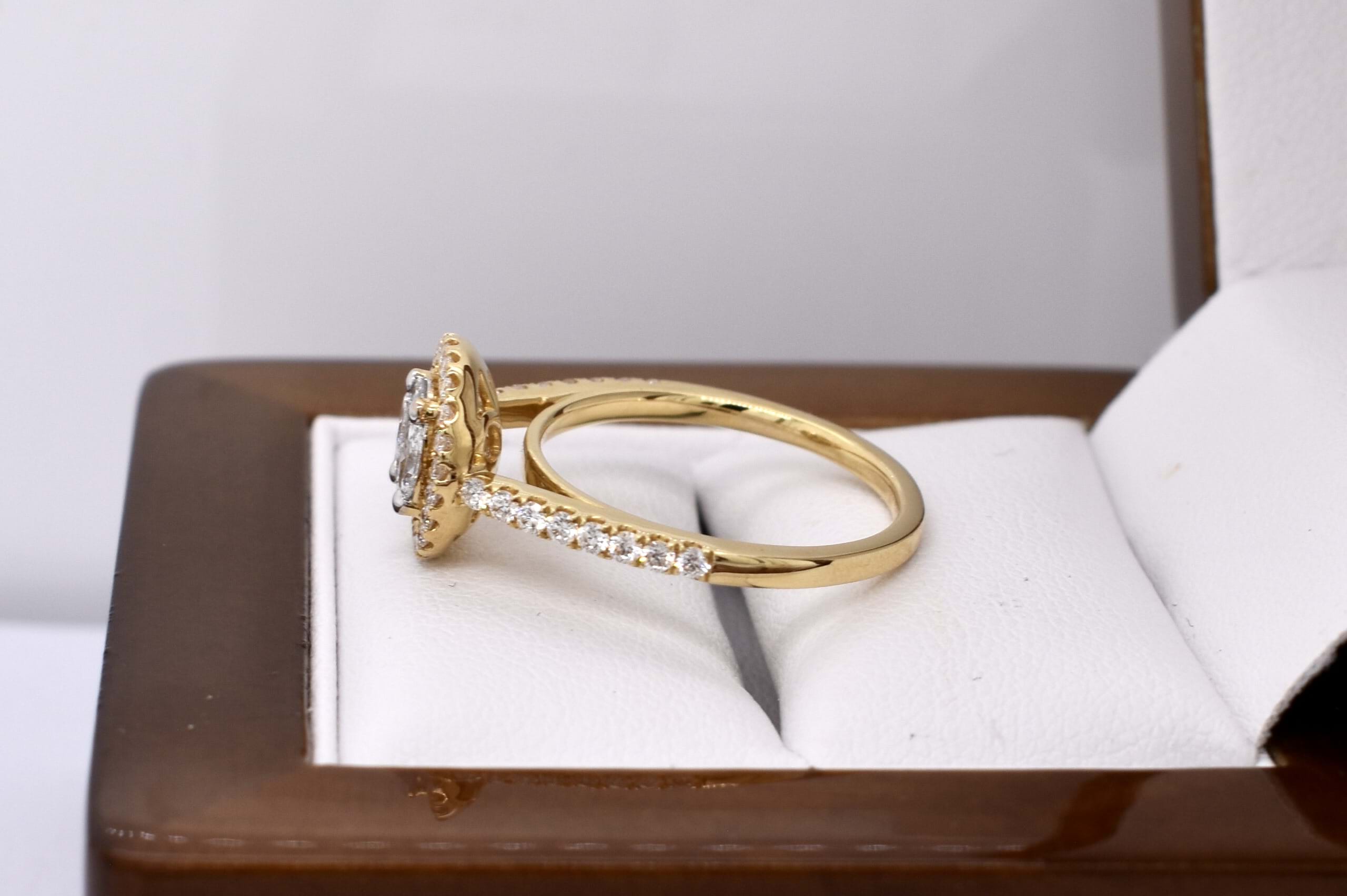 Sparkling and pretty 18ct yellow gold halo ring featuring a cluster of central diamonds to give the illusion of a single larger diamond. The cluster consists of two princess cut diamonds and four marquise cut diamonds totalling 0.28ct with a halo of shimmering round brilliant cut diamond and diamond set shoulders totalling 0.40ct FGVS-SI. This ring is designed to sit next to a wedding or stacking band. Finger size M+. Independent Valuation Supplied