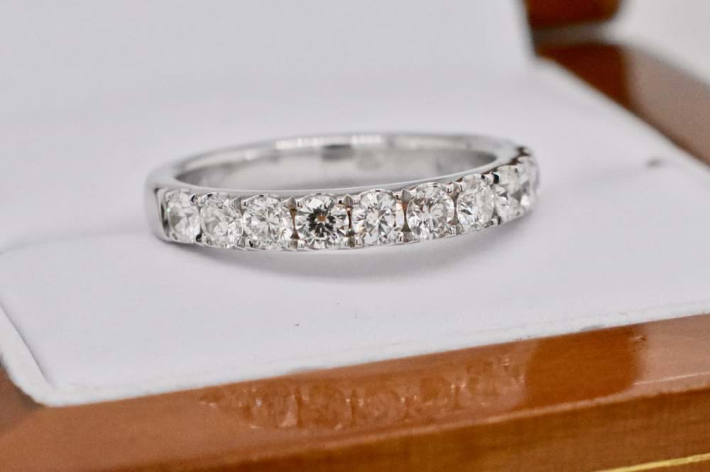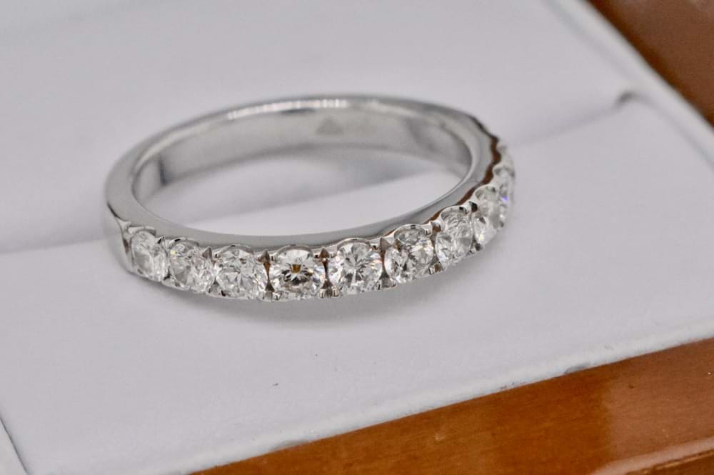 18ct white gold diamond band, ideal for a wedding, eternity or stacking ring. Featuring 11 round brilliant cut diamonds of excellent quality totalling 0.88cts cut down claw set in luxurious fitting white gold. Independent Valuation Supplied