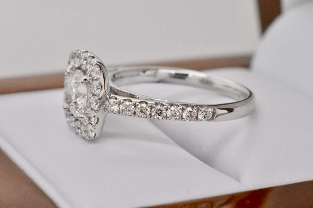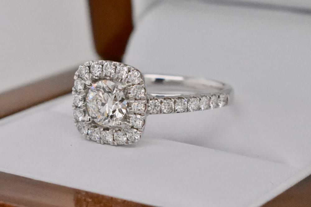 Hand selected in store this shimmering round brilliant cut diamond is 0.70cts (H/SI1) and has been certified by the GIA. Set into a snug cushion shape halo of glistening round brilliant cut diamonds (GH/SI) in 18ct white gold, this ring is designed to sit perfectly flat next to wedding bands. Total diamond content equals 1.36cts. Independent Valuation & GIA Cert Supplied