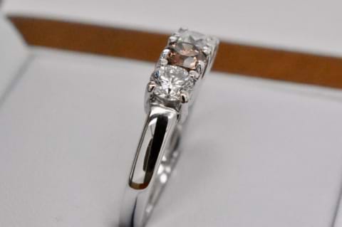 Featuring a striking 0.36ct cognac diamond (C7/SI) set in the centre and a shimmering white round brilliant cut diamond on each side (H/I SI2), this 18ct white gold trilogy ring makes a stunning dress or engagement ring. With the two white diamonds totalling 0.64cts. Independent Valuation Supplied