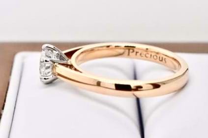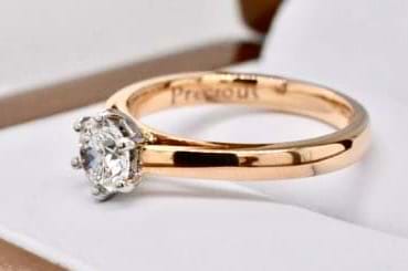 In 18ct rose gold, this classic 6 claw solitaire ring features a sparkling 0.70ct round Diamond. This diamond is an H colour and SI1 Clarity. Independent valuation supplied. Finger size M