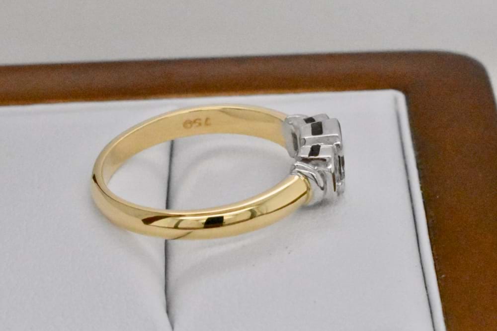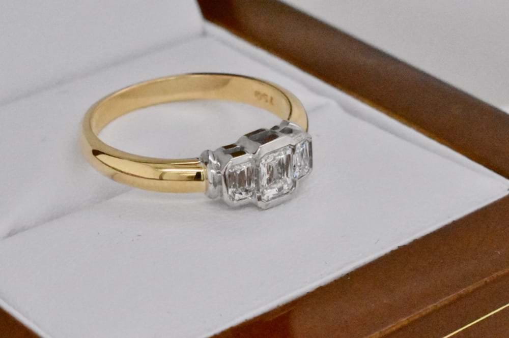 This lovely diamond engagement ring features a 0.35ct emerald cut diamond, white gold rub over set in the centre, with a graduated diamond on either side with a combined total of 0.30cts. Set into an 18ct yellow gold band, this ring looks beautiful when paired with wedding bands. Independent Valuation Supplied.