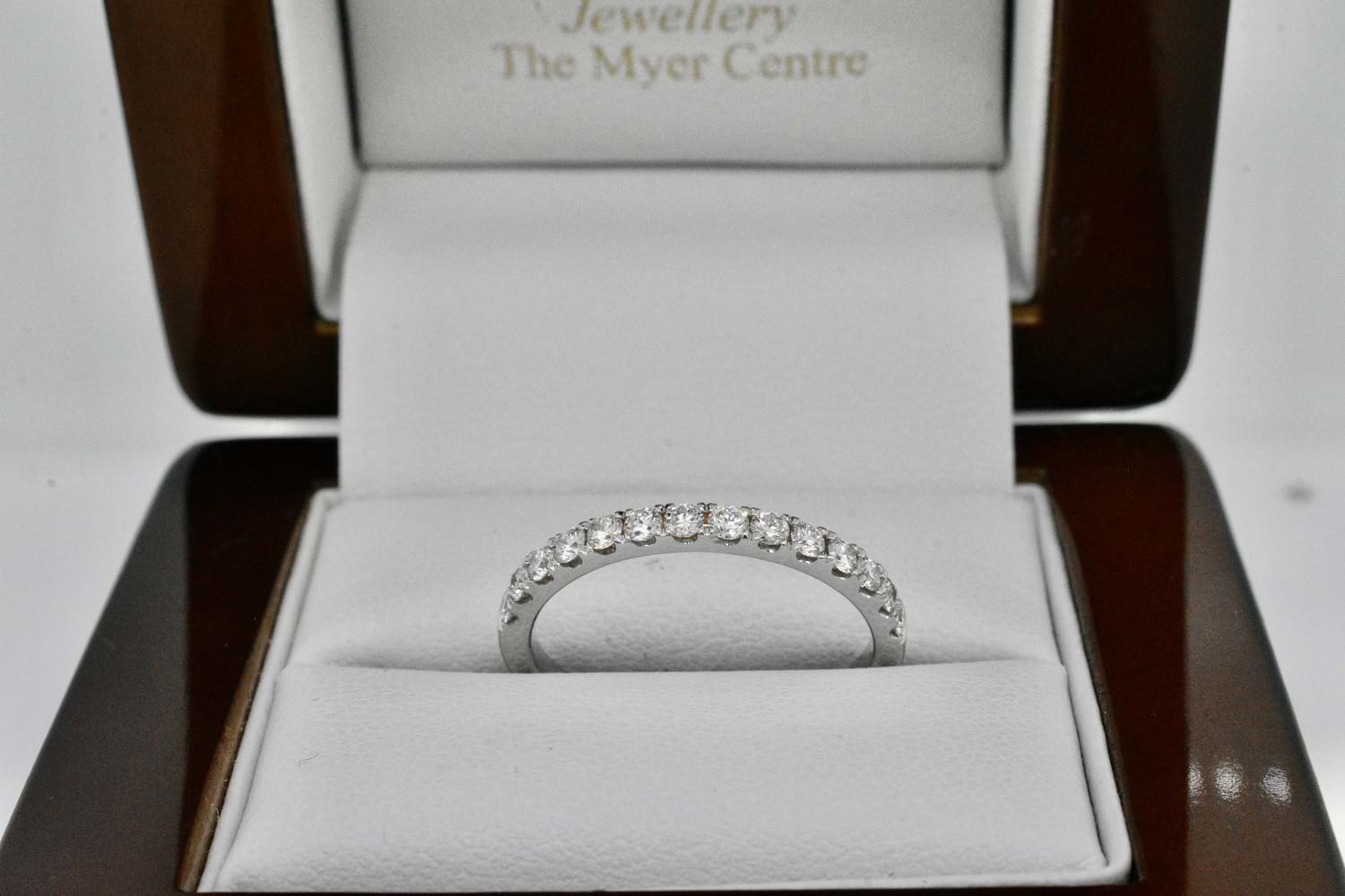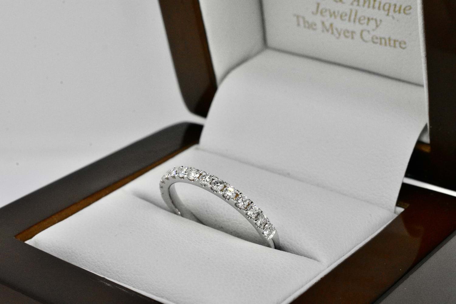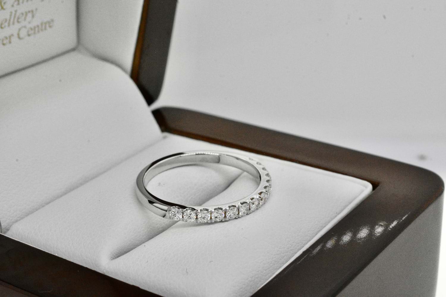 Classic and stunning 18ct white gold diamond band featuring 14 round brilliant cut diamonds cut down claw set totalling 0.40cts FGVS. Finger size N. Independent Valuation Supplied
