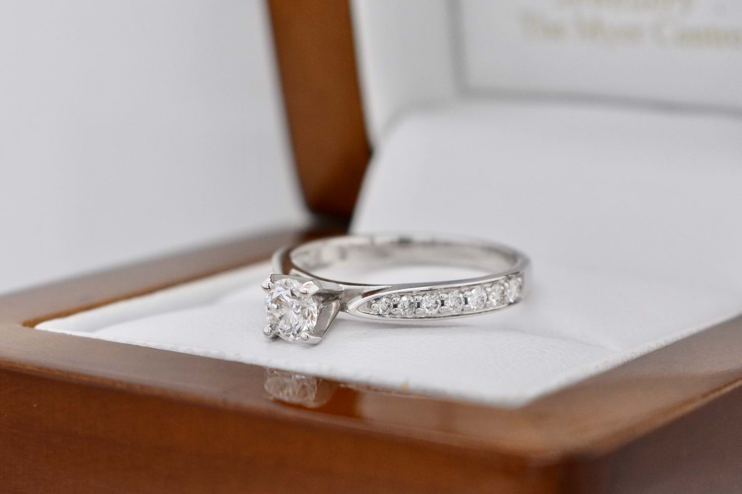18ct White Gold diamond engagement ring that is all about quality over quantity! Featuring a scintillating 0.40ct round brilliant cut diamond graded by the GIA as an E colour and SI1 clarity, claw set and flanked by winged shoulders grain set with an additional seven diamonds in each shoulder. The total shoulder diamonds equal 0.37cts, H colour, SI clarity, the ring is designed to sit perfectly with a wedding band-with a matching diamond band (20285630) available for separate purchase. Independent Valuation & GIA Cert supplied. Finger size N
