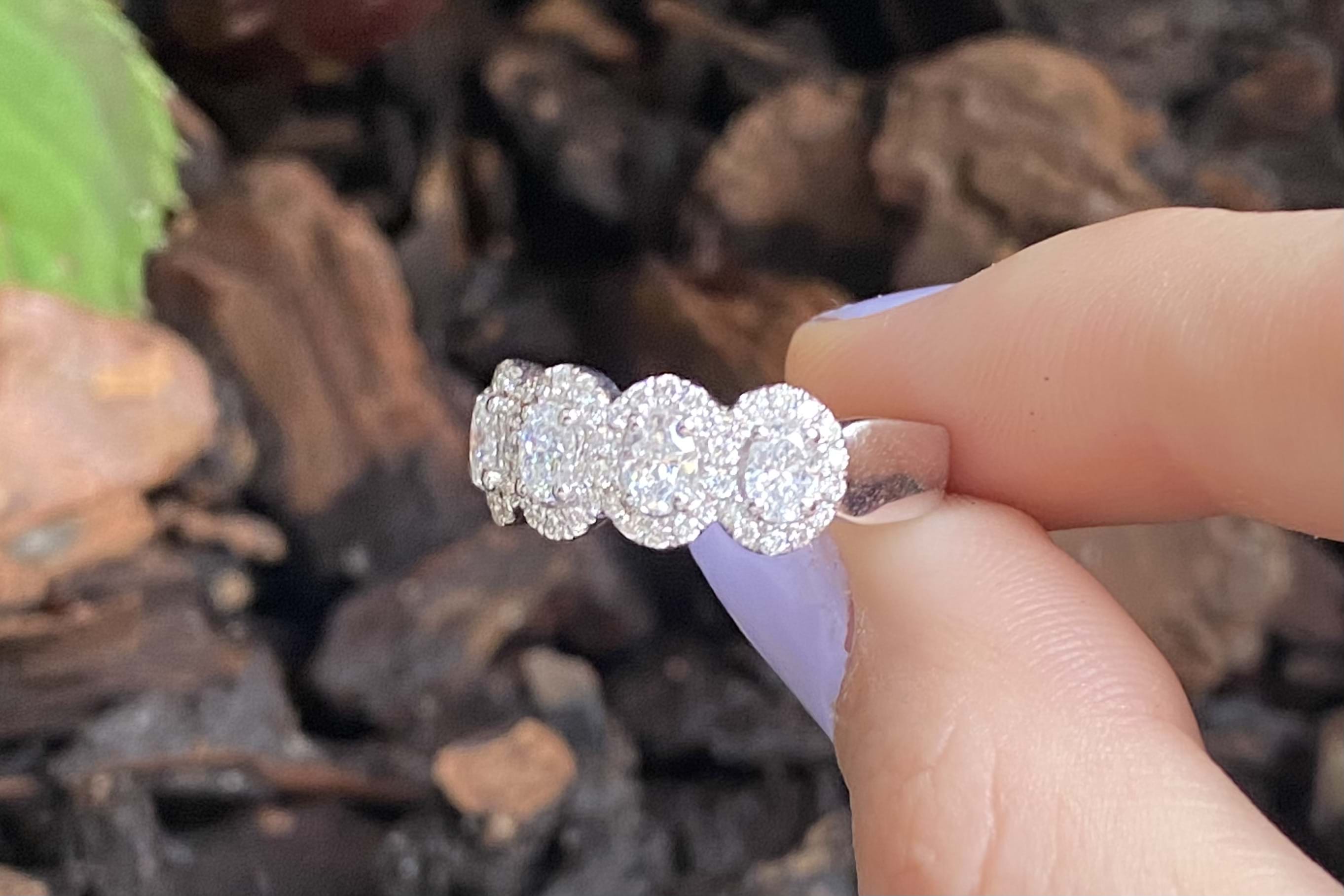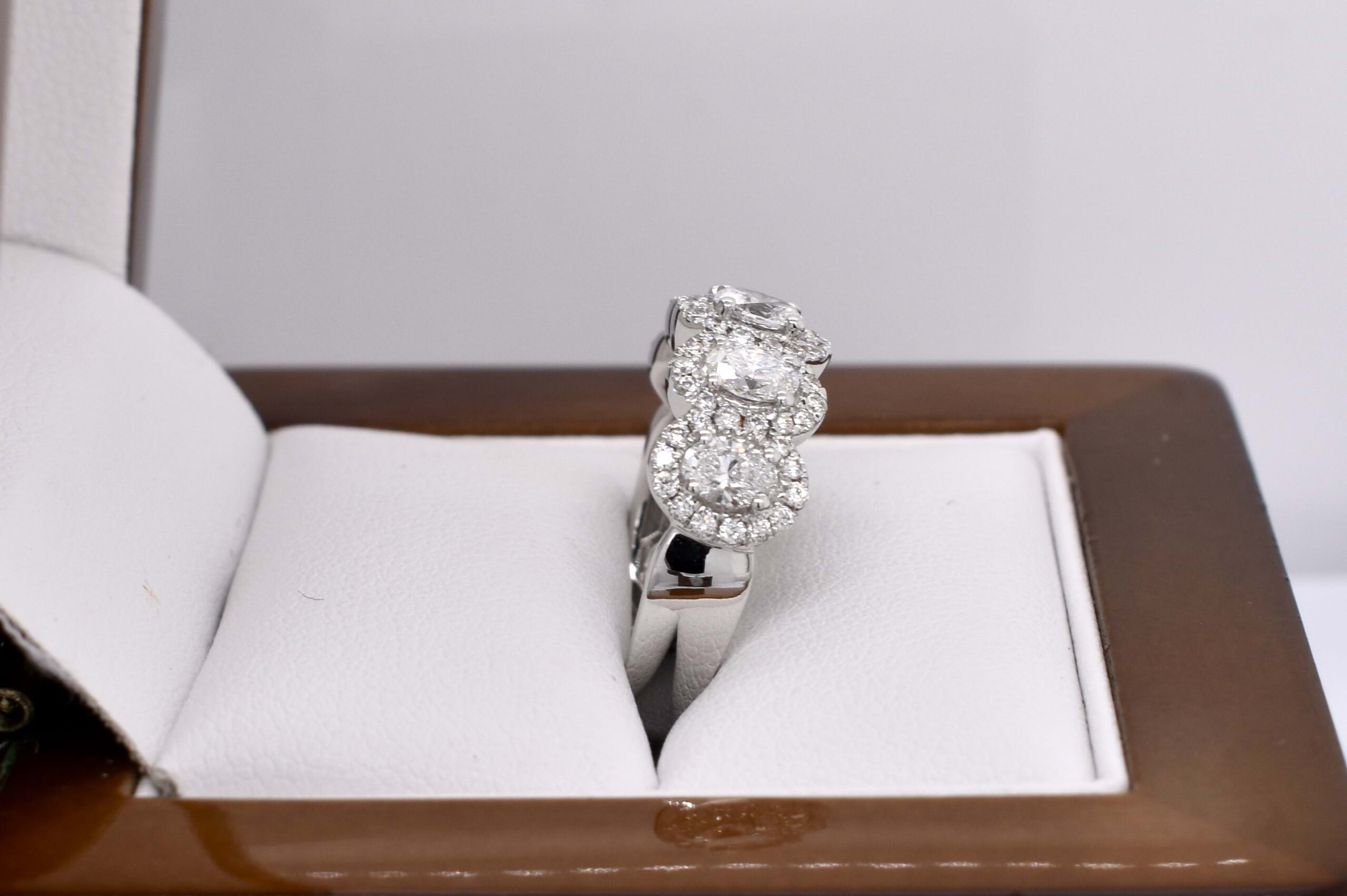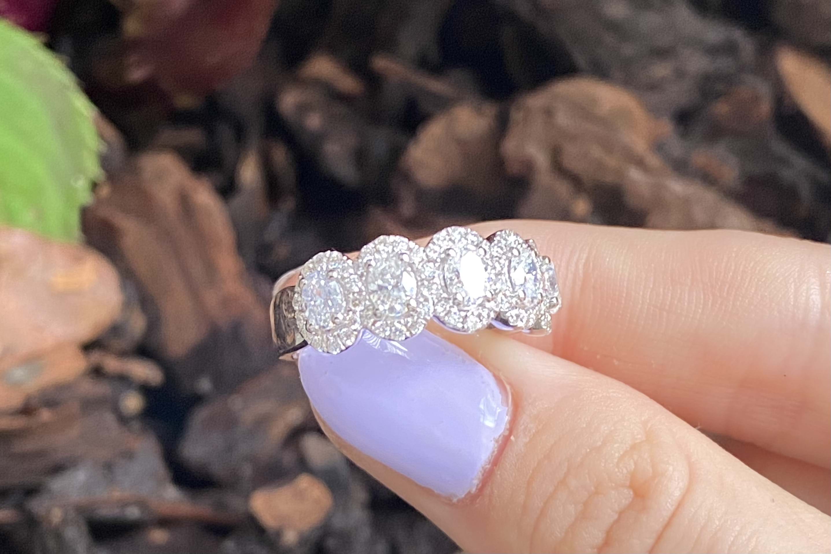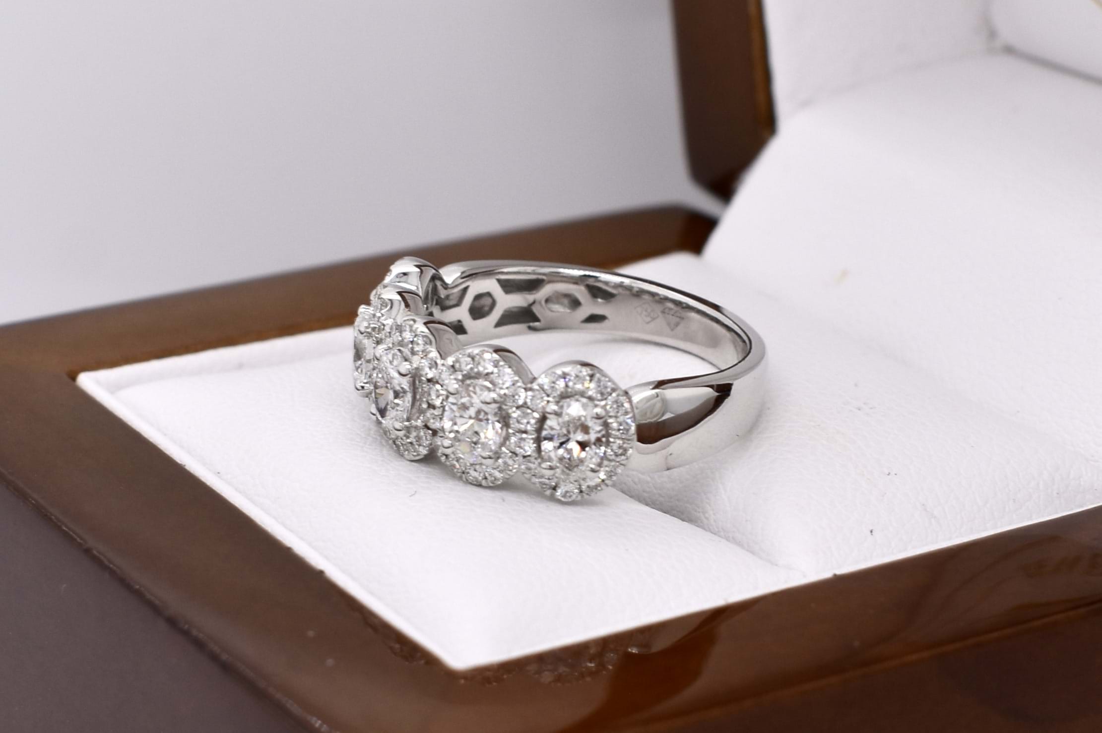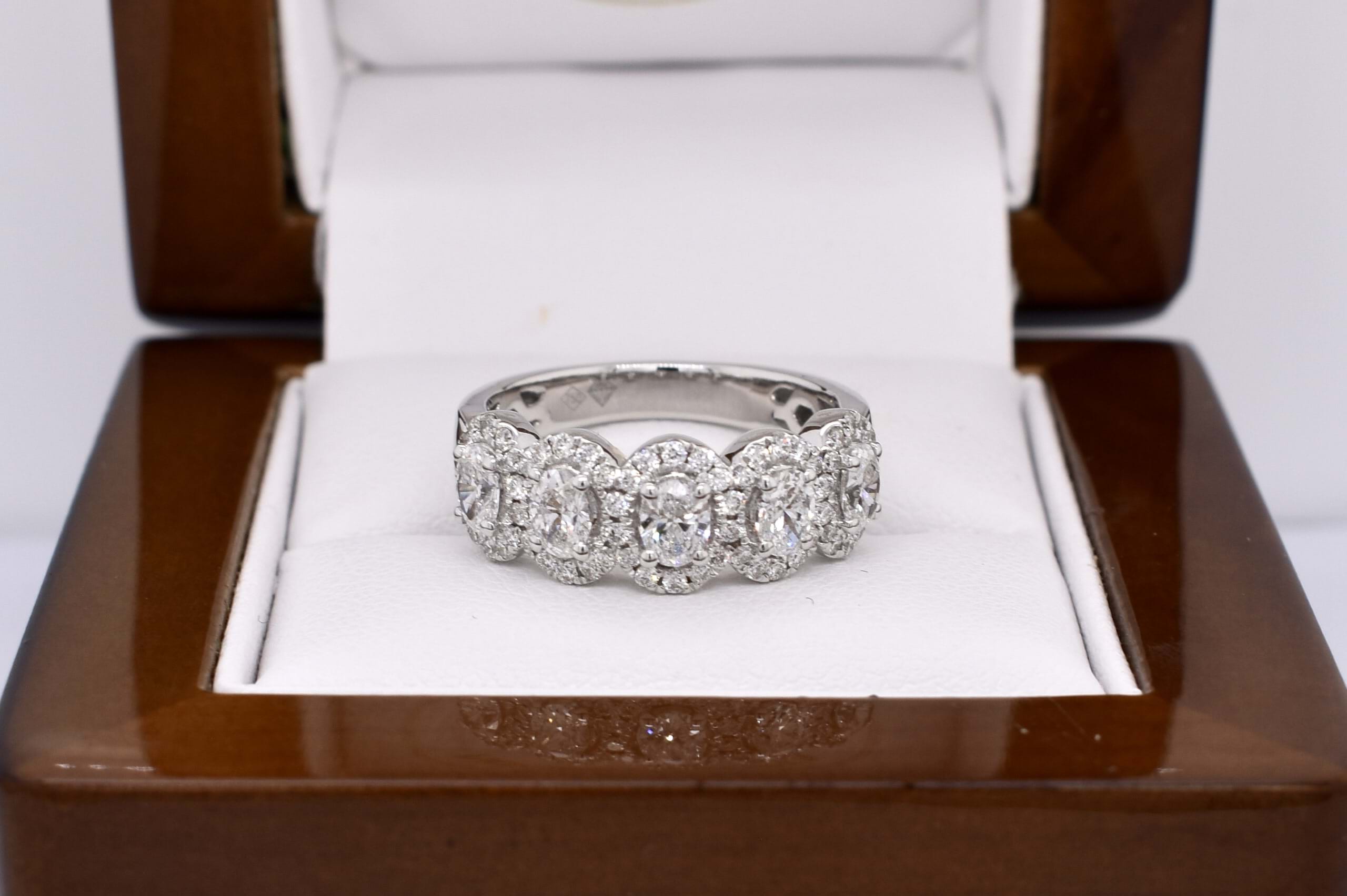 This gorgeous modern take on a five stone ring features five shimmering oval cut diamonds totalling 0.93ct FGVS-SI claw set across the finger with a halo of 62 sparkling round brilliant cut diamonds equalling 0.41cts FG/VS-SI. The ring is crafted in 18ct white gold and sits low on the hand, making it both practical and fabulous! Finger size M+ Independent Valuation Supplied