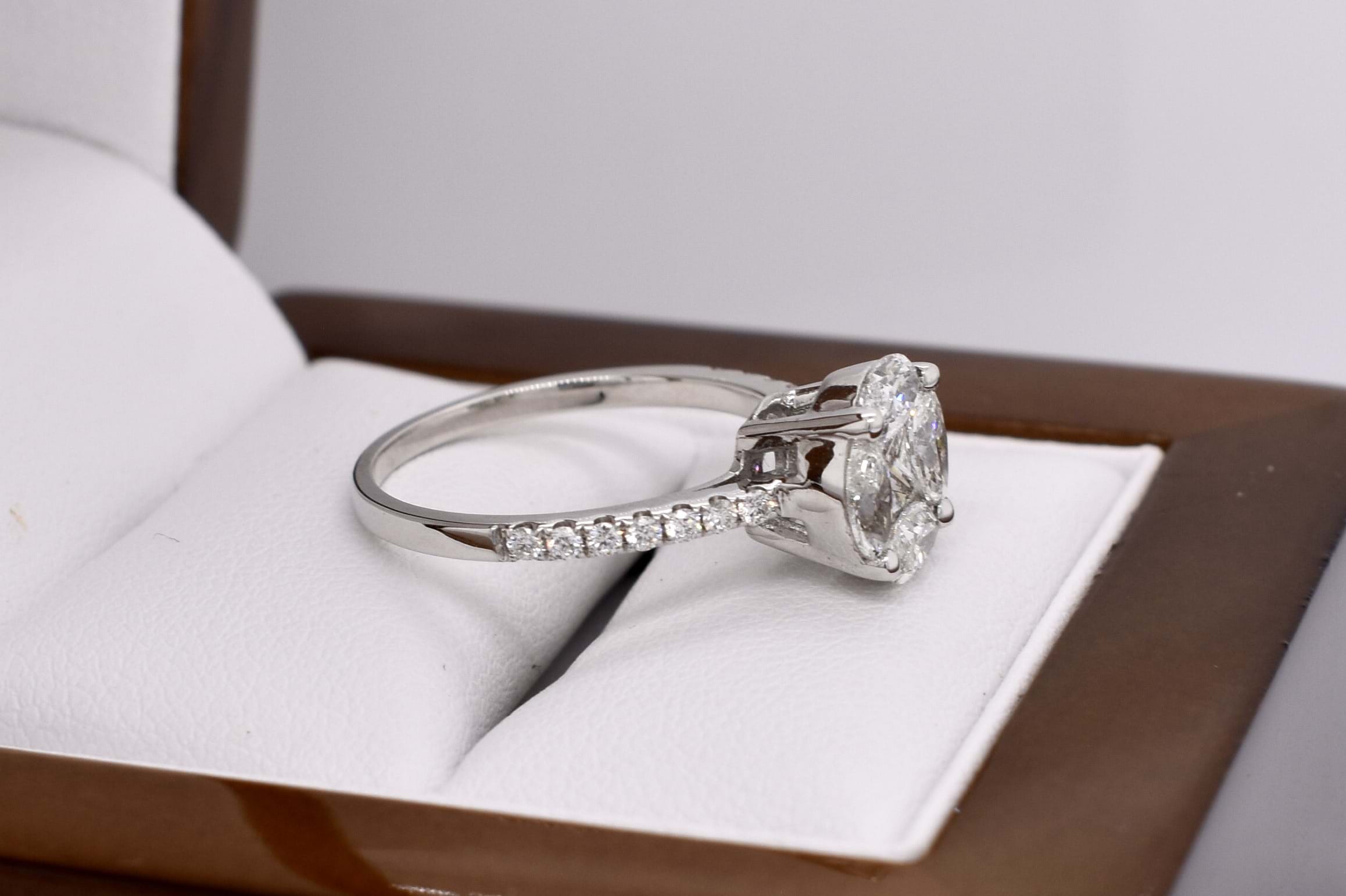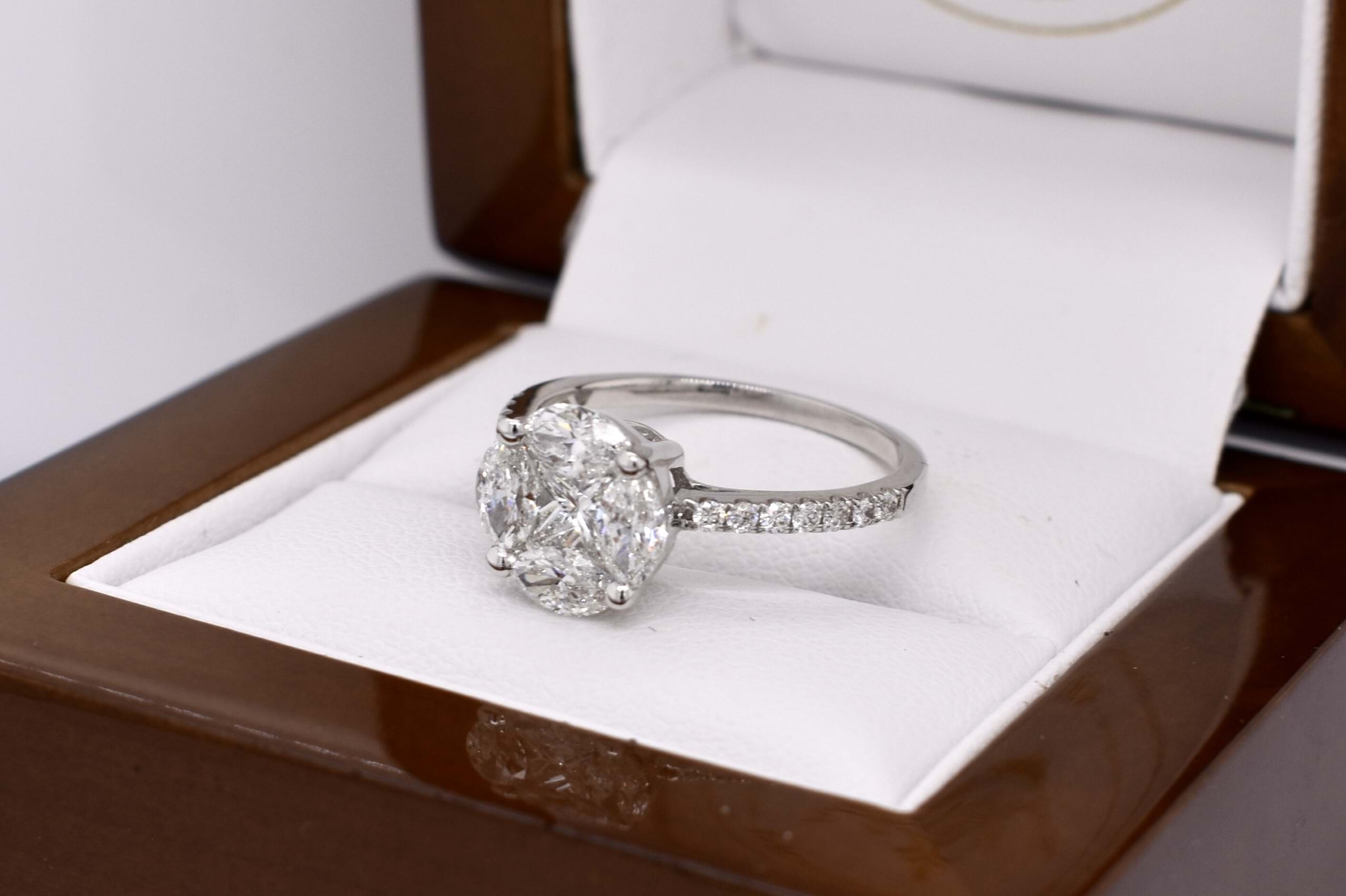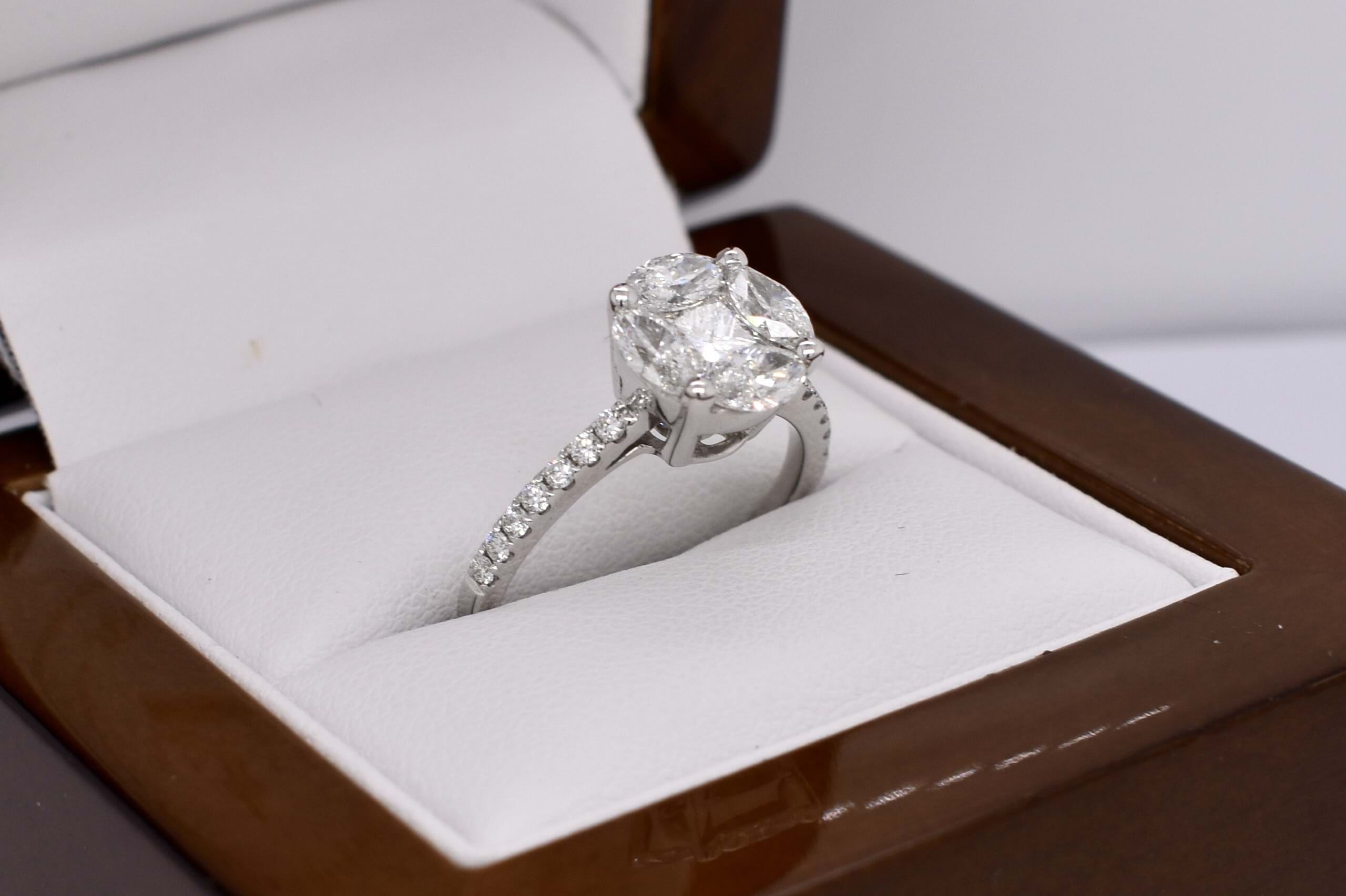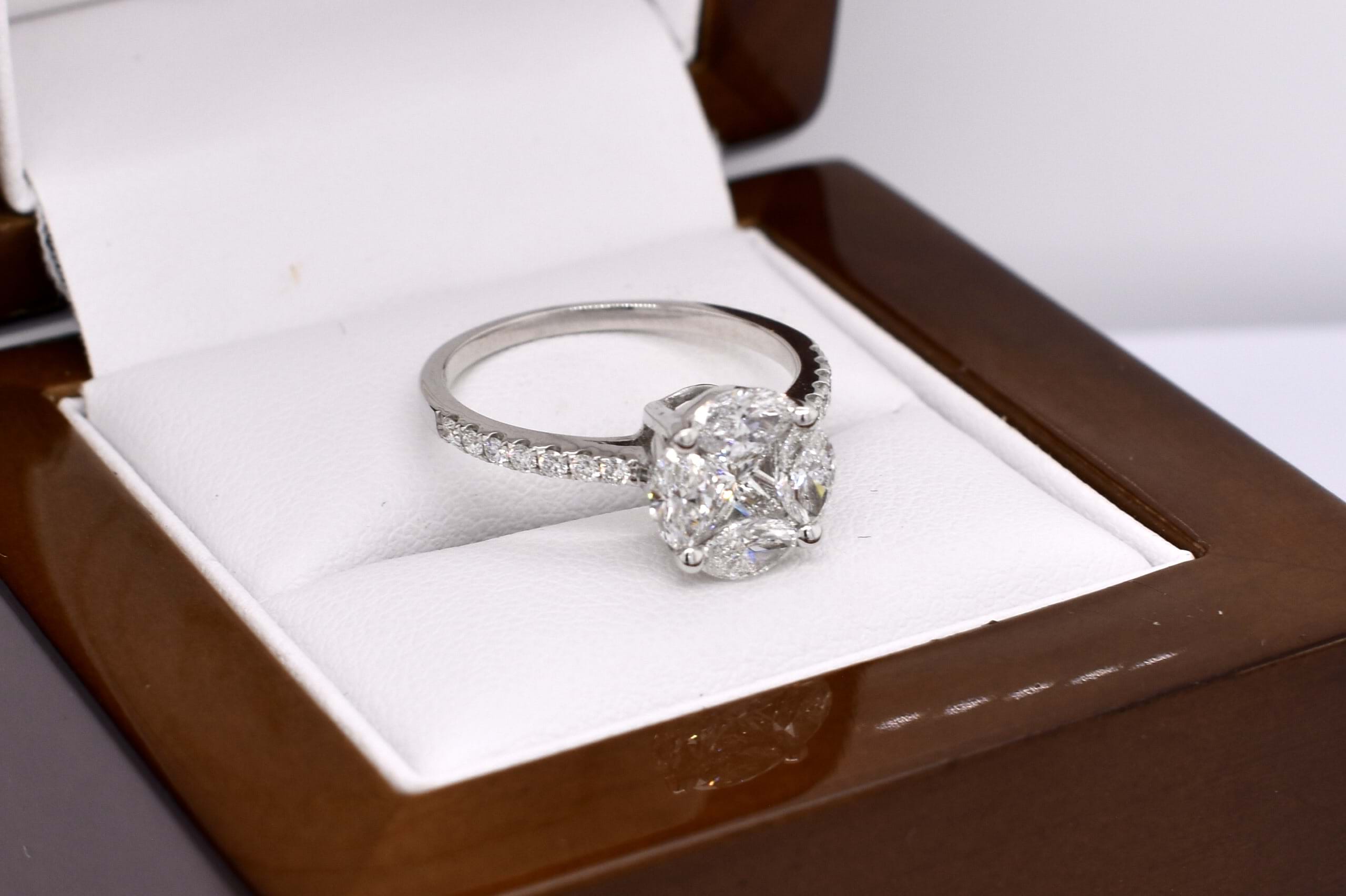 A beautiful 18ct white gold diamond ring crafted to give the illusion of a single 4ct round diamond with a total diamond content of 1.43ct. The illusion contains an invisible set 0.31ct princess cut diamond with four scintillating marquise diamonds totalling 0.94cts and a band set sparkling round diamonds equalling 0.18c FGVS-SI. Finger size N. Independent Valuation Supplied