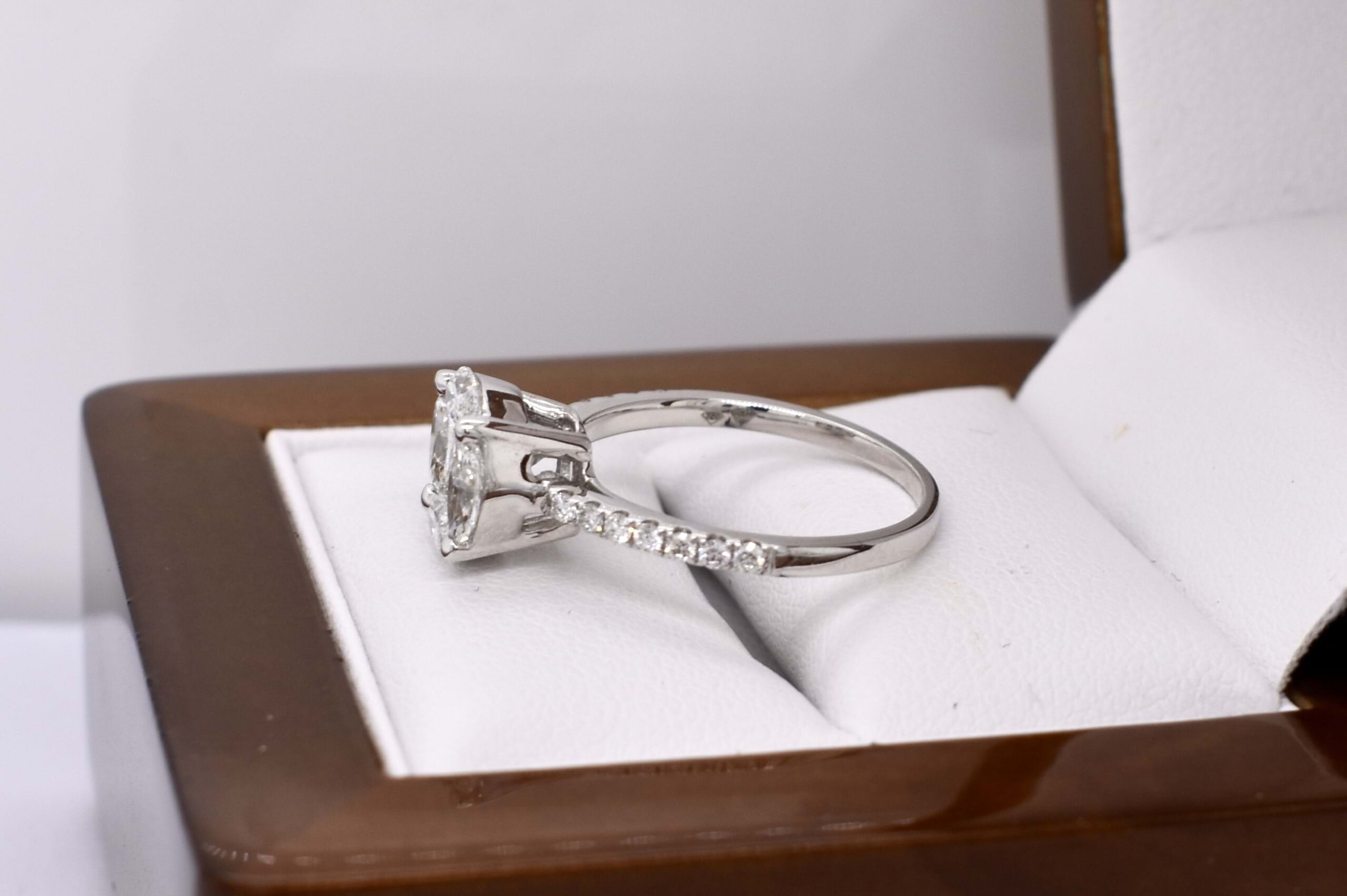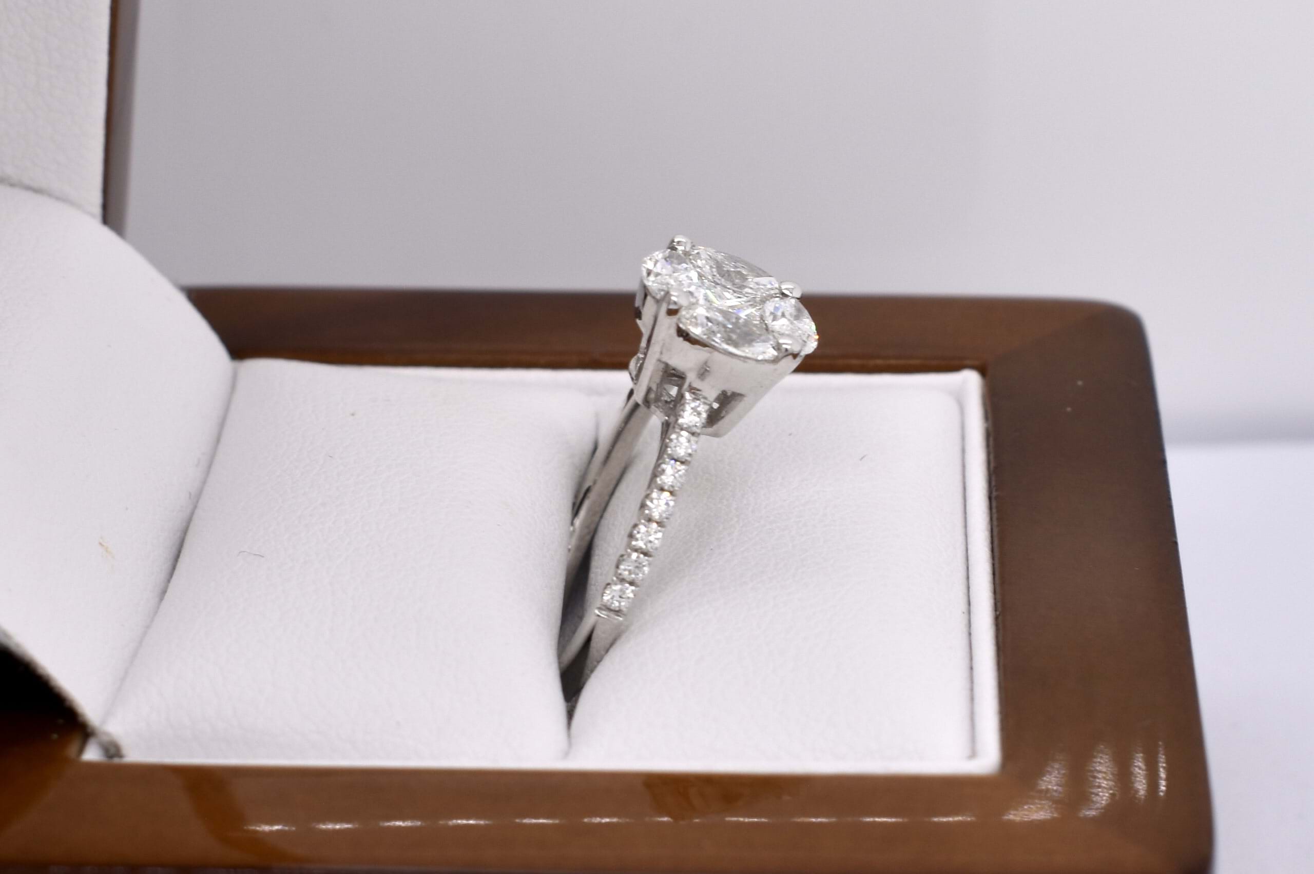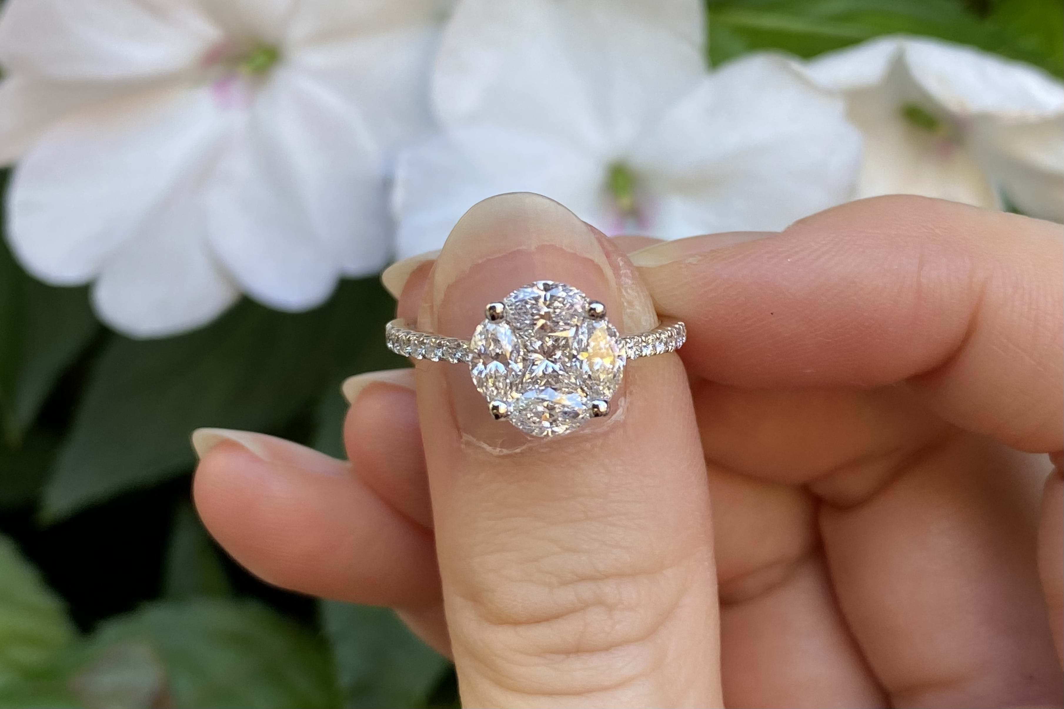 A beautiful 18ct white gold diamond ring crafted to give the illusion of a single 4ct round diamond with a total diamond content of 1.43ct. The illusion contains an invisible set 0.31ct princess cut diamond with four scintillating marquise diamonds totalling 0.94cts and a band set sparkling round diamonds equalling 0.18c FGVS-SI. Finger size N. Independent Valuation Supplied