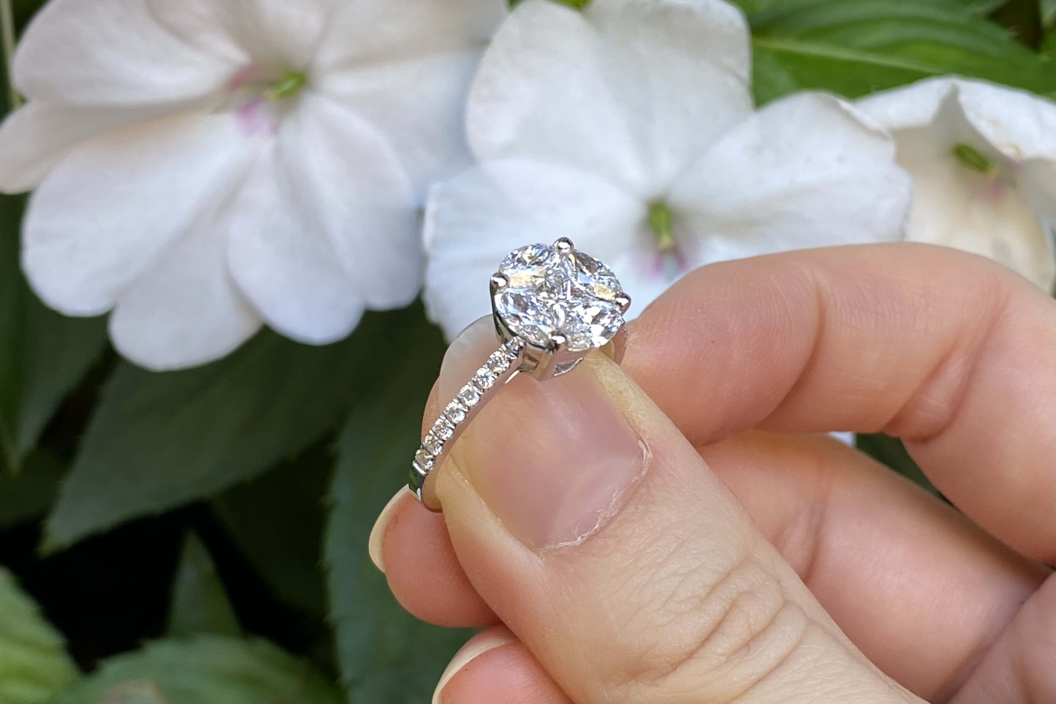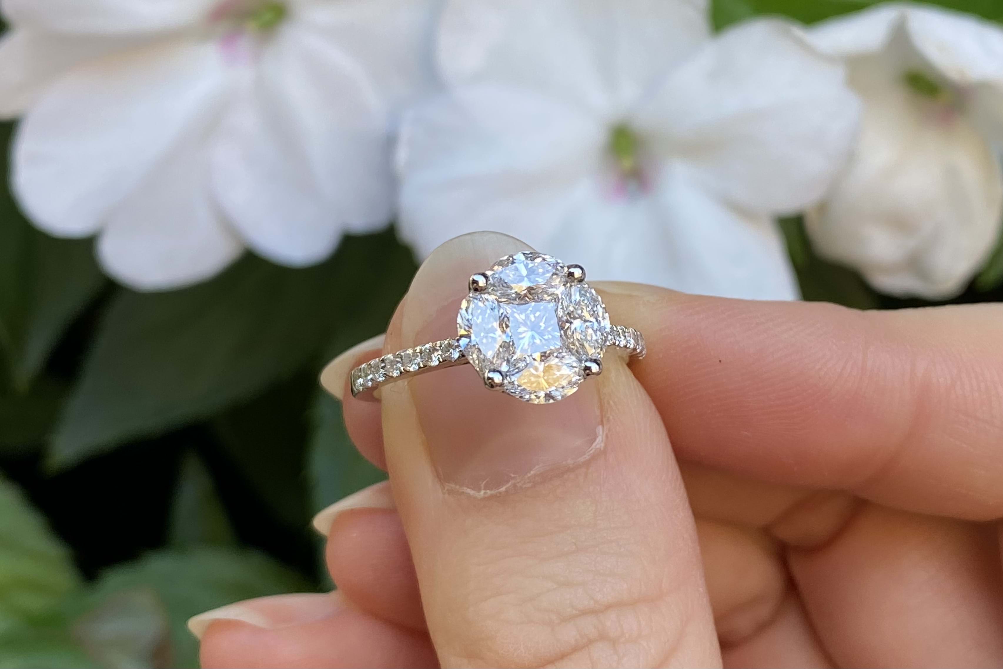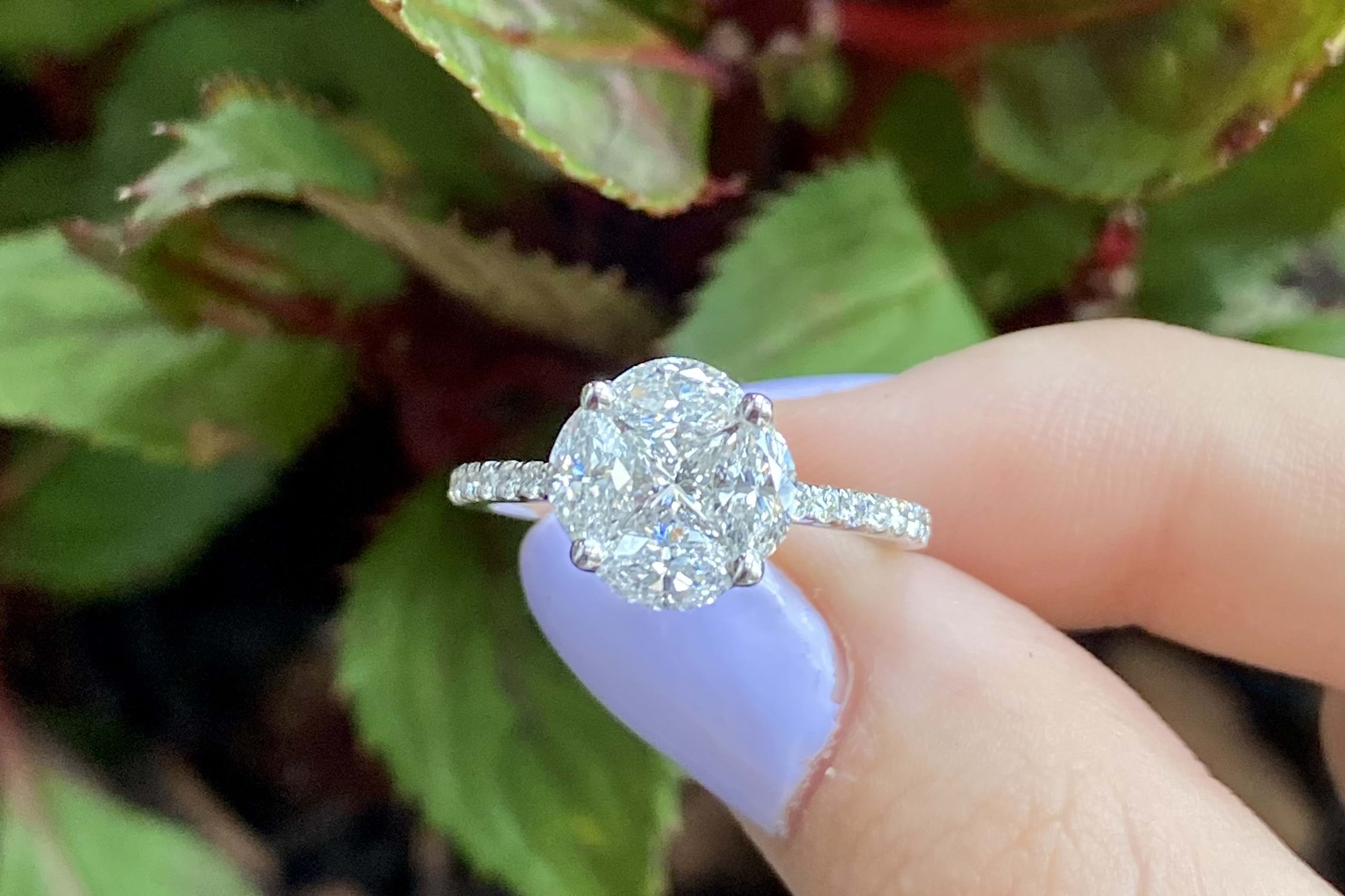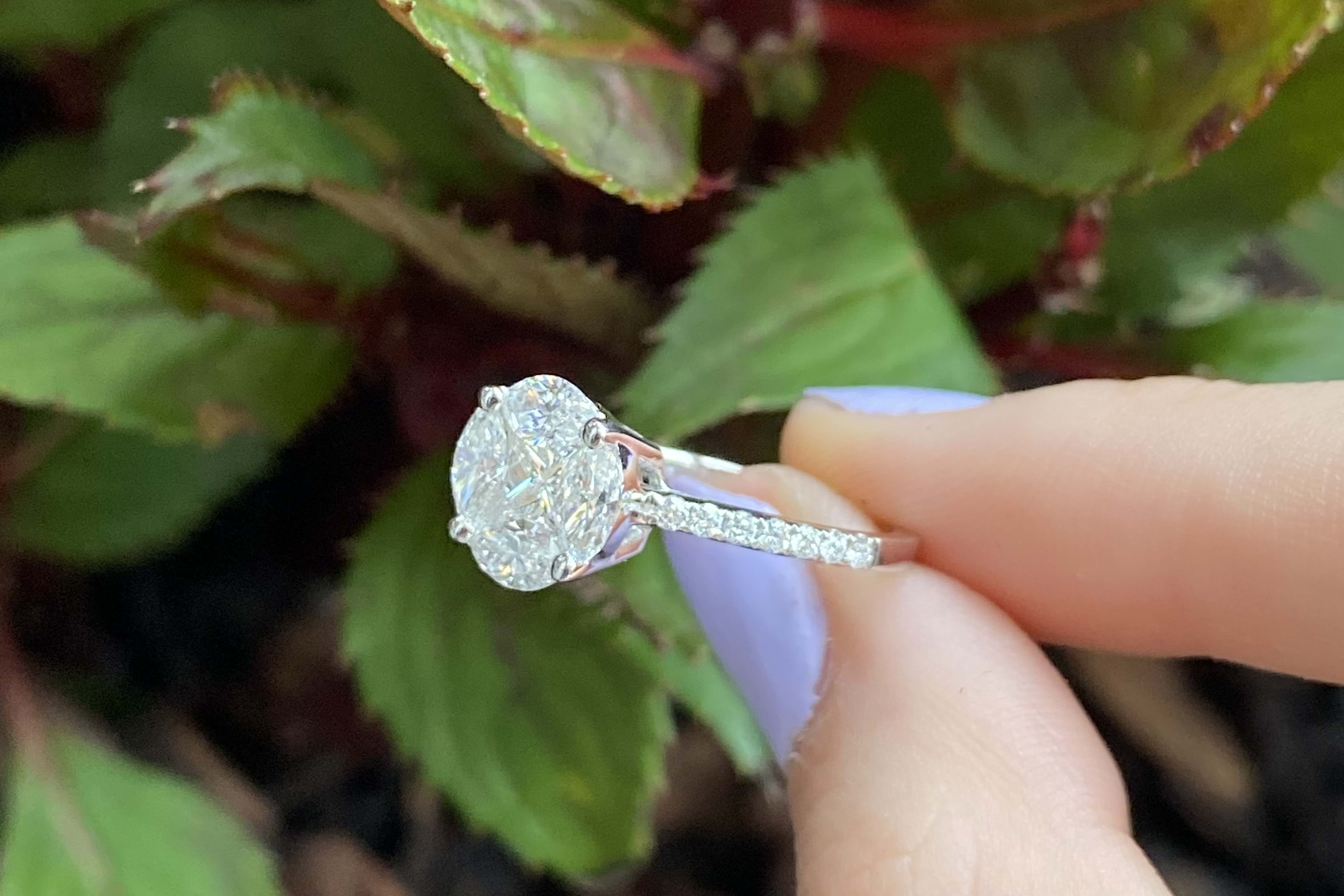 A beautiful 18ct white gold diamond ring crafted to give the illusion of a single 4ct round diamond with a total diamond content of 1.43ct. The illusion contains an invisible set 0.31ct princess cut diamond with four scintillating marquise diamonds totalling 0.94cts and a band set sparkling round diamonds equalling 0.18c FGVS-SI. Finger size N. Independent Valuation Supplied