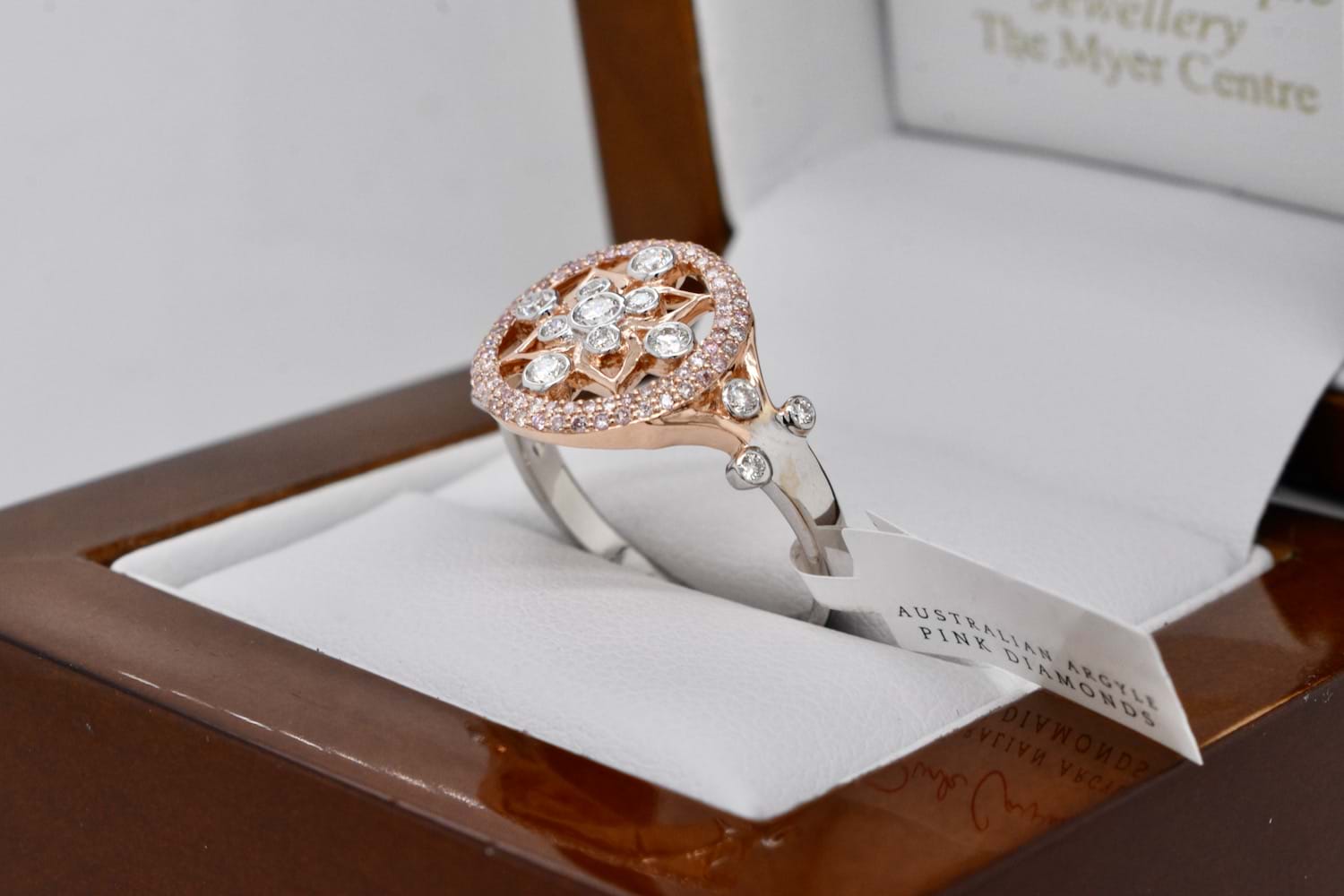 Beautiful 18ct white gold diamond dress ring with rose gold accents featuring 80 certified Argyle pink diamonds and 15 shimmering white diamonds set into an Art Deco inspired design with a fancy leaf style band. The ring contains a total of 80 pink diamonds equalling 0.16cts (Argyle lot number provided) LP-NCP/SI-P2 &15 white diamonds equalling 0.28cts FG/VS-SI. Size O. Independent Valuation Supplied