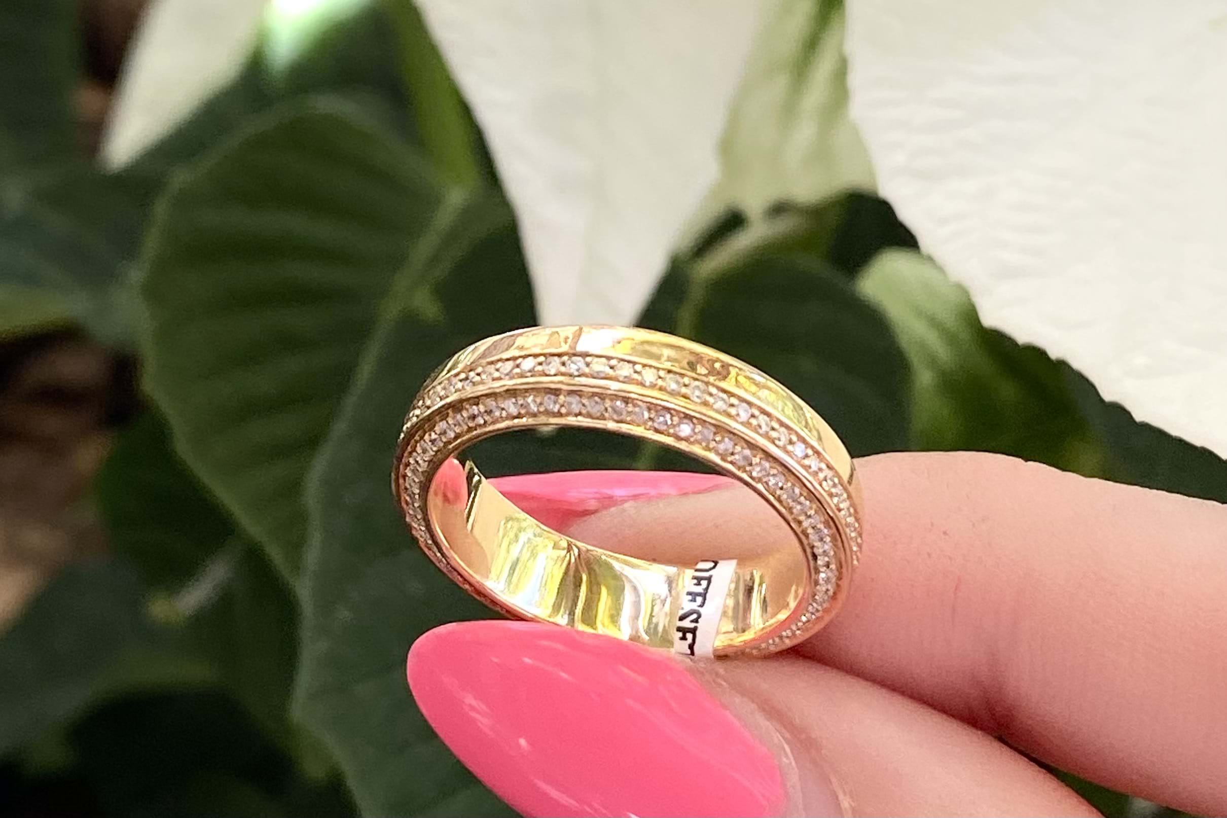 Elegant and stylish, this 18ct yellow gold ring measures 5mm wide and is set with two shimmering rows of round brilliant cut diamonds offset on one side, with bevelled edges. Total of 122 round brilliant cut diamonds equalling 0.37ct FG SI. 6.70 grams. Finger size M+.