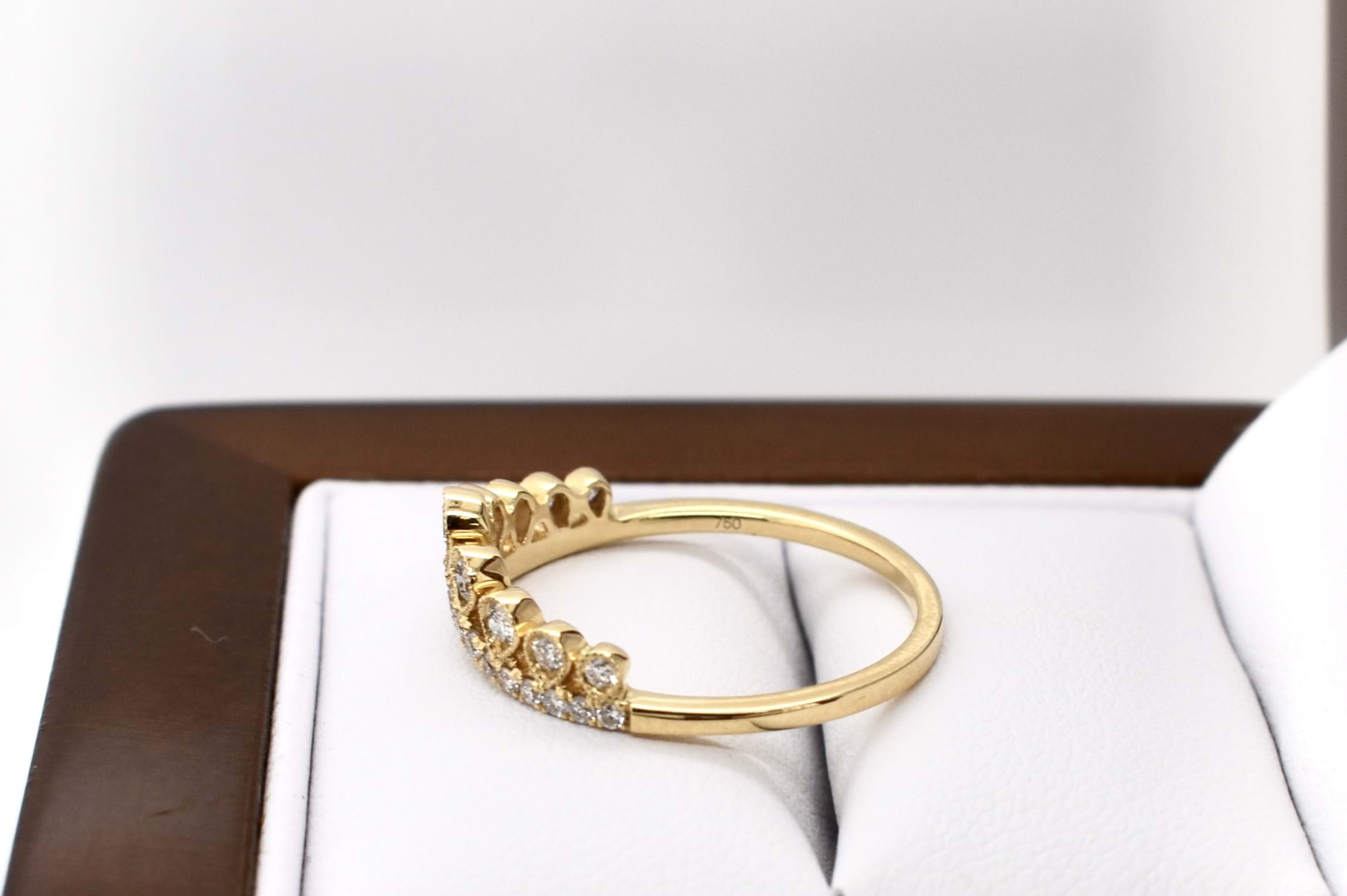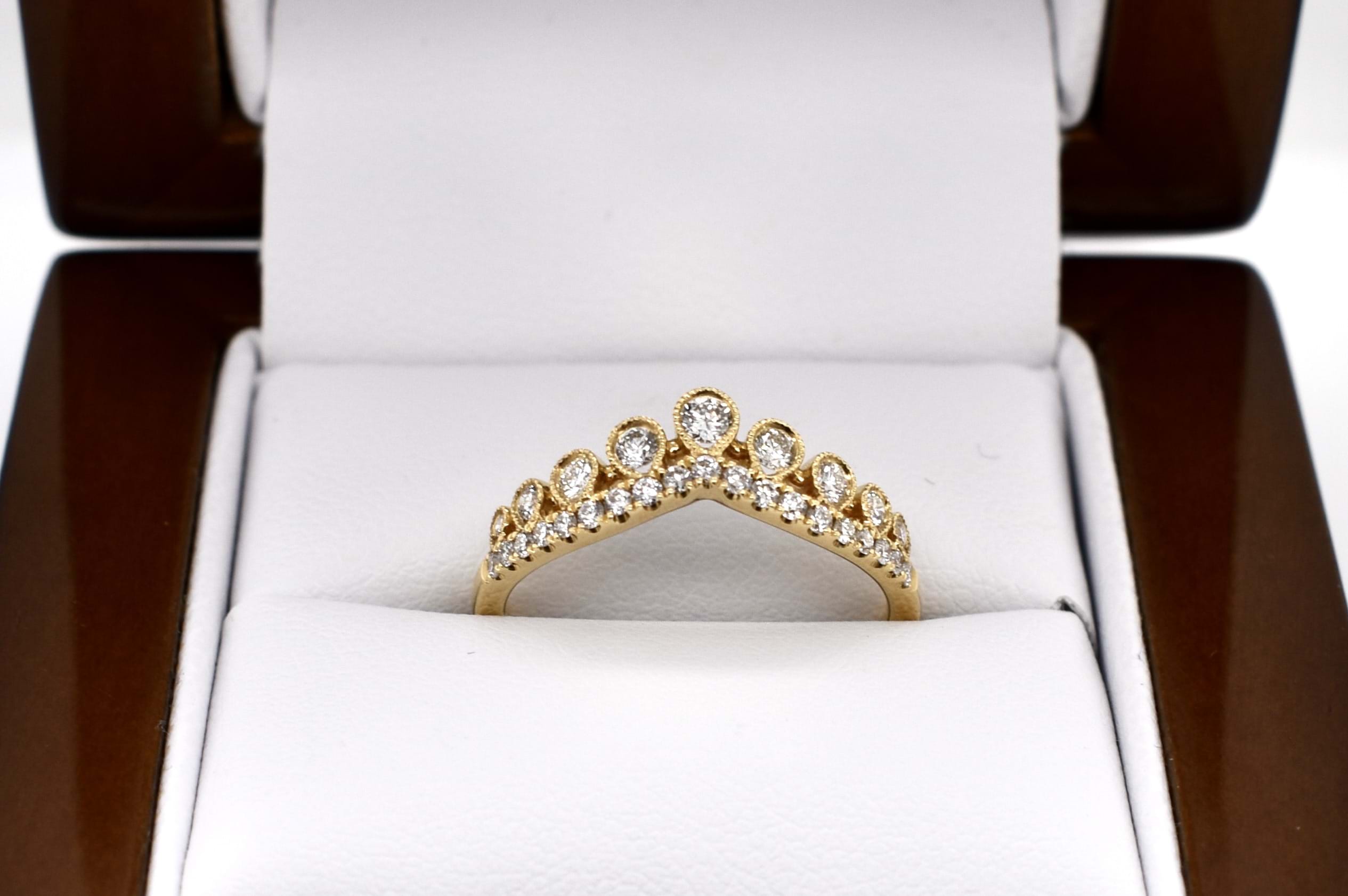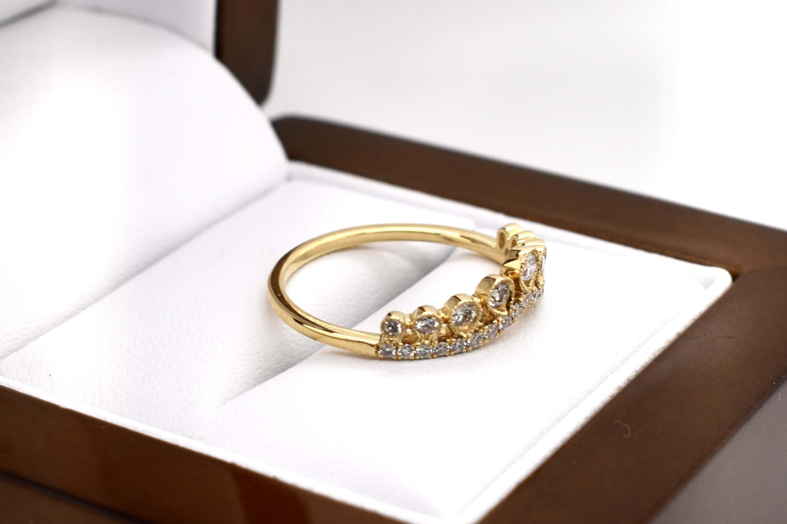 This pretty diamond ring makes a perfect dress ring or also works as a curved wedder or stacking band. Crafted in 18ct yellow gold the ring contains 28 shimmering round brilliant cut diamonds totalling 0.38ct (GVS-SI) in a tiara design. Finger size M. Independent Valuation Supplied