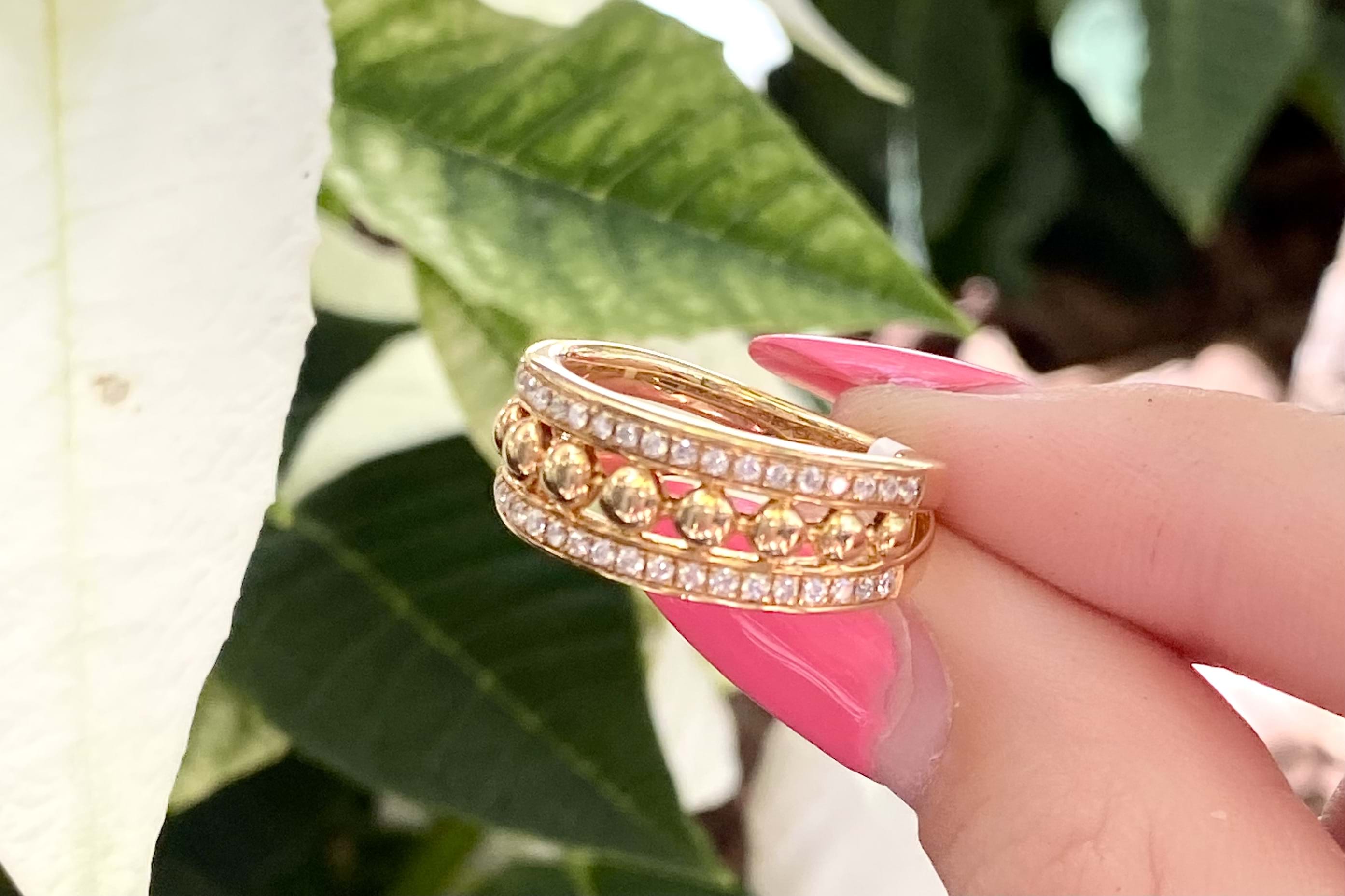 Crafted in 18ct yellow gold, this stunning wide band style ring features two outer rows of round brilliant cut diamonds, 50 grain set diamonds totalling 0.34ct FG SI1, with a beaded middle row of gold 'bubbles'. The wide band measures 8.00mm tapering to 3.45mm at the back. Finger size M+.