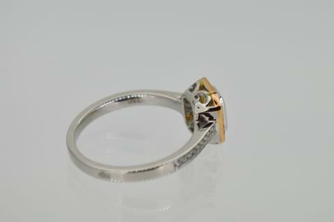 The epitome of elegance! This totally divine 0.44ct emerald cut F/VS diamond is bezel set in 18ct white gold and is beautifully contrasted by an 18ct rose gold halo of Argyle pink diamonds with shimmering white diamonds set down the shoulders. There are 24 round brilliant cut pink diamonds totalling 0.10cts (6-7PR) and 18 round briiliant cut white diamonds totalling 0.07cts (G/SI) making this an impressive engagement or dress ring. Independent Valuation and Argyle Lot Numbers Supplied. Finger size N