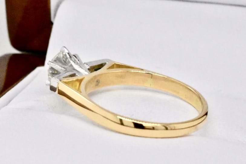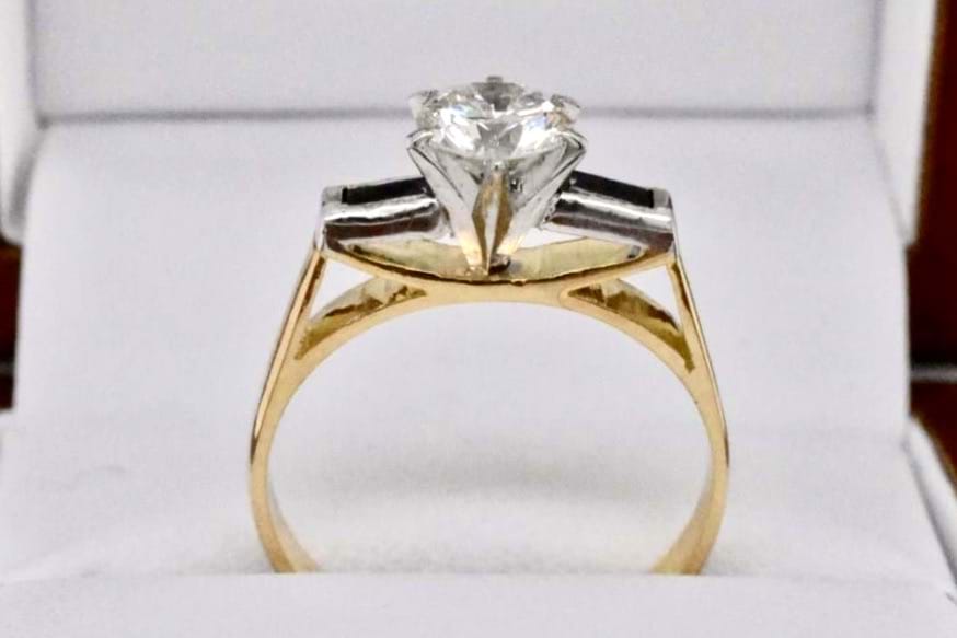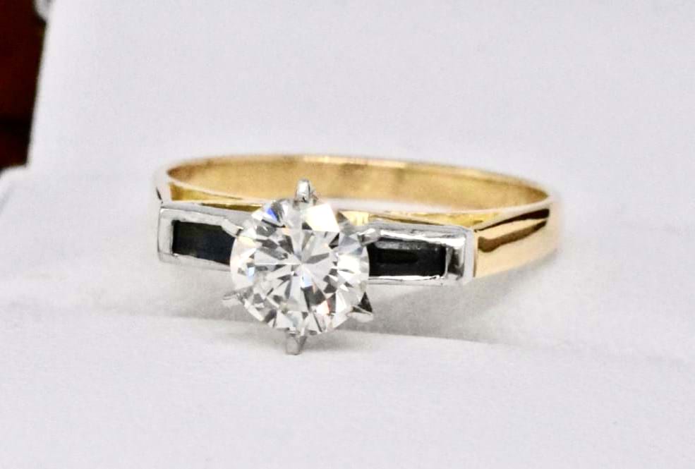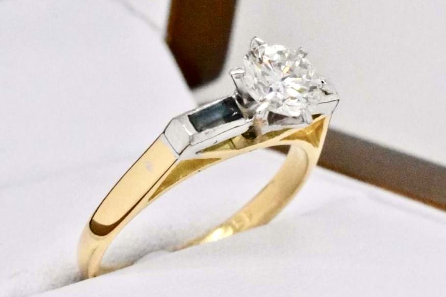 This vintage 18ct yellow and white gold ring features a scintilating 0.90ct round brilliant cut diamond (H/SI1), six prong set in the centre, and is flanked by a single baguette cut sapphire on each side in a white gold rub over. With a fantastic, geometric style, gallery this engagement ring is perfect for the girl who loves something vintage and unusual. Independent Valuation Supplied. Finger size P