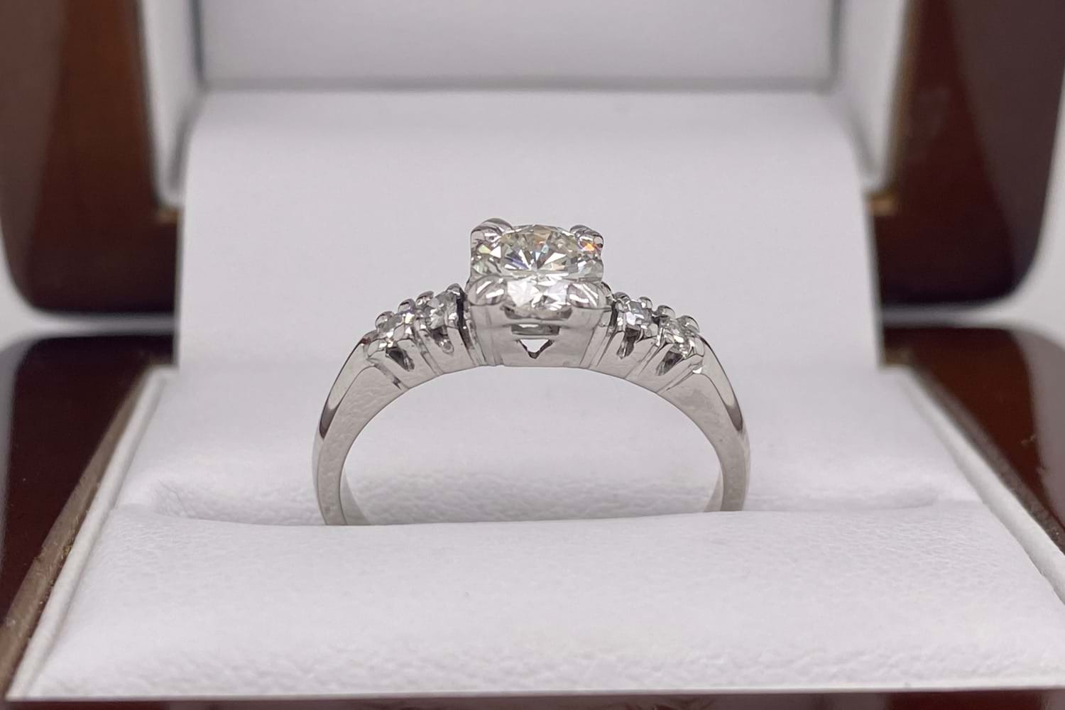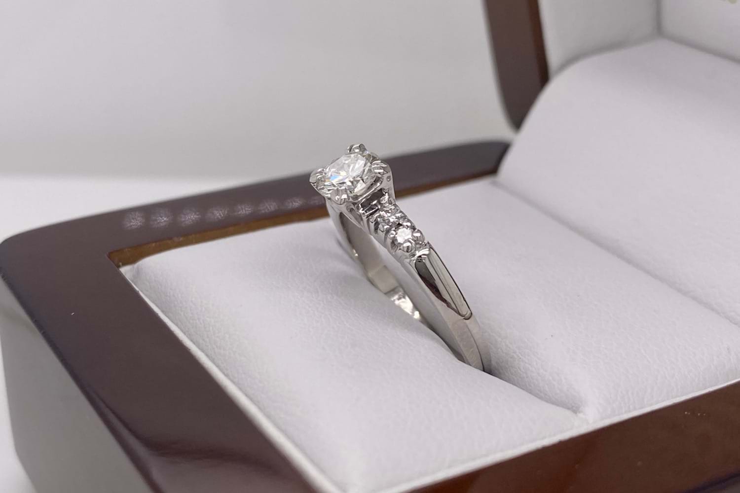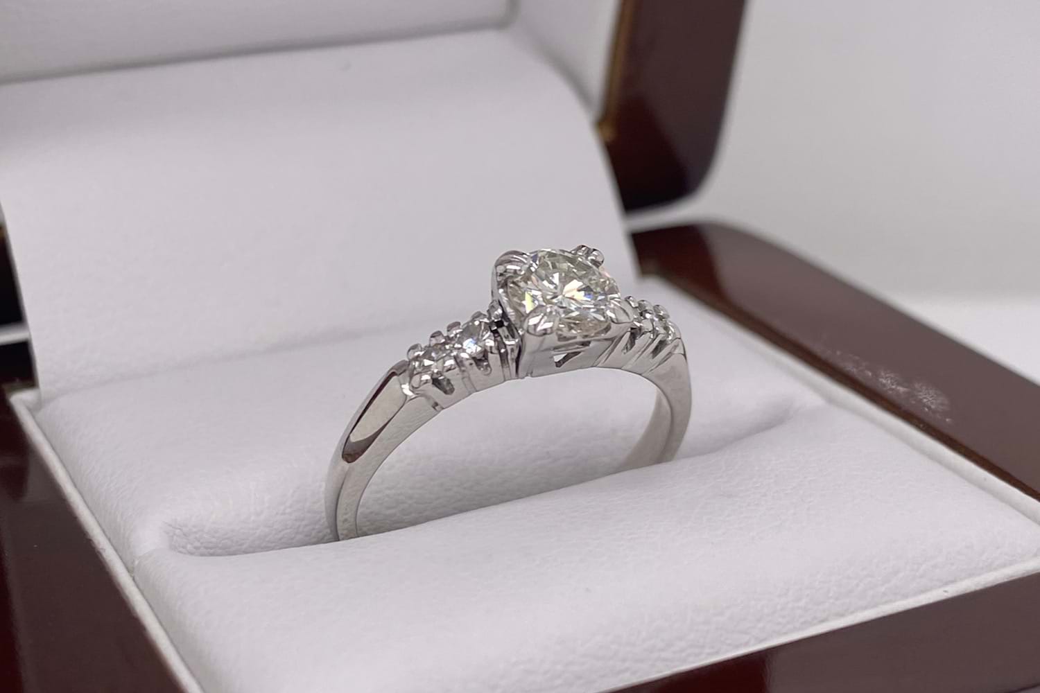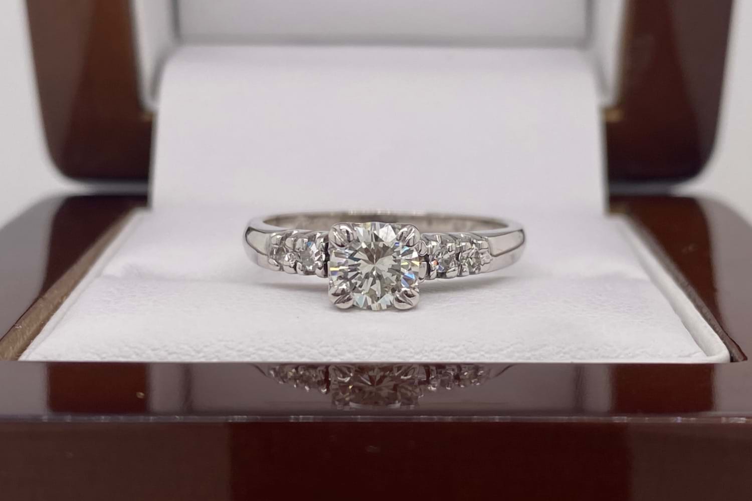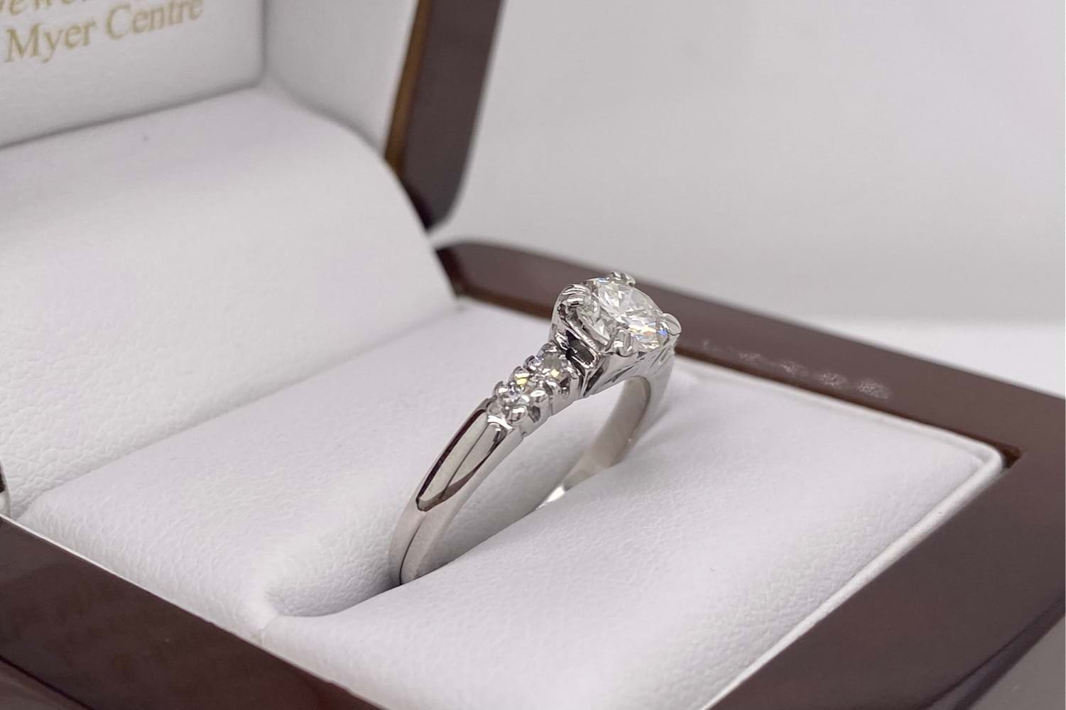A beautiful engagement or dress ring for vintage and antique style lovers! This 18ct white gold vintage diamond ring features a shimmering 0.55ct (I/VS2) round brilliant cut diamond grooved four claw set and flanked on each shoulder with two single cut diamonds claw set with a combined total of 4=0.08ct (I/VS). Great condition! Finger size M. Independent Valuation Supplied