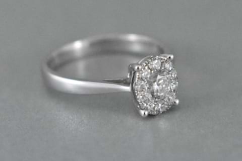 This 18ct white gold diamond ring features a sparkling 0.35ct round brilliant cut diamond surrounded by 10 smaller round brilliant cut diamonds equaling 0.20cts to give the illusion of a larger single oval diamond. Independent Valuation Supplied